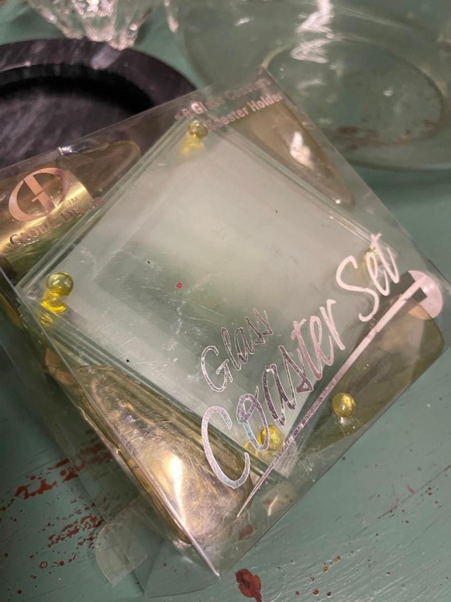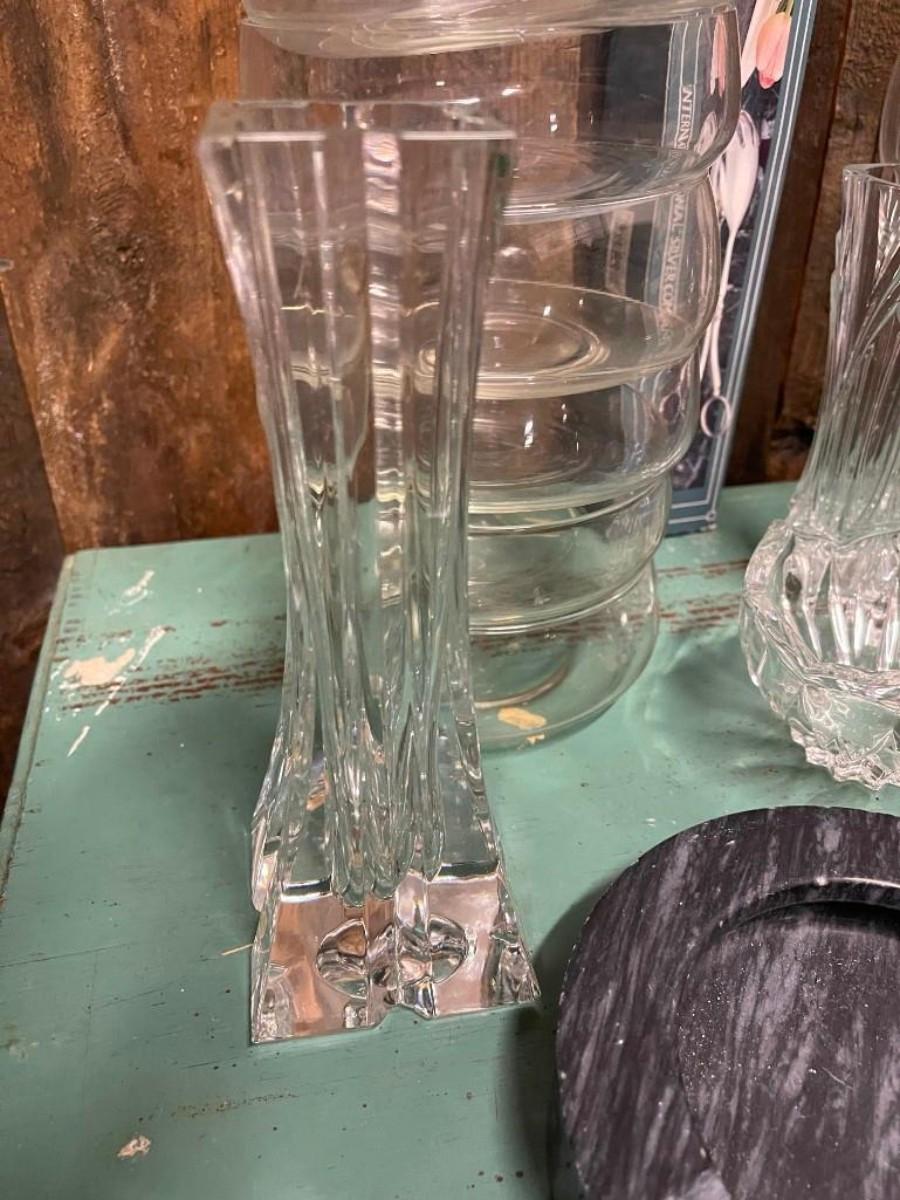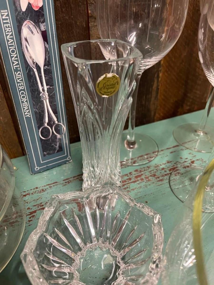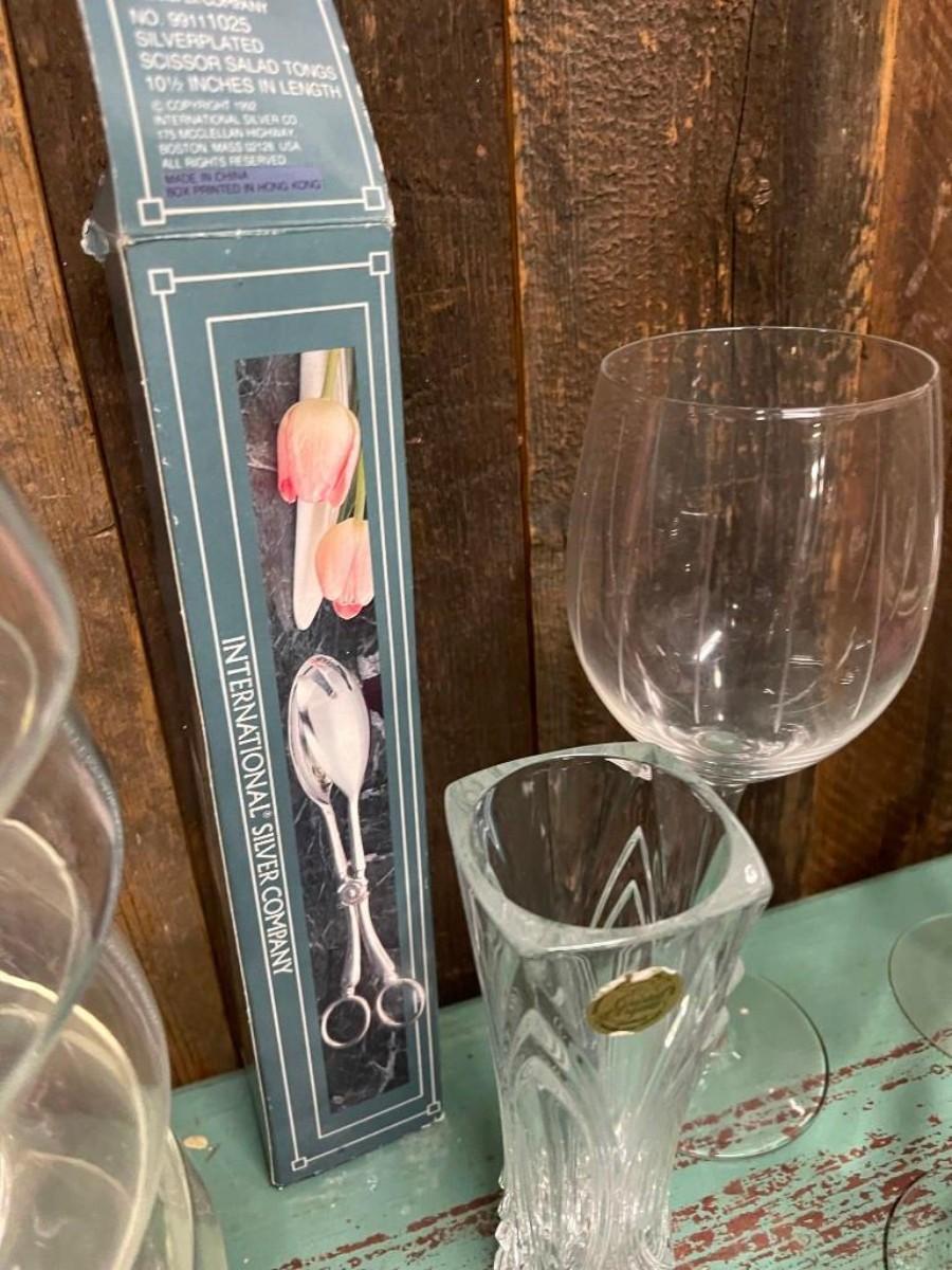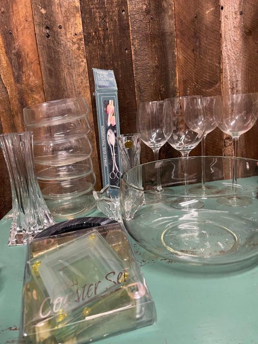 Lot of clear glass. Includes 2 different pairs of wine glasses (one is clear and the other is a pair of patterned glasses, all very pretty), a large clear bowl with 6 matching dessert bowls, a couple of vases, some silverplate tongs and a set of clear glass coasters.