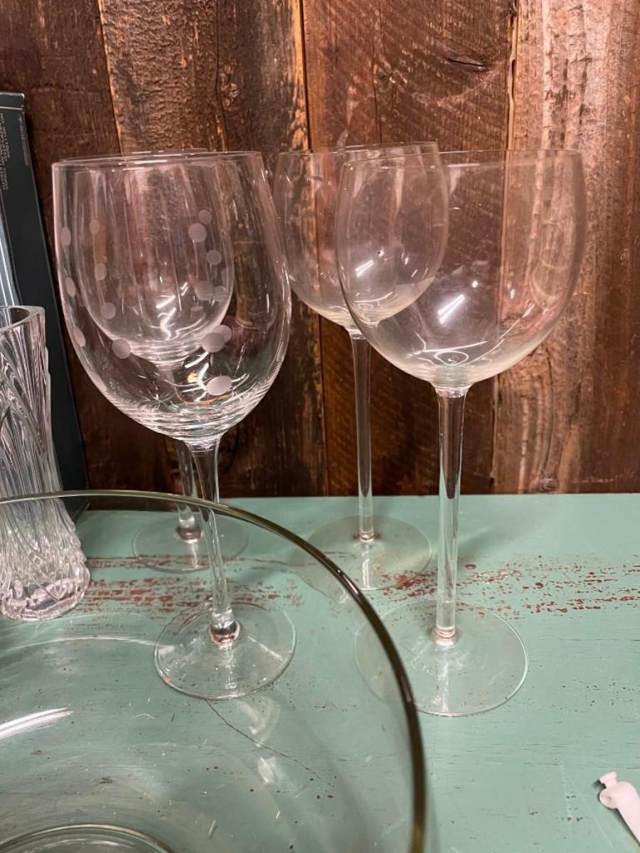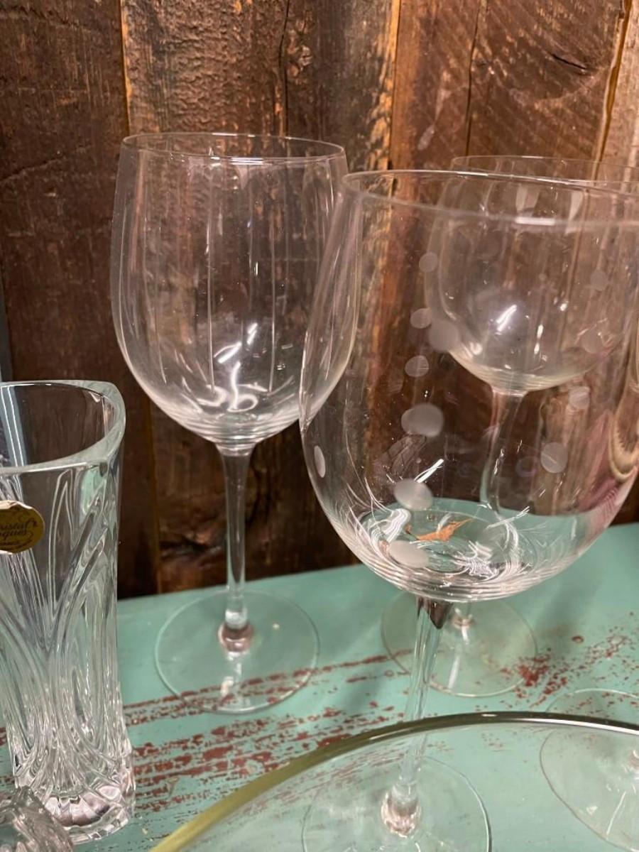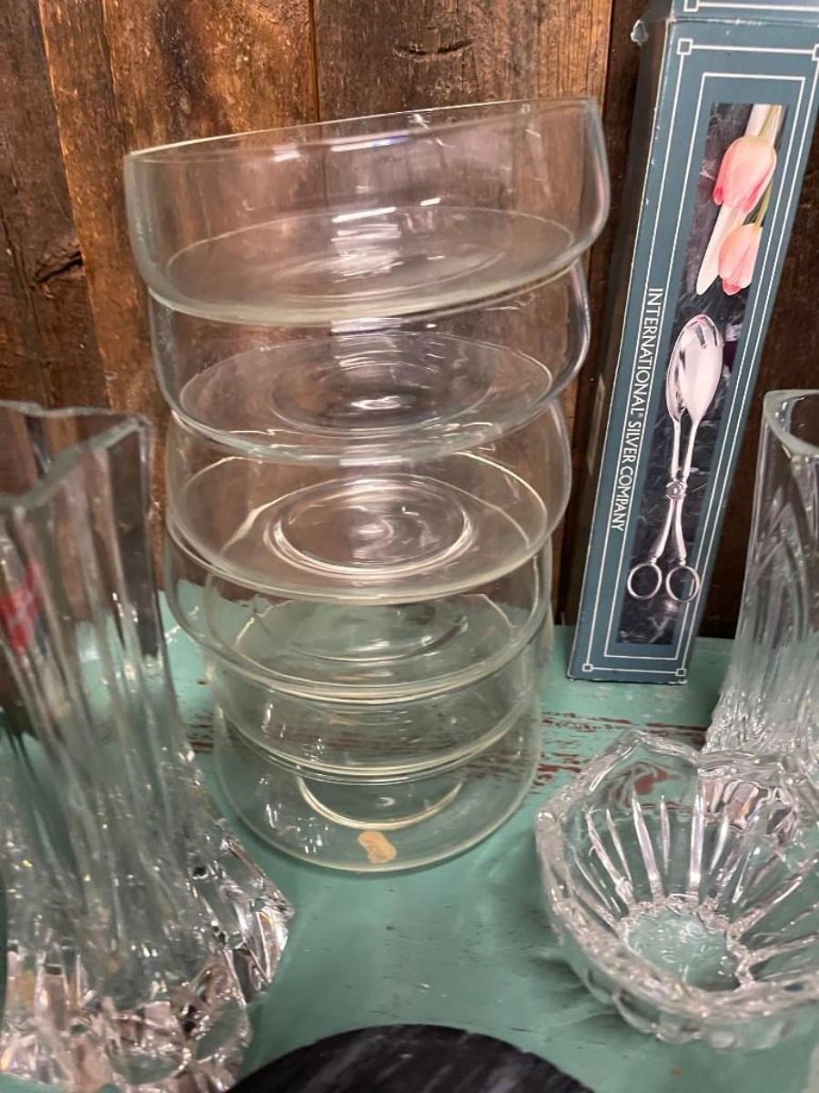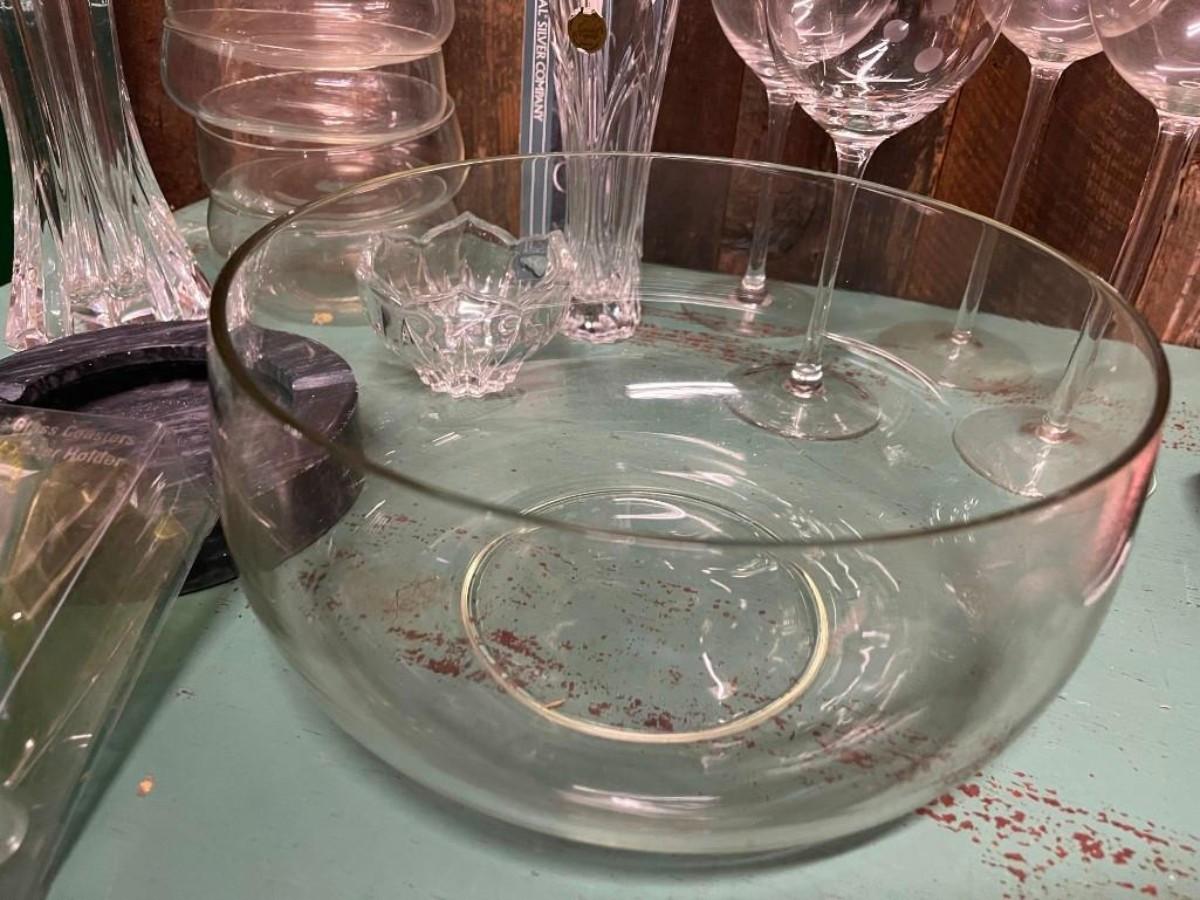 <strong>Lot of clear glass</strong>. Includes 2 different pairs of wine glasses (one is clear and the other is a pair of patterned glasses, all very pretty), a large clear bowl with 6 matching dessert bowls, a couple of vases, some silverplate tongs and a set of clear glass coasters.