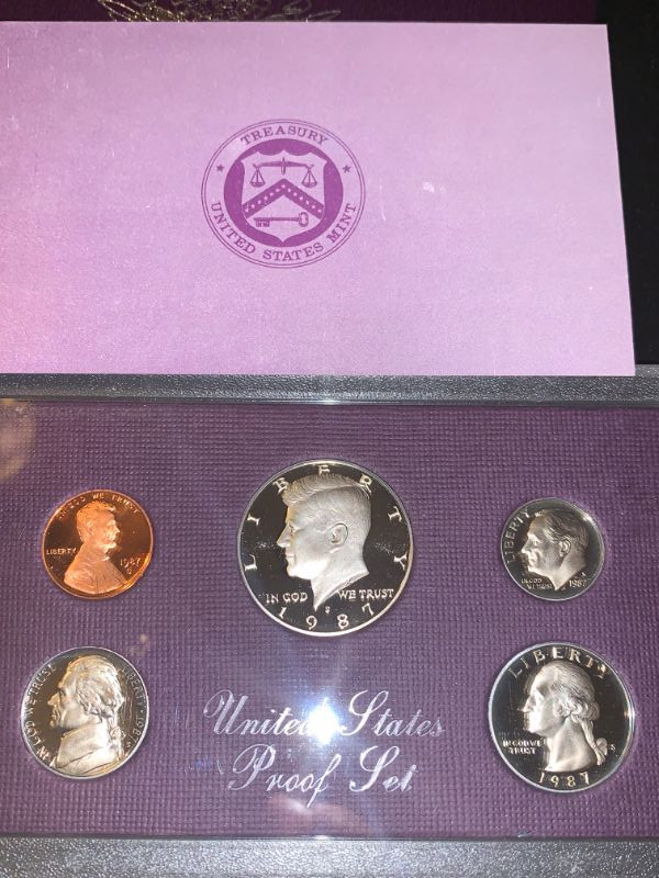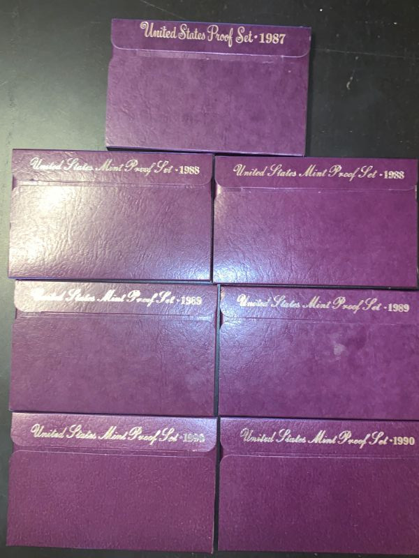 You are bidding on the seven proof sets pictured from 1987-1990. Shipping is available priority mail for a flat fee of $8.99.