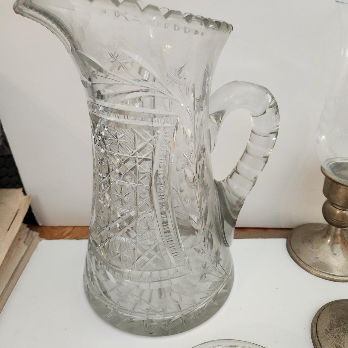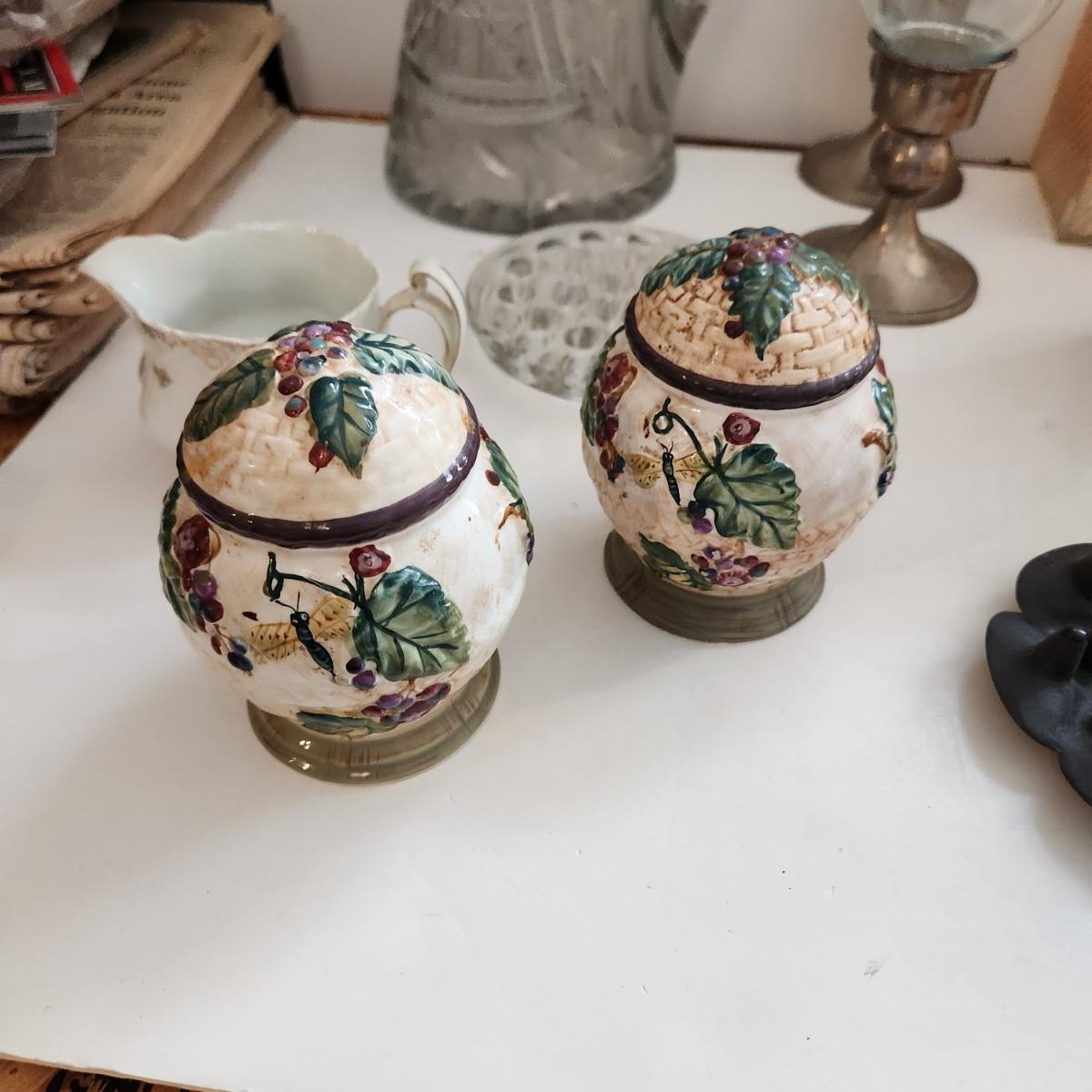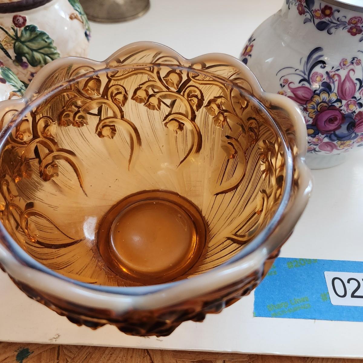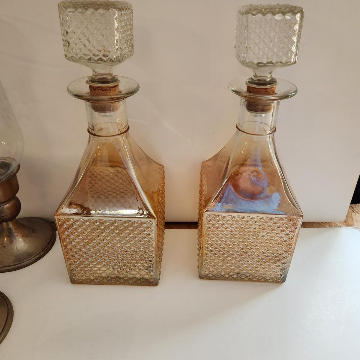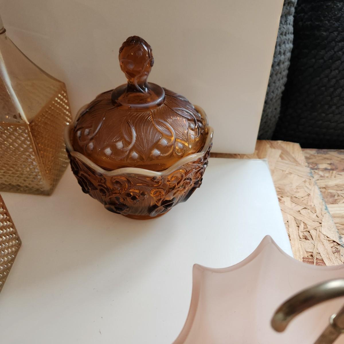 Lot of Collectable Glass Pottery , Dansk Cast Iron Candleholder Denmark, Pink Glass Parasol Candy Dish,, Old Forester Iridescent Decanters