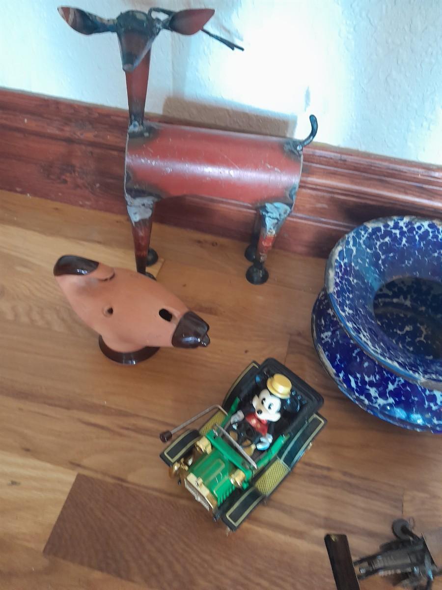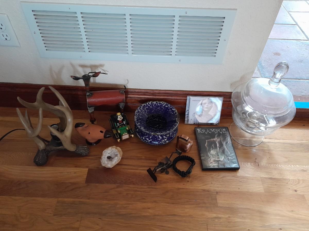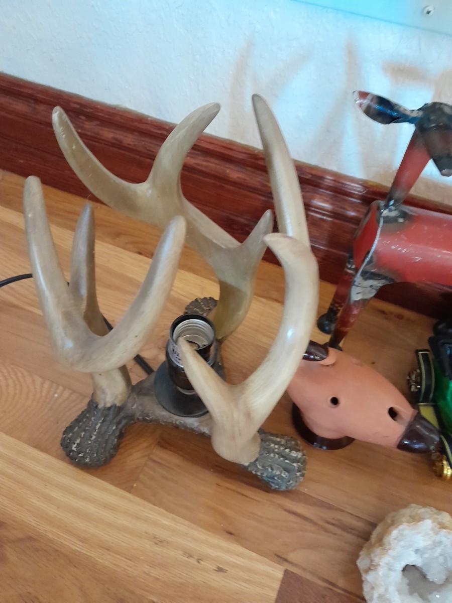 ENAMEL SPITOON, METAL DEER, DEER ANTLER LAMP, GEODE ROCK, AND OTHER HOUSEHOLD AND COLLECTABLE ITEMS