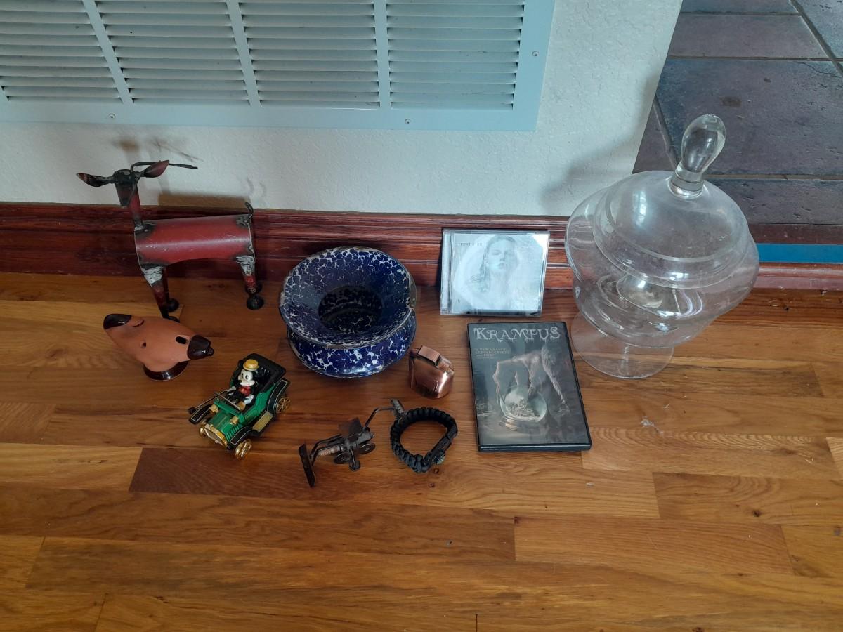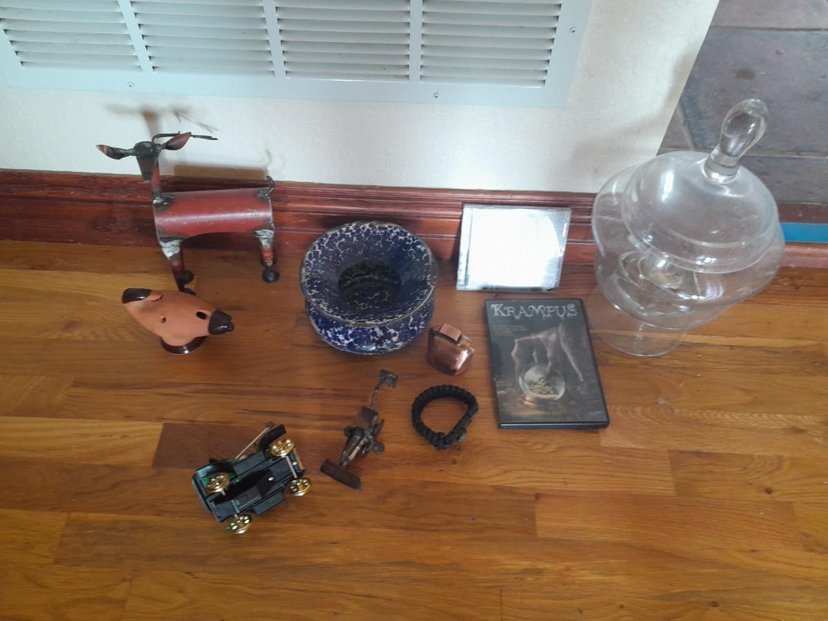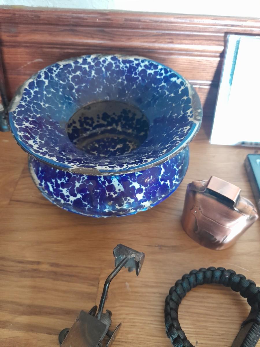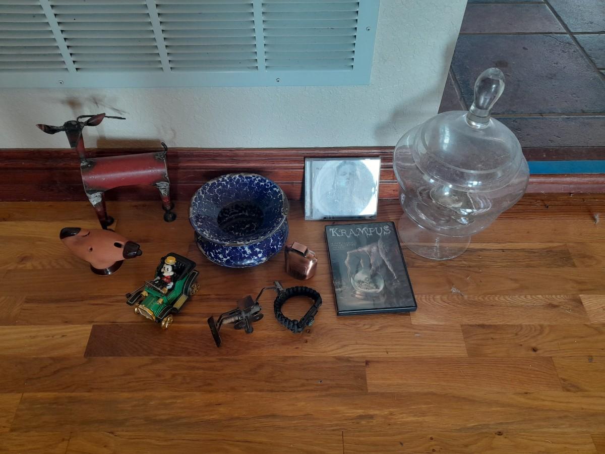 ENAMEL SPITOON, METAL DEER, DEER ANTLER LAMP, GEODE ROCK, AND OTHER HOUSEHOLD AND COLLECTABLE ITEMS