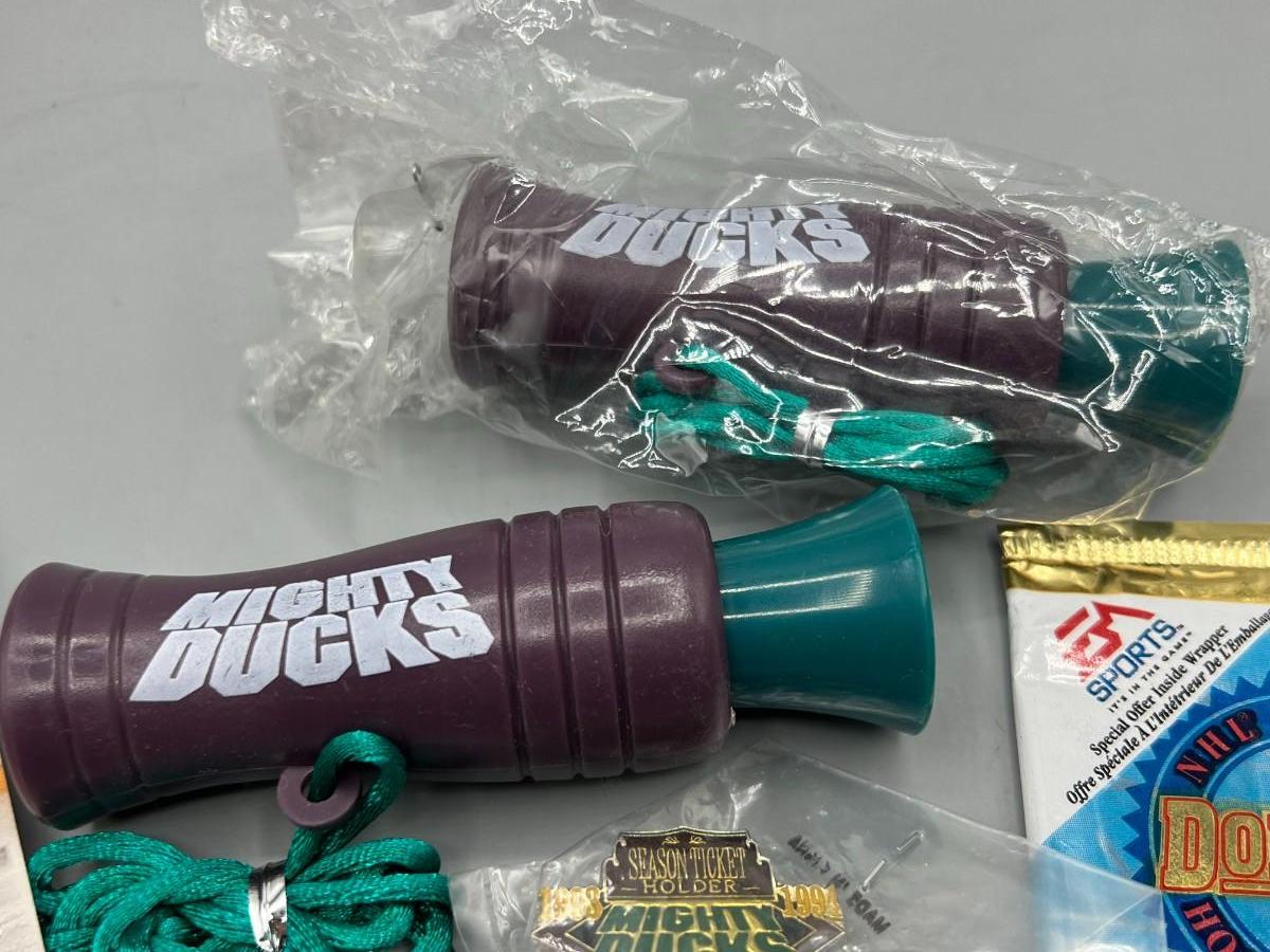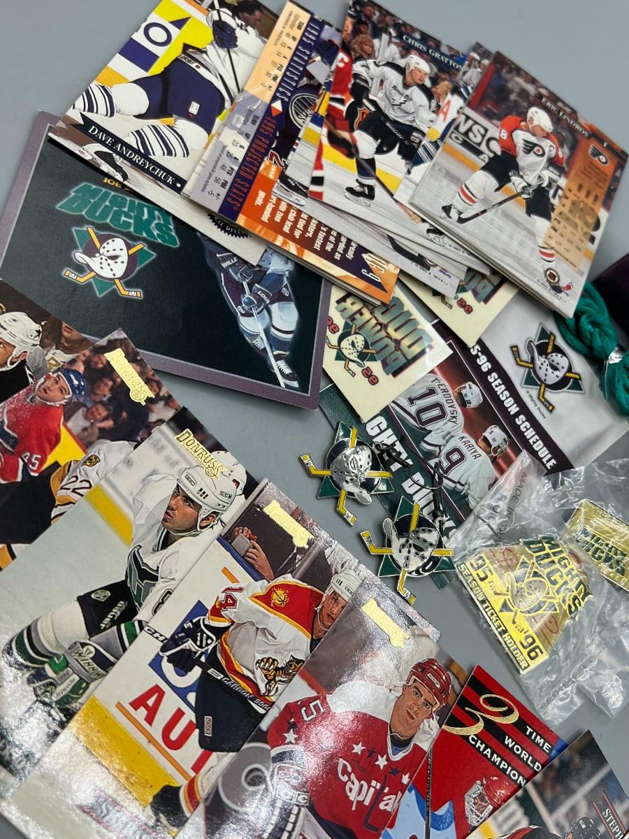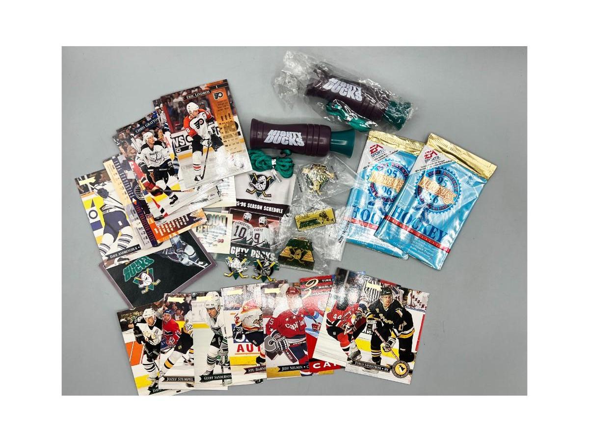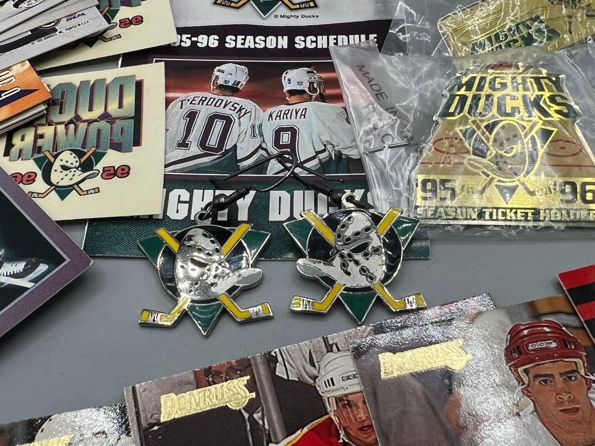 Lot of Collectible NHL Mighty Ducks Player Trading Cards, Duck Call, Pins & More