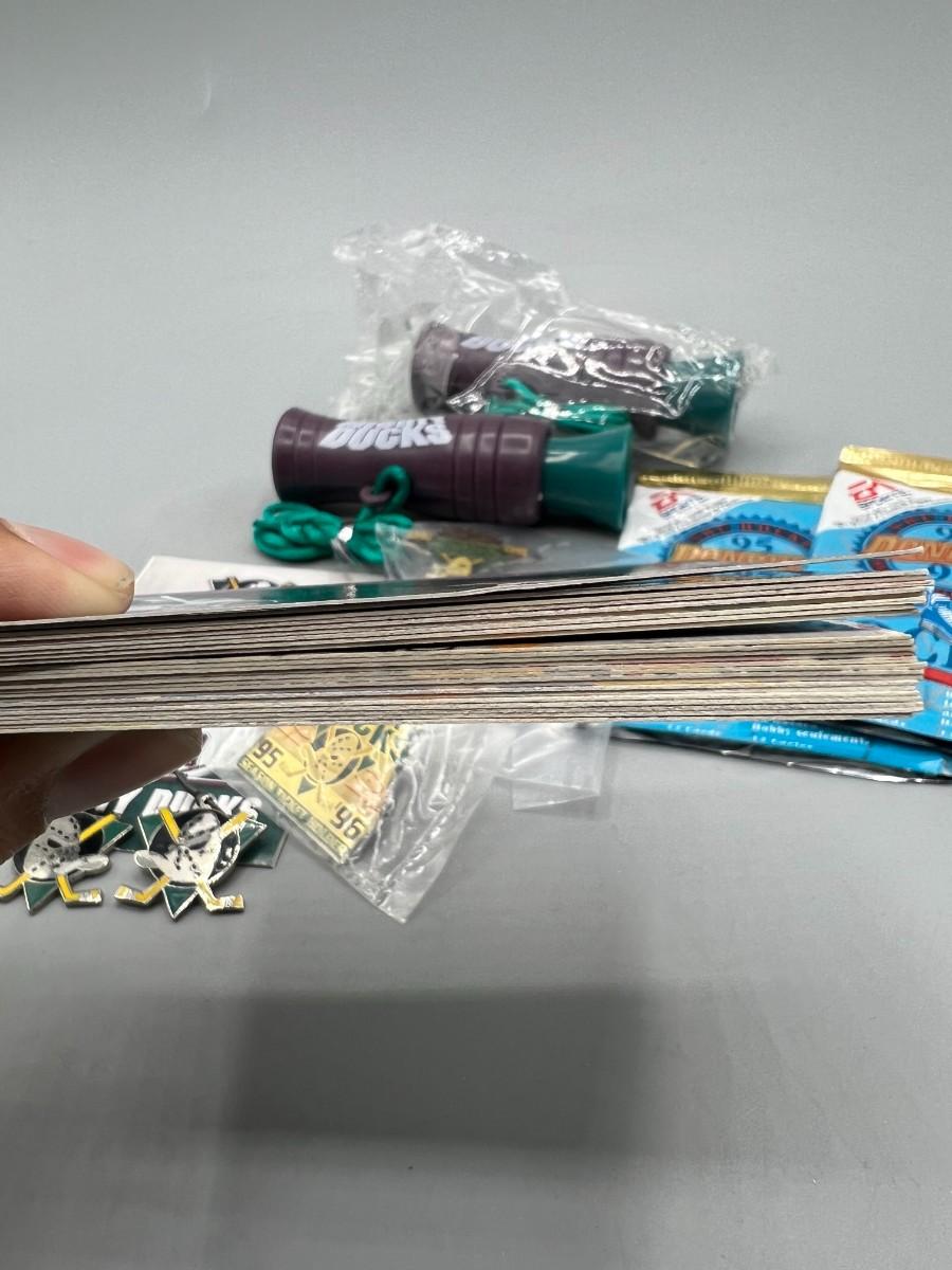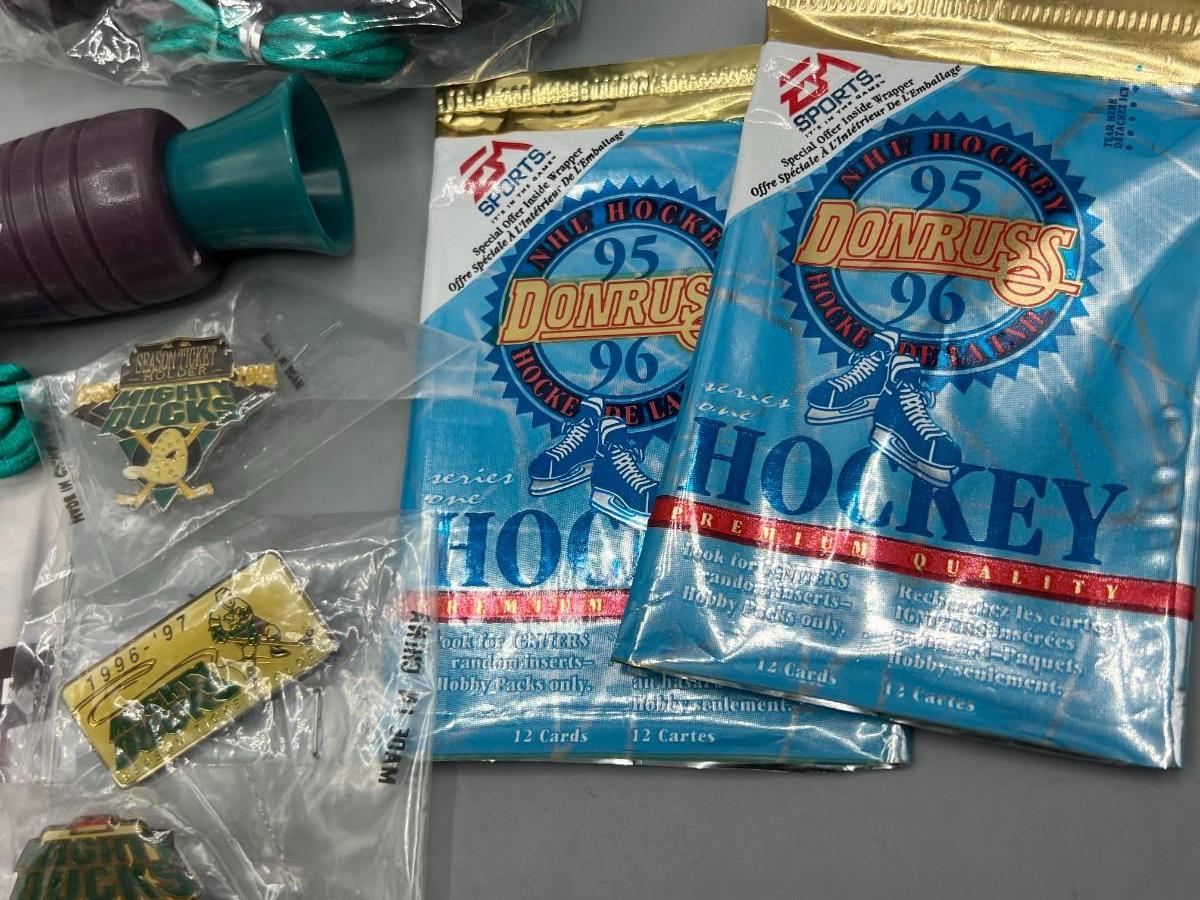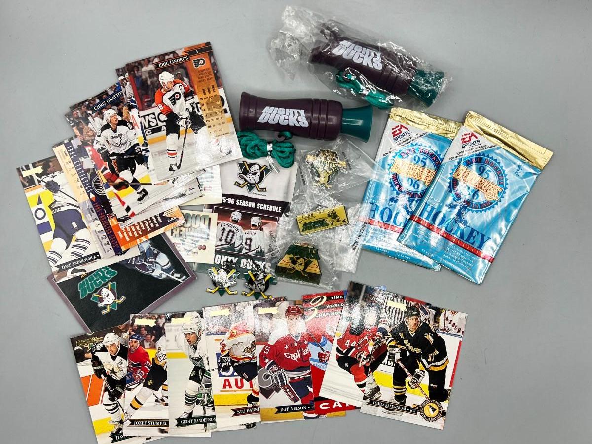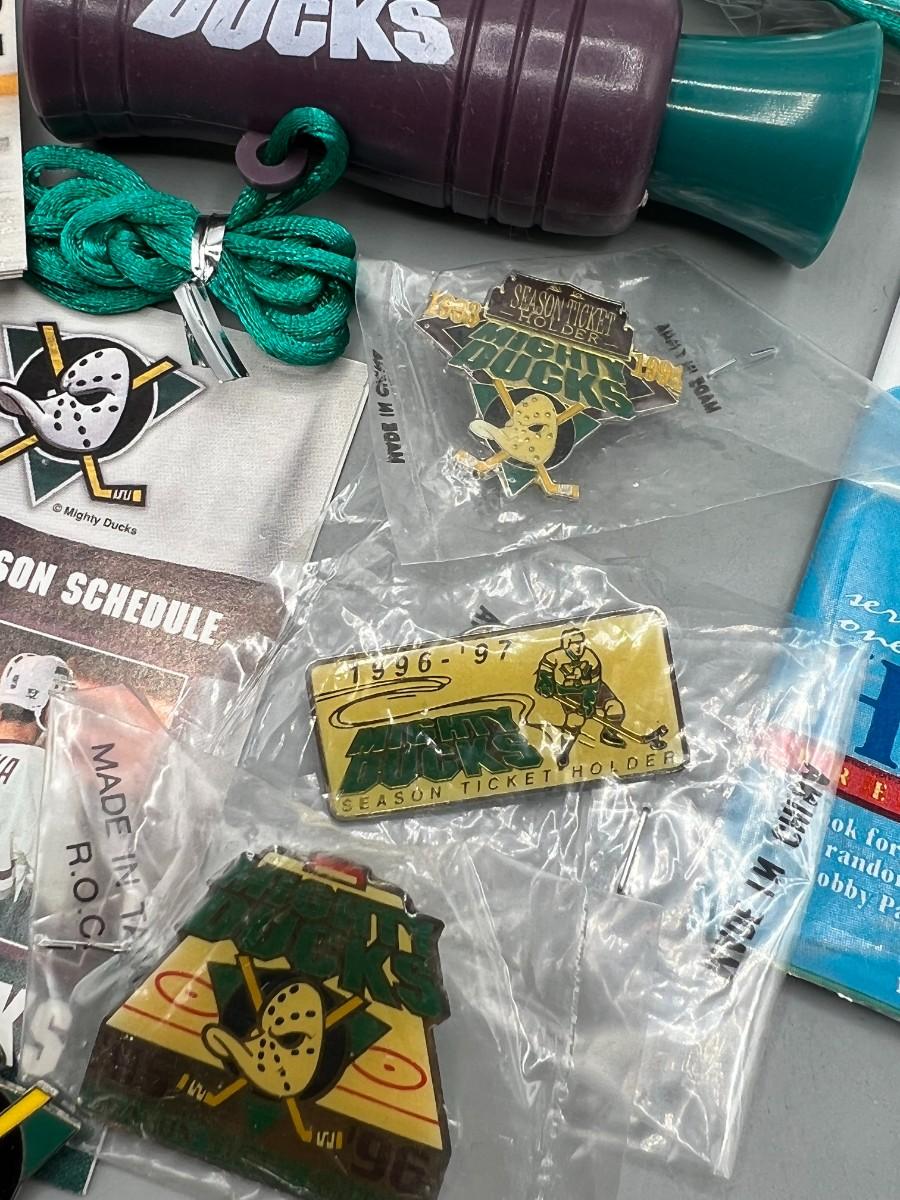 Lot of Collectible NHL Mighty Ducks Player Trading Cards, Duck Call, Pins & More