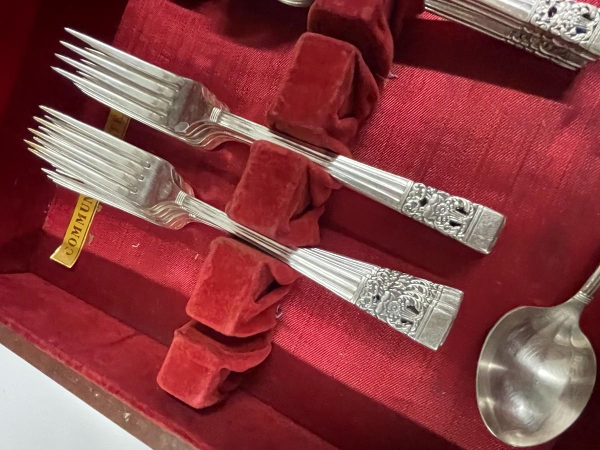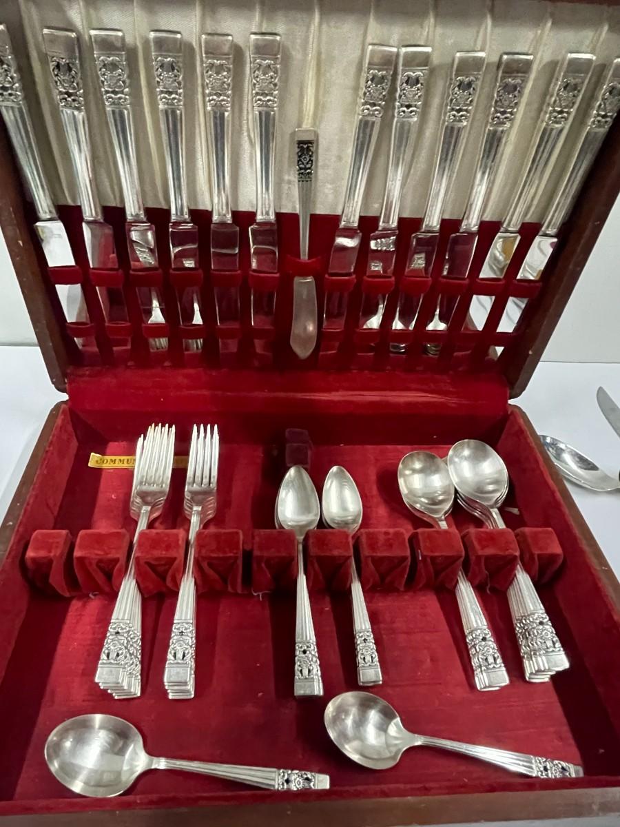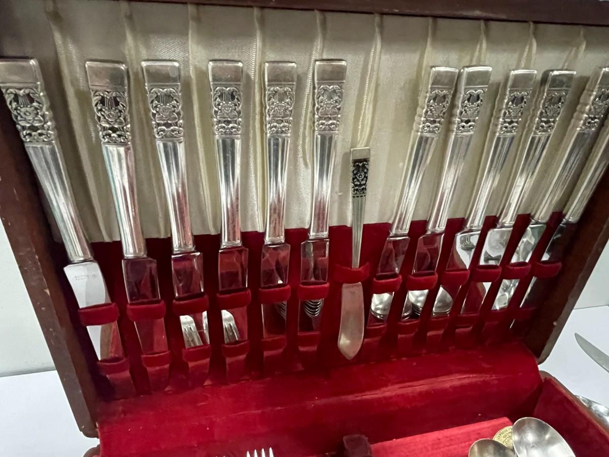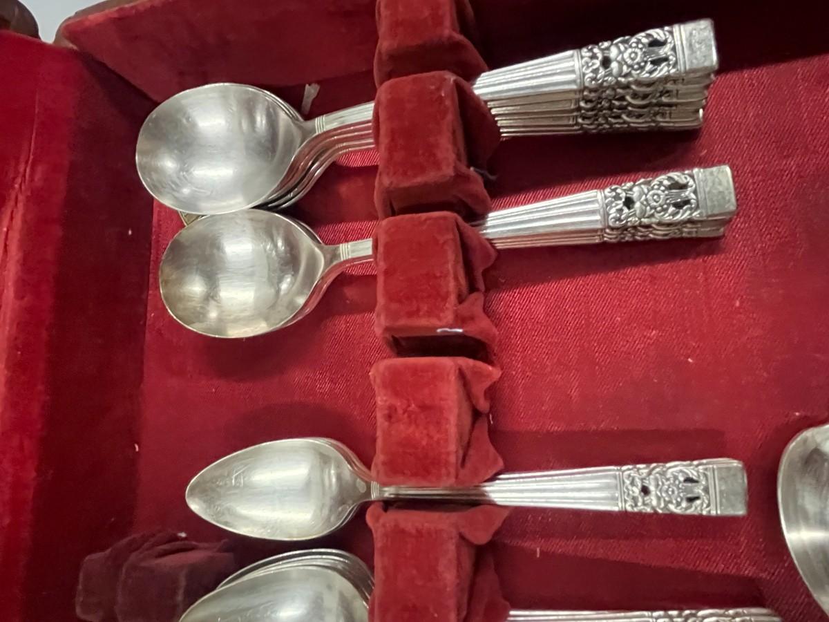 Set includes: 12 dinner forks, 11 teaspoons, 11 soup spoons, 12 knives, and a few serving pieces. Comes in wooden case.