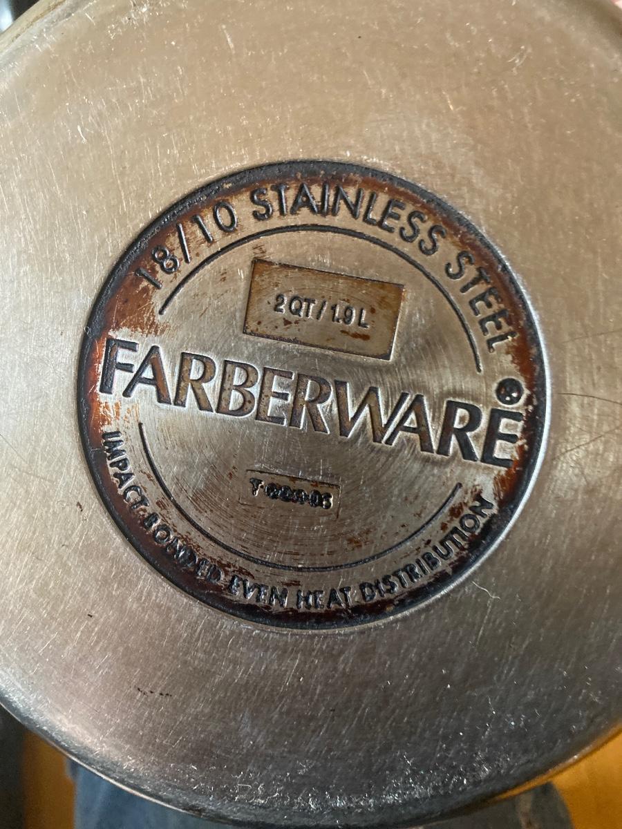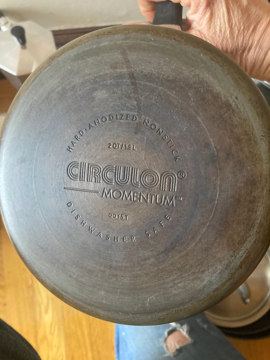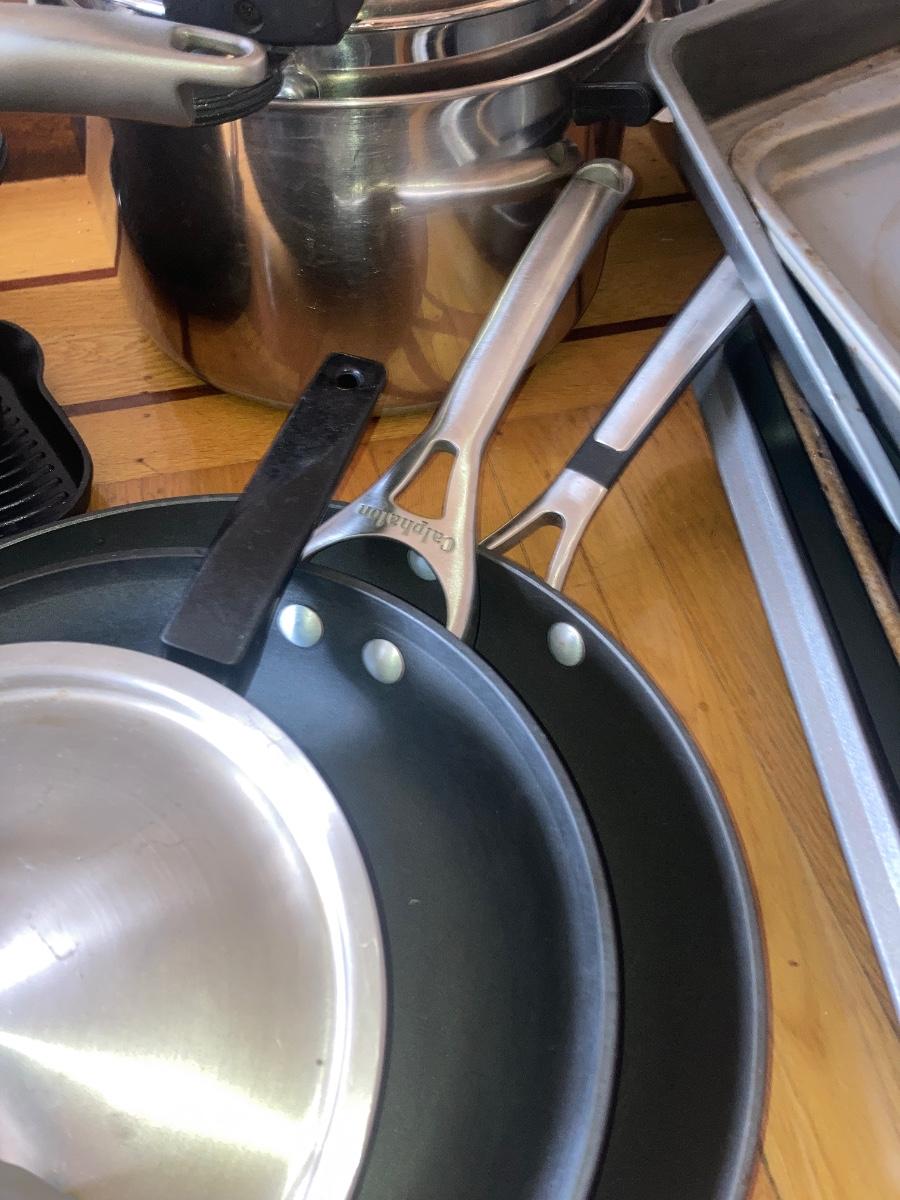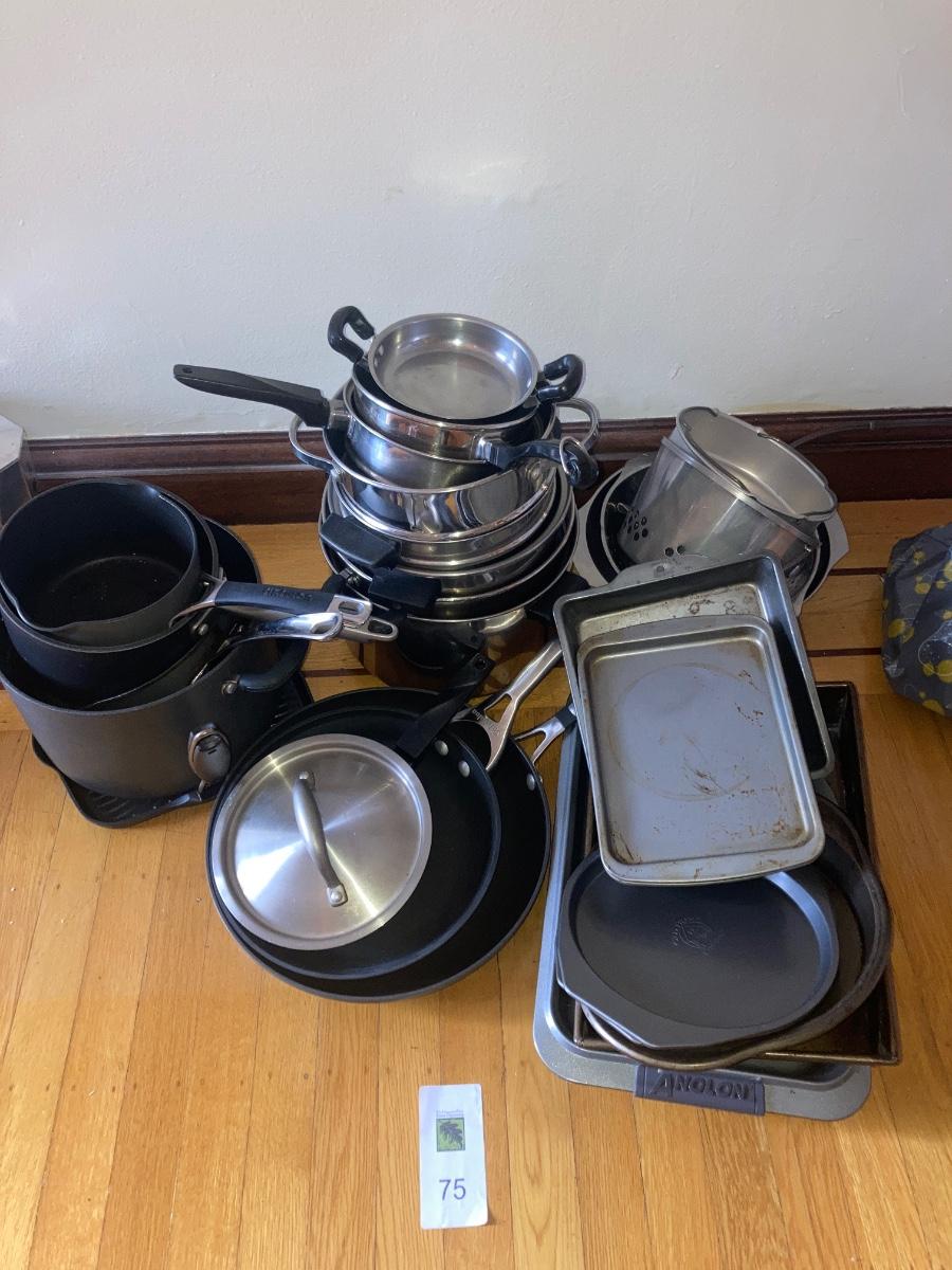 A lot of Circulon, Faberware, and other brand pots, pans, skillets, colanders, baking pans, and a variety of mismatched utensils and knives