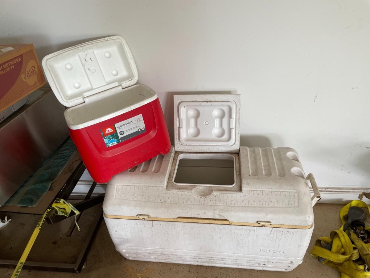 A large Igloo cooler and a medium Pinnacle camping coolers.