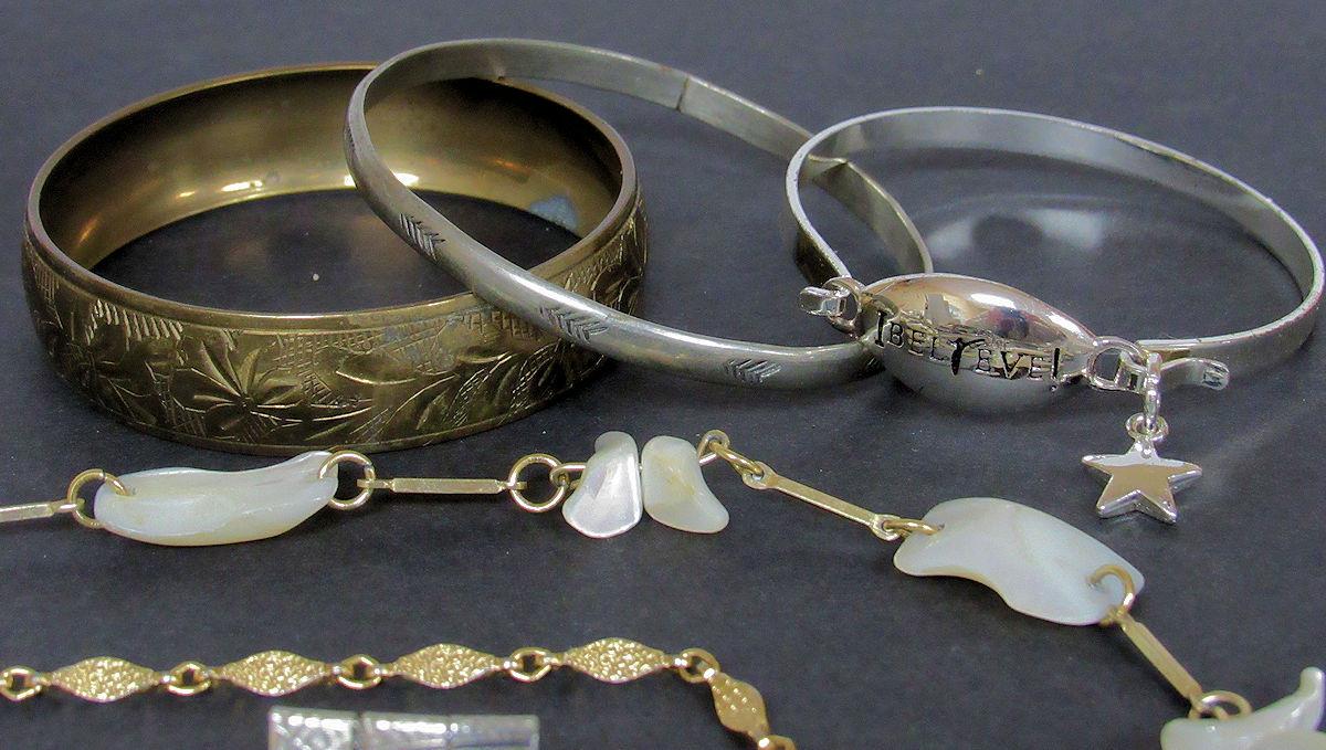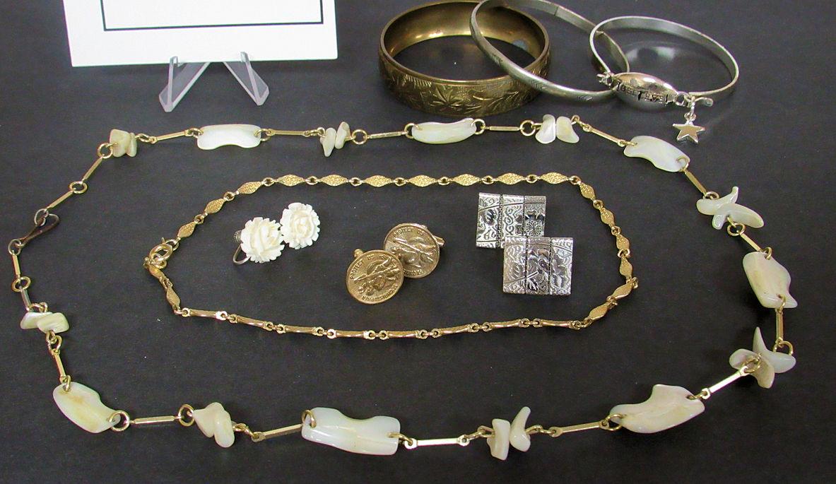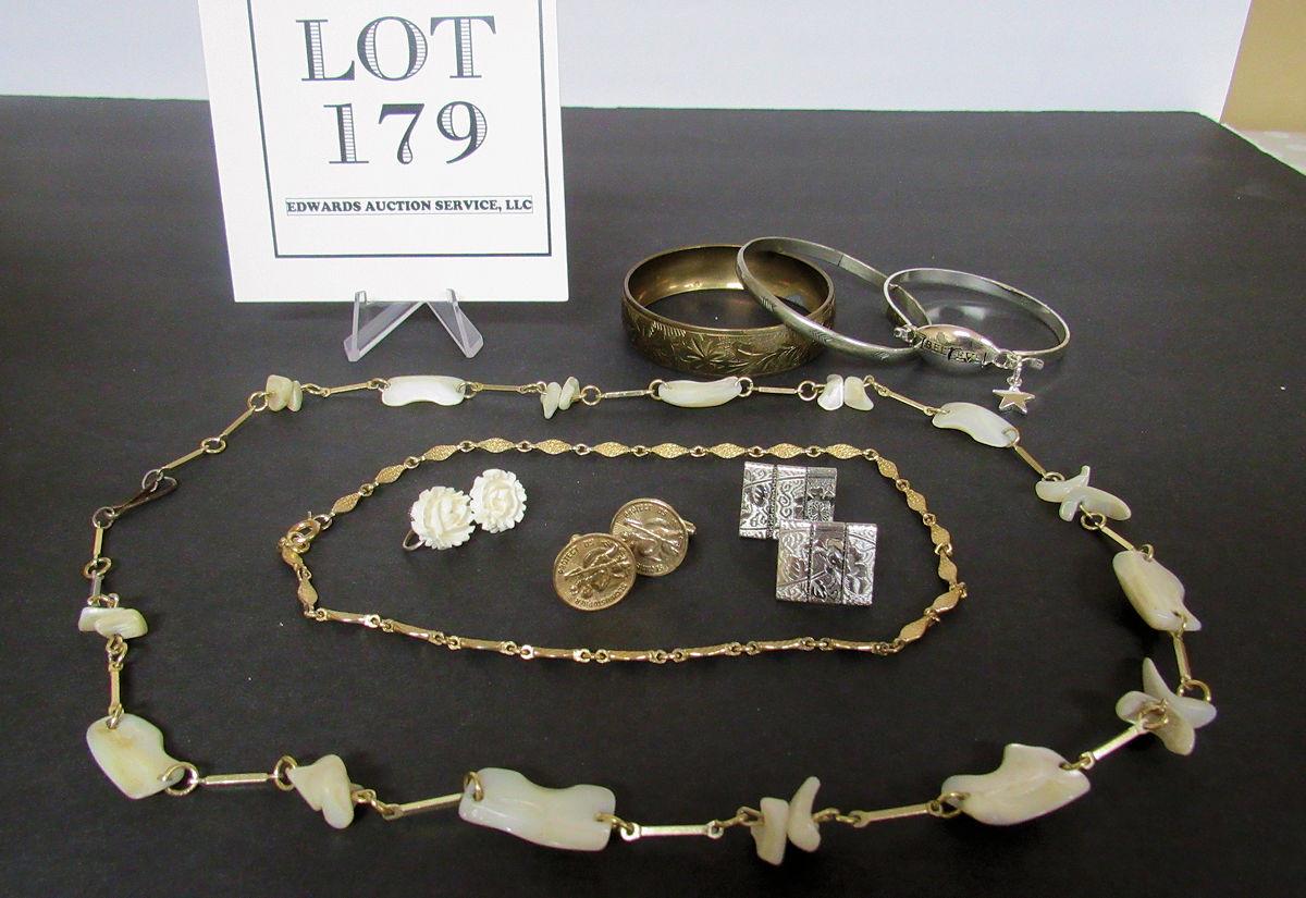 Lot of Costume Jewelry Brass Bangle, Shell Necklace, Goldtown Necklace, More