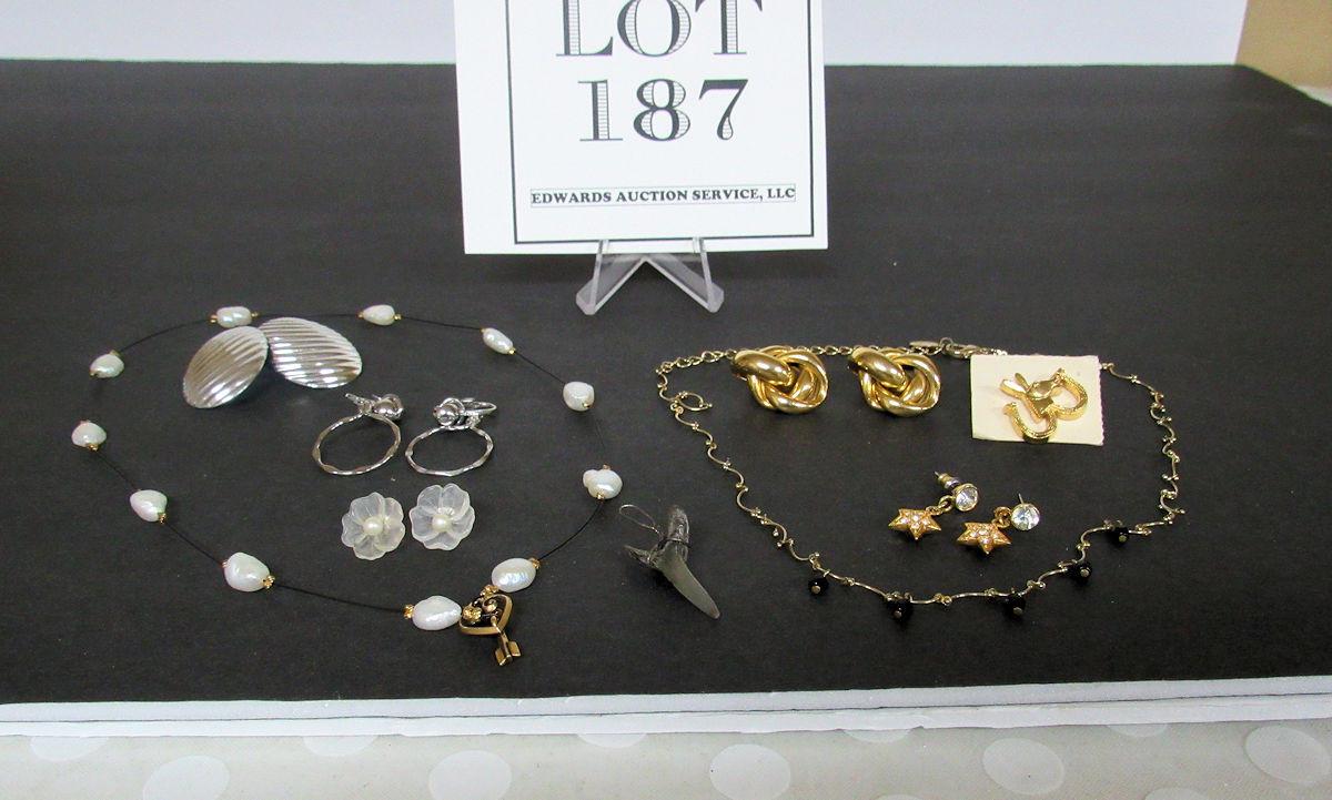 Very nice condition. The earrings need cleaning. One star earring is missing its back. Black and gold necklace is marked LC, floral earrings are marked Sarah.