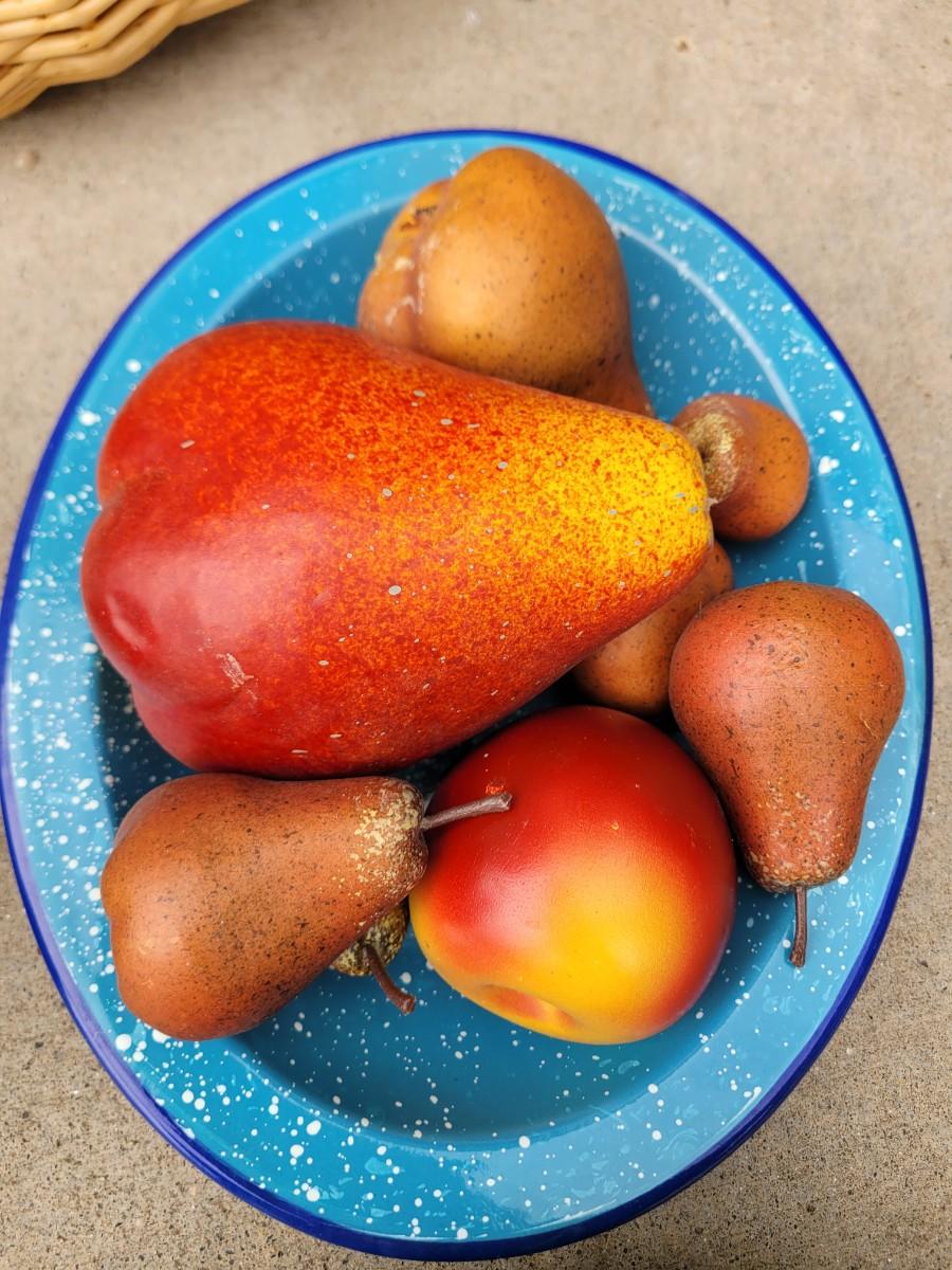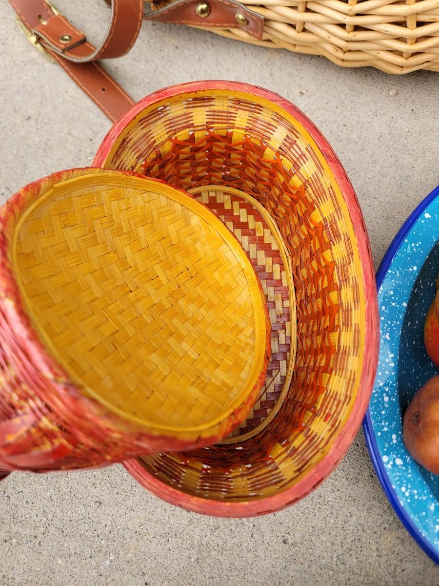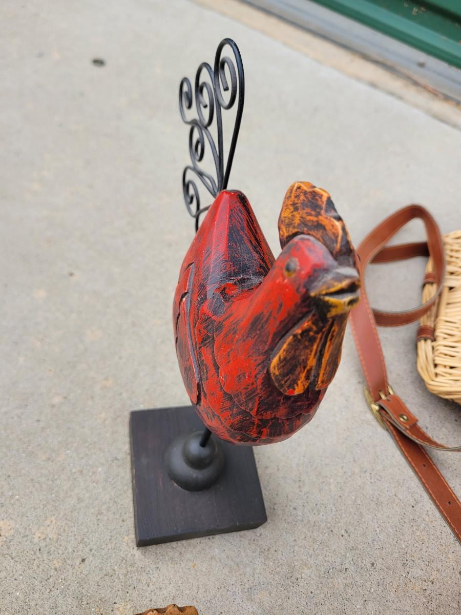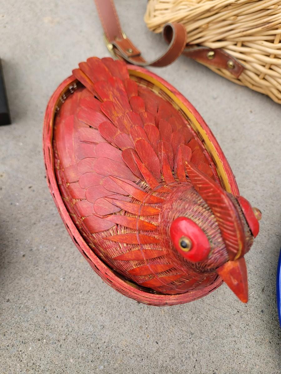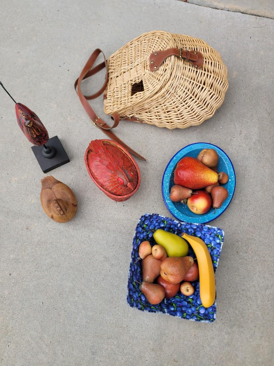 Wooden chicken on stand, wooden duck, wicker chicken basket, vintage enameled bowl and cloth bowl, with artificial fruits. Trust me, they're artificial, the pear was no bueno. Wicker picnic basket with hole for wine bottle and leather strap that's in perfect shape.