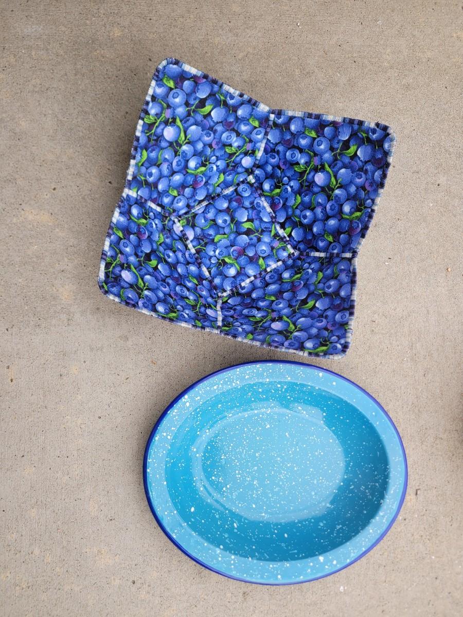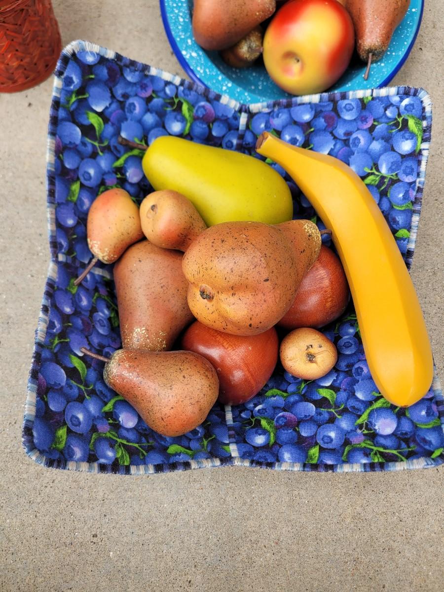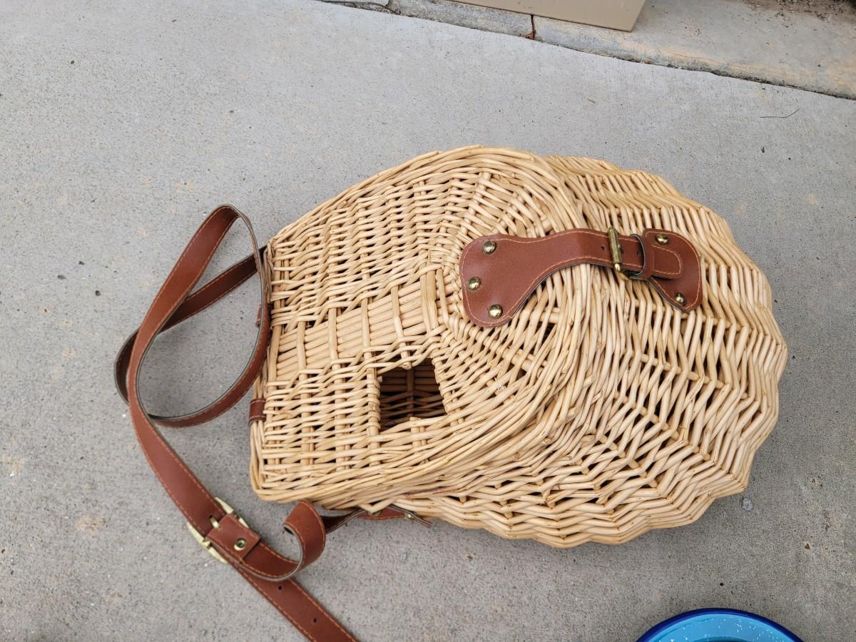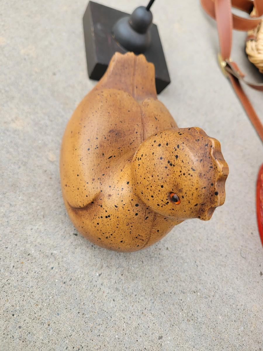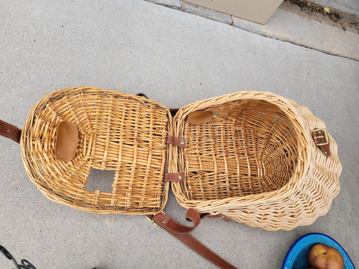Wooden chicken on stand, wooden duck, wicker chicken basket, vintage enameled bowl and cloth bowl, with artificial fruits. Trust me, they're artificial, the pear was no bueno. Wicker picnic basket with hole for wine bottle and leather strap that's in perfect shape.