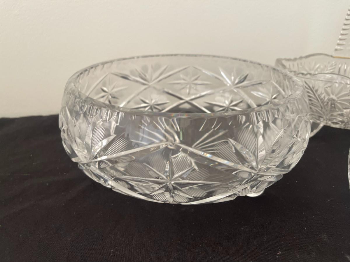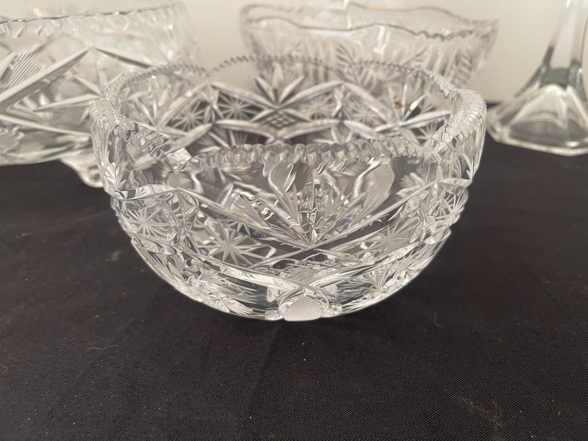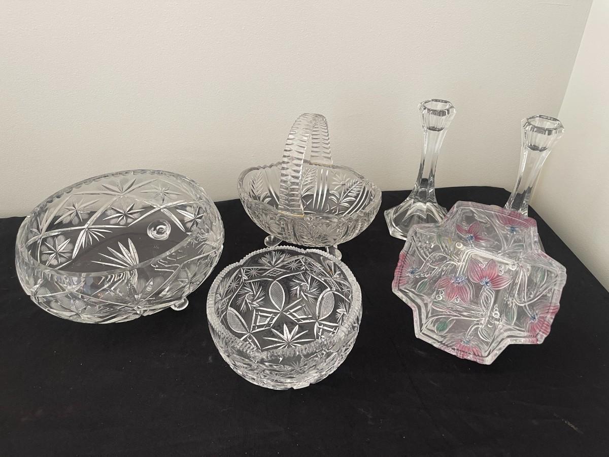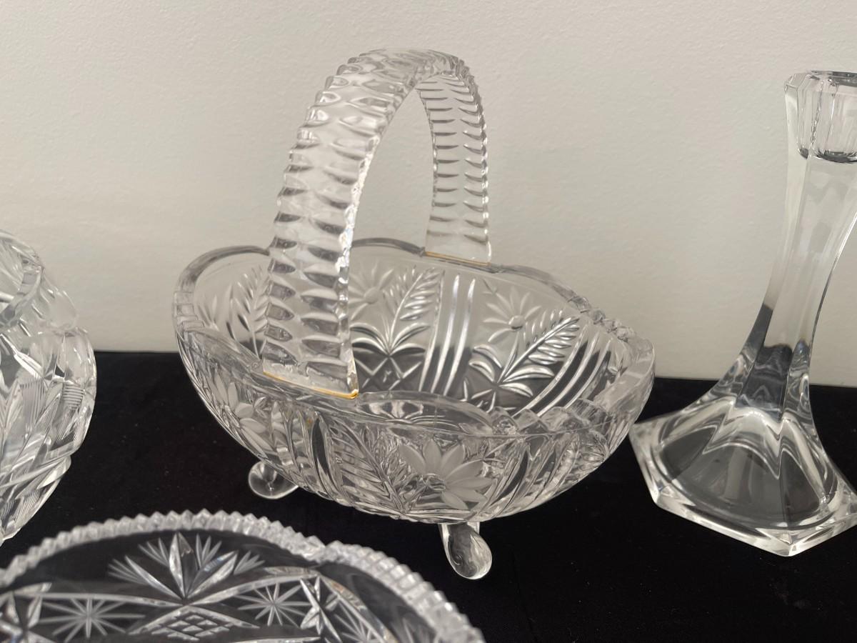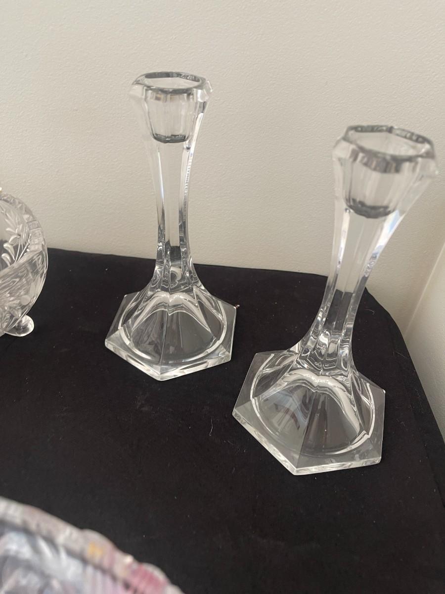 Lot of crystal and glass bowls and candlesticks. No obvious chips or cracks.