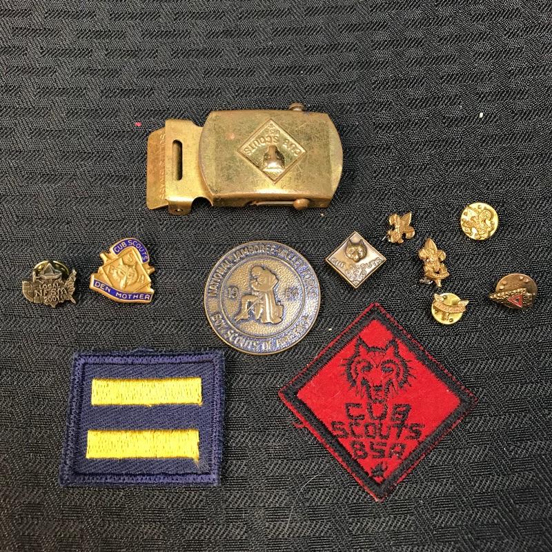 Lot of Cub Scous Accoutrements; pins, belt buckles, patches
