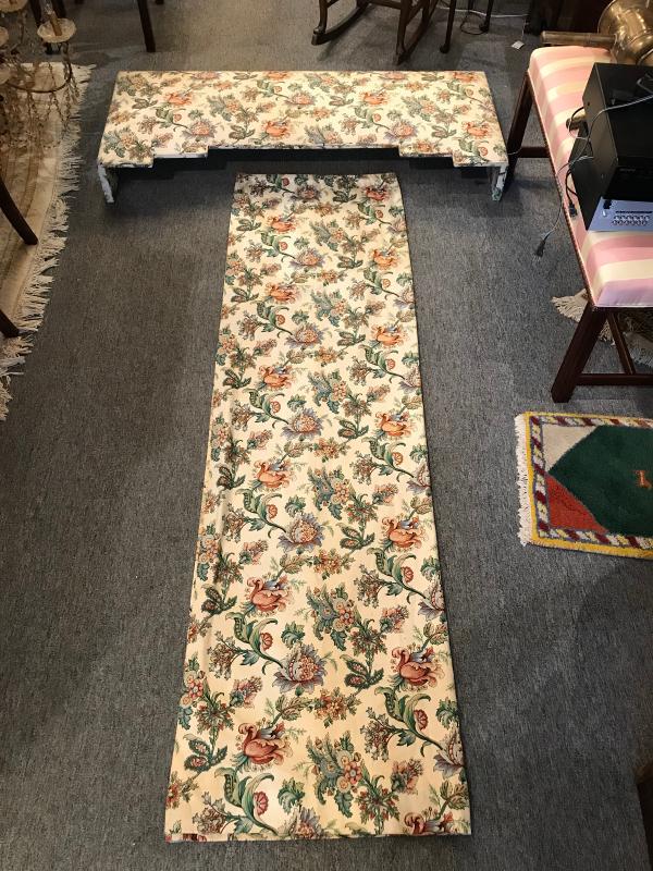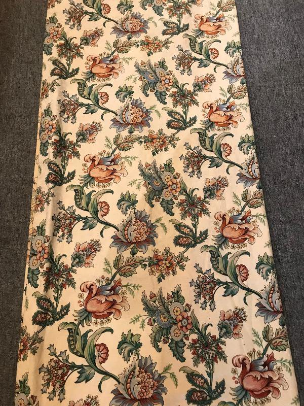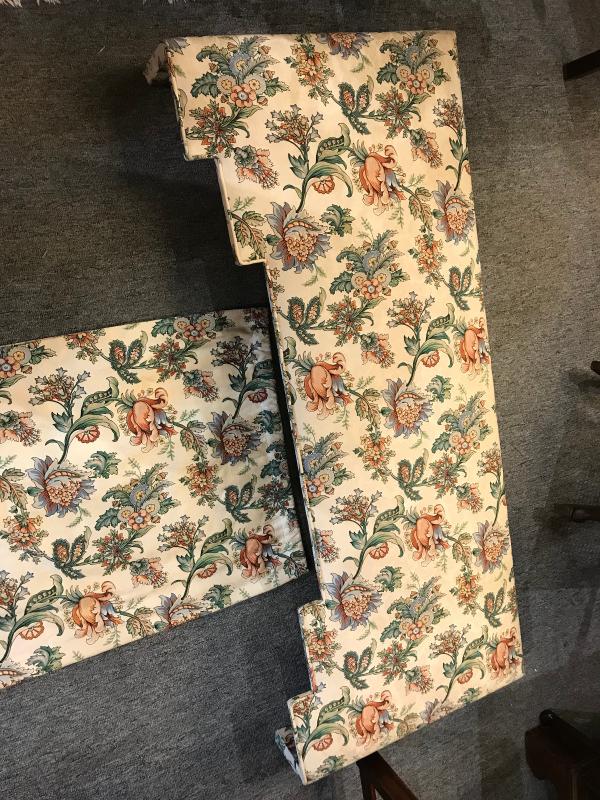 Lot of upholstered cornices with matching lined drapes. Board cornices are padded, lined, and upholstered. 81" lined 1" rod pocket drapes to match. Fabric is cream damask with printed Jacobean floral pattern in shades of blue, green, tan, and pink/terracotta.. Lot includes two cornices 54" x 22 1/2" x 6" with drapes to fit (standard window size). They are in as found condition- some fading and age staining on draperies. Could be cleaned and used as is, or use the yards and yards of fabric for another project.