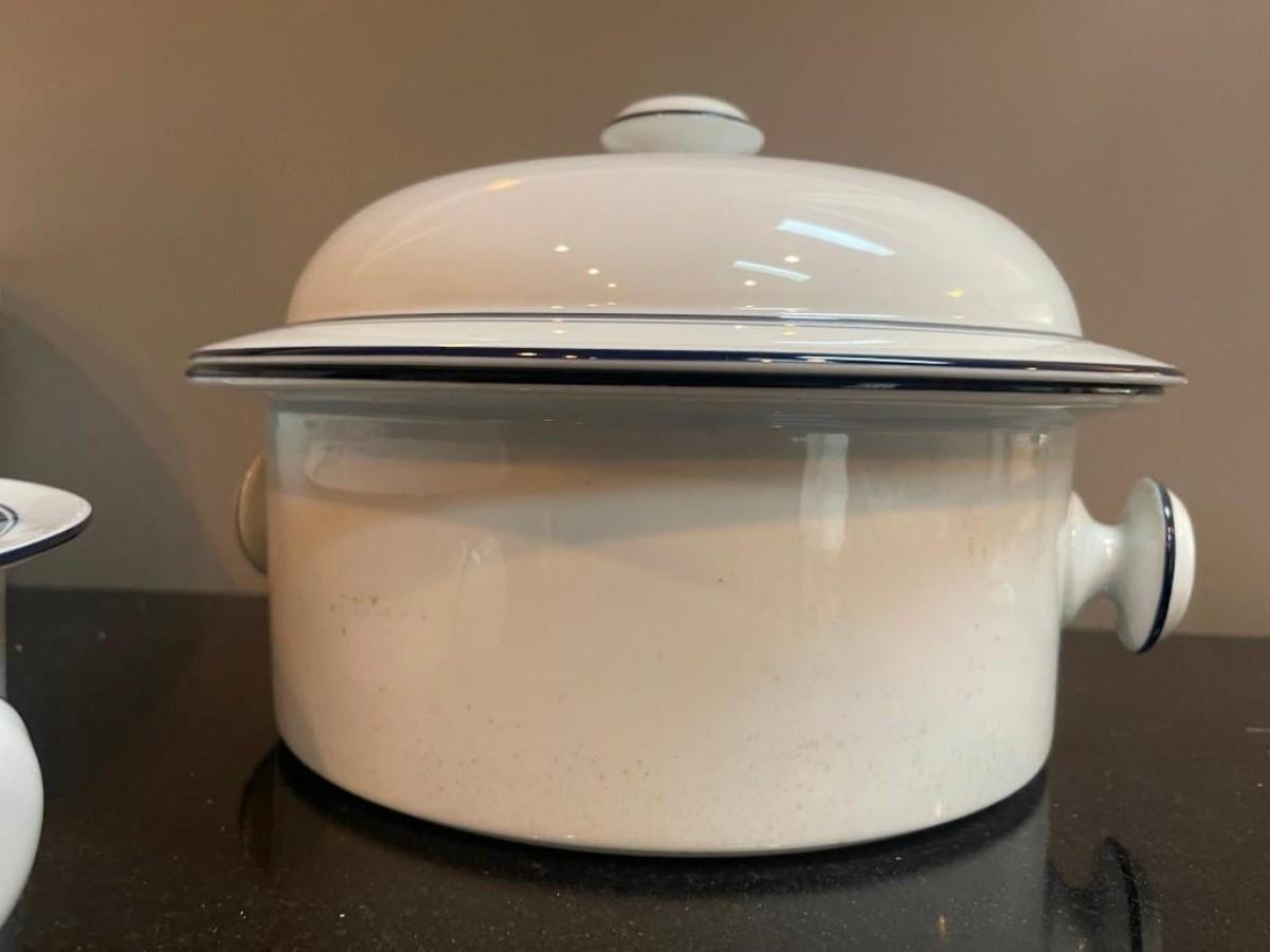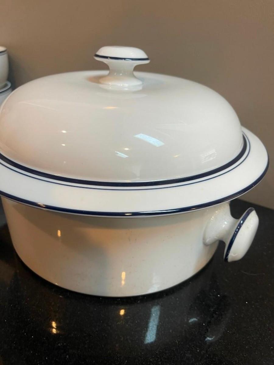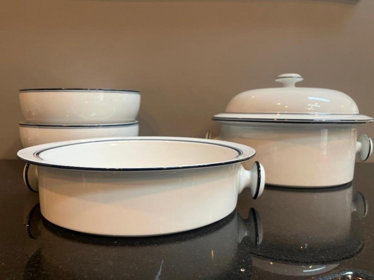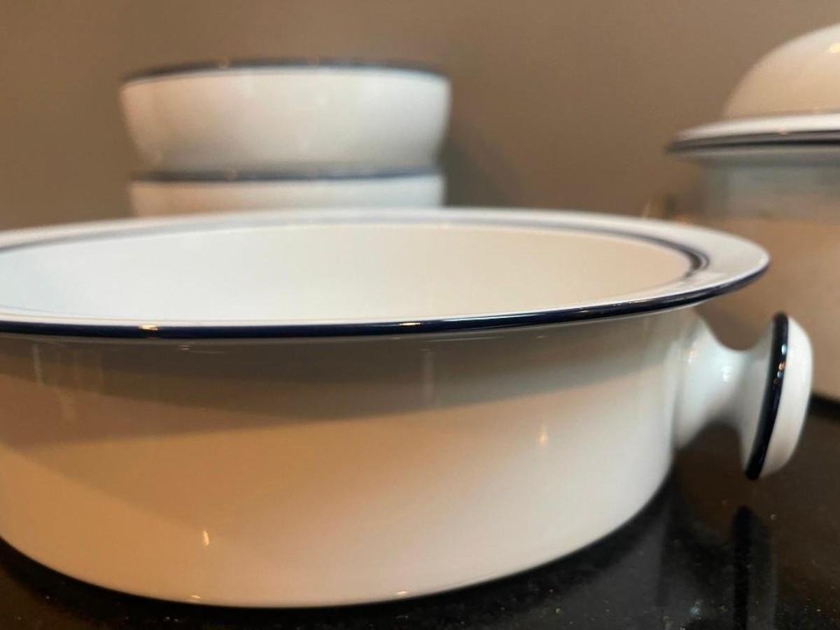 Lot of Dansk Bistro White Serving Dishes with Blue Rims.  Lot includes 2 identical round bowls, one lidded casserole and one casserole without a lid.  Very good condition, no chips or cracks.
