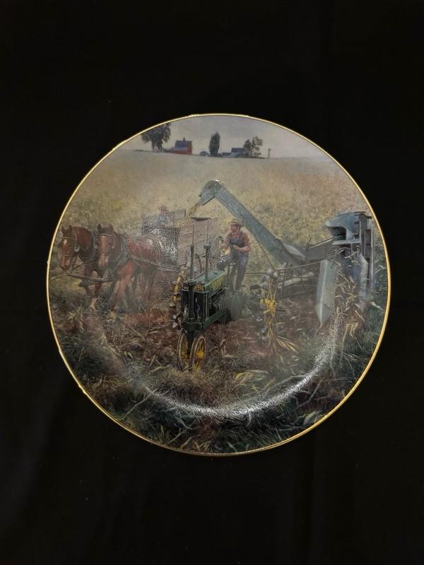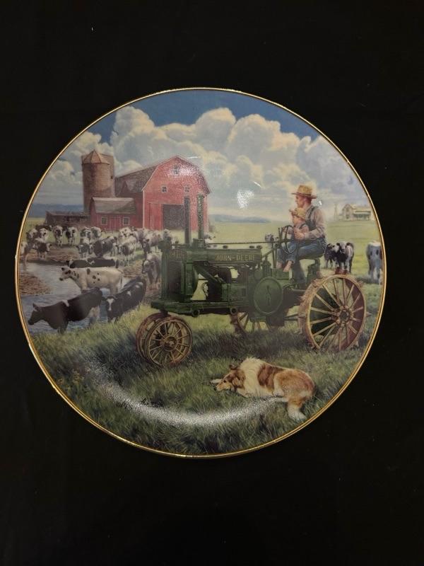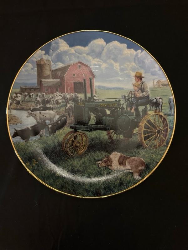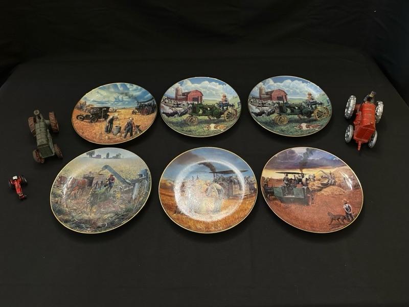 A Collection of Plates Depicting Farm Memories and Life. Each plate is in excellent condition and comes with two cast iron tractor figurines and one other.