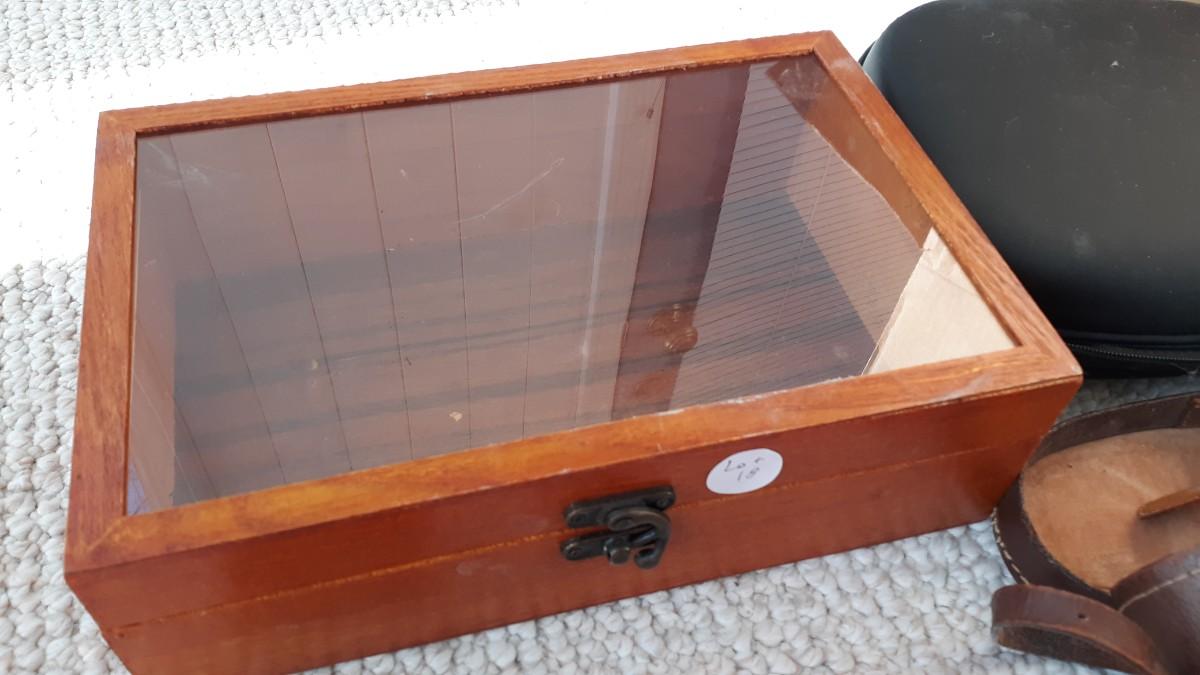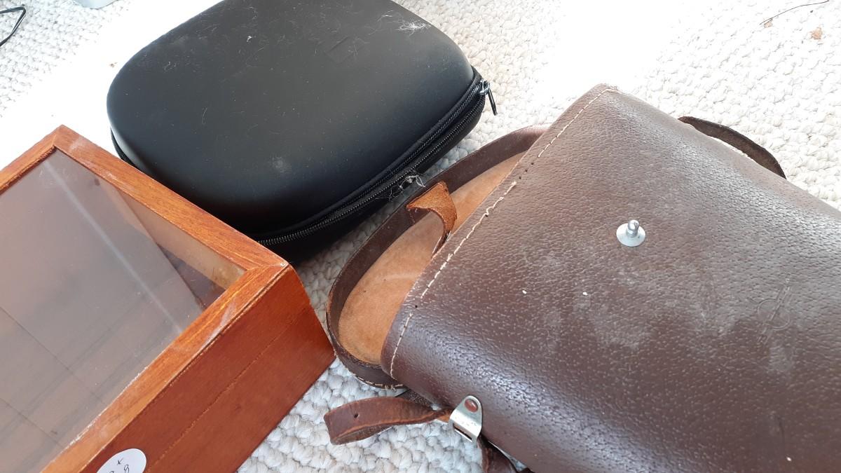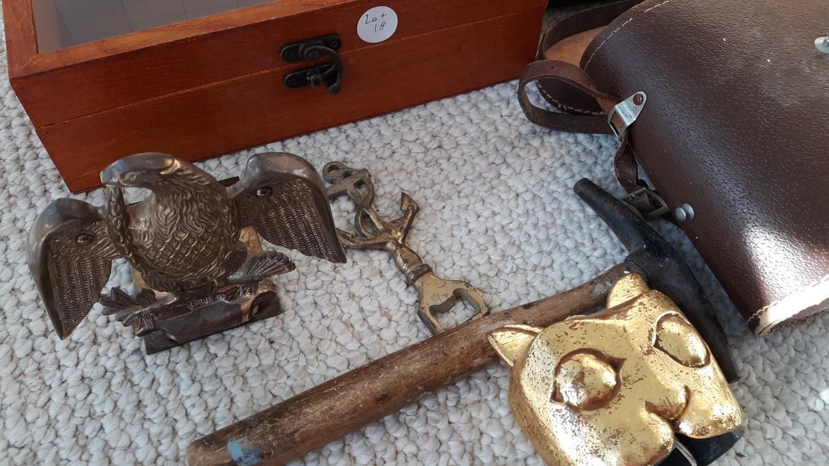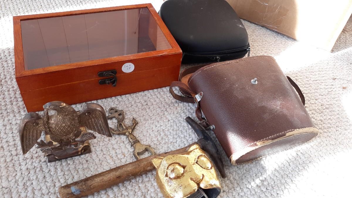 Vintage Empty Cases, brass items (cat is not brass), and other items.