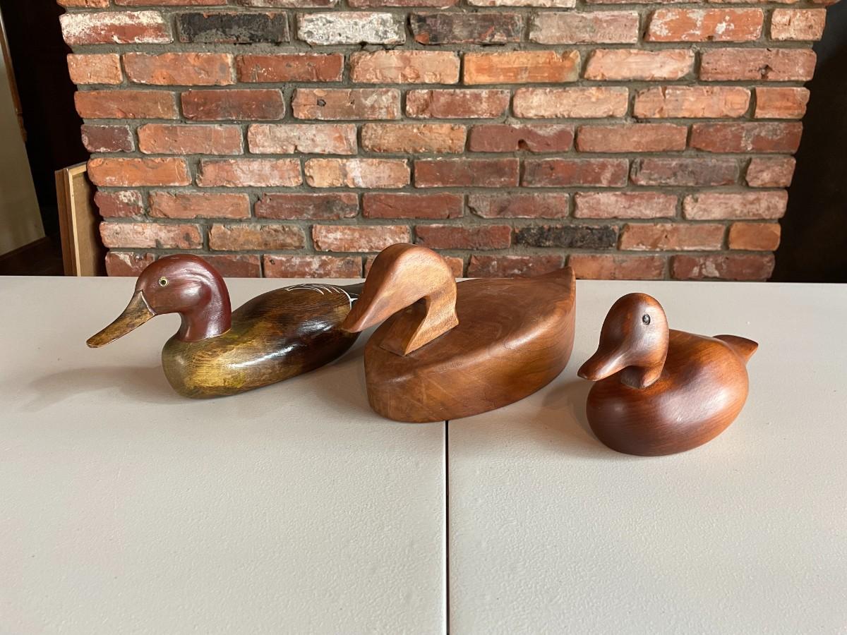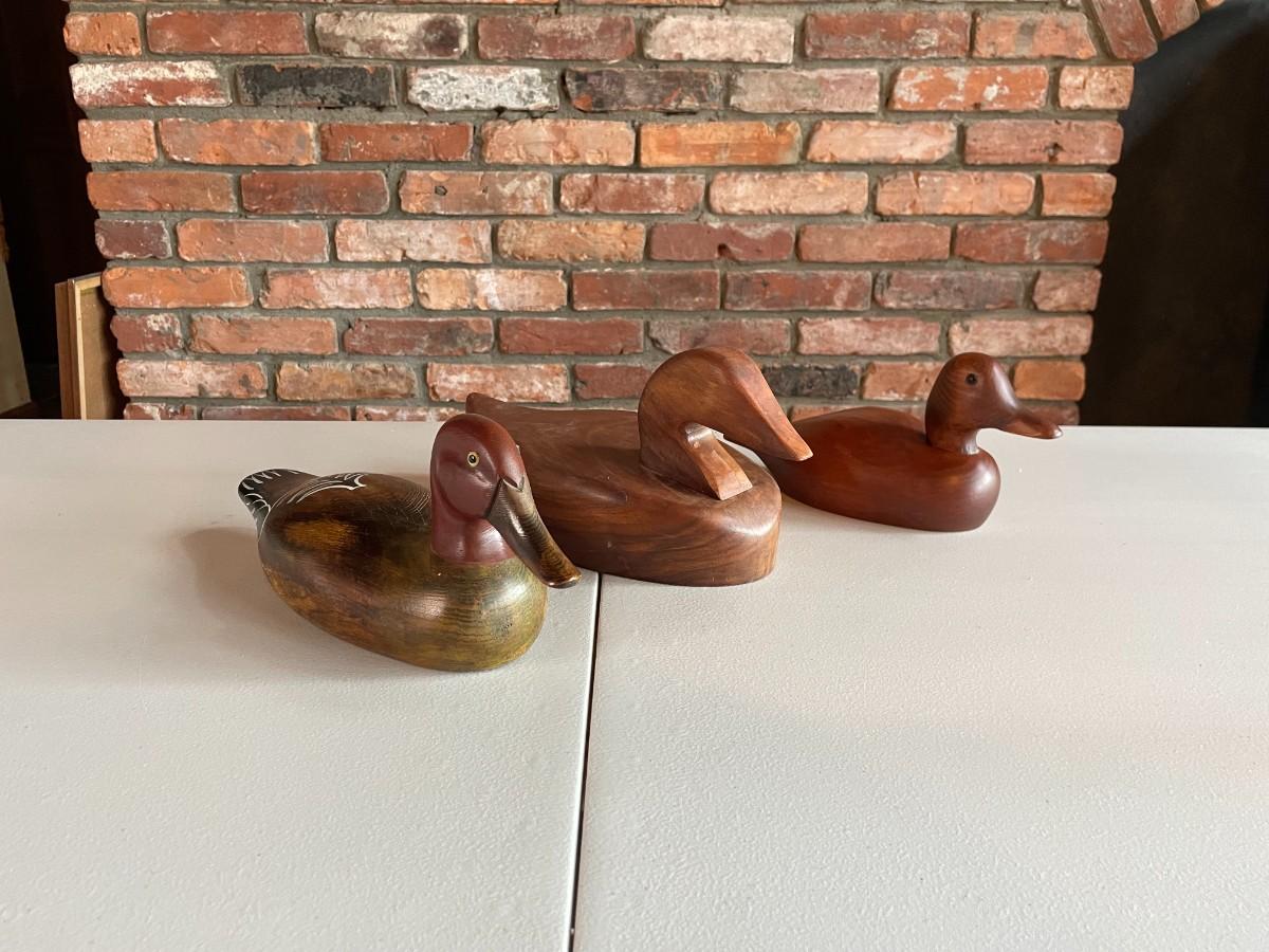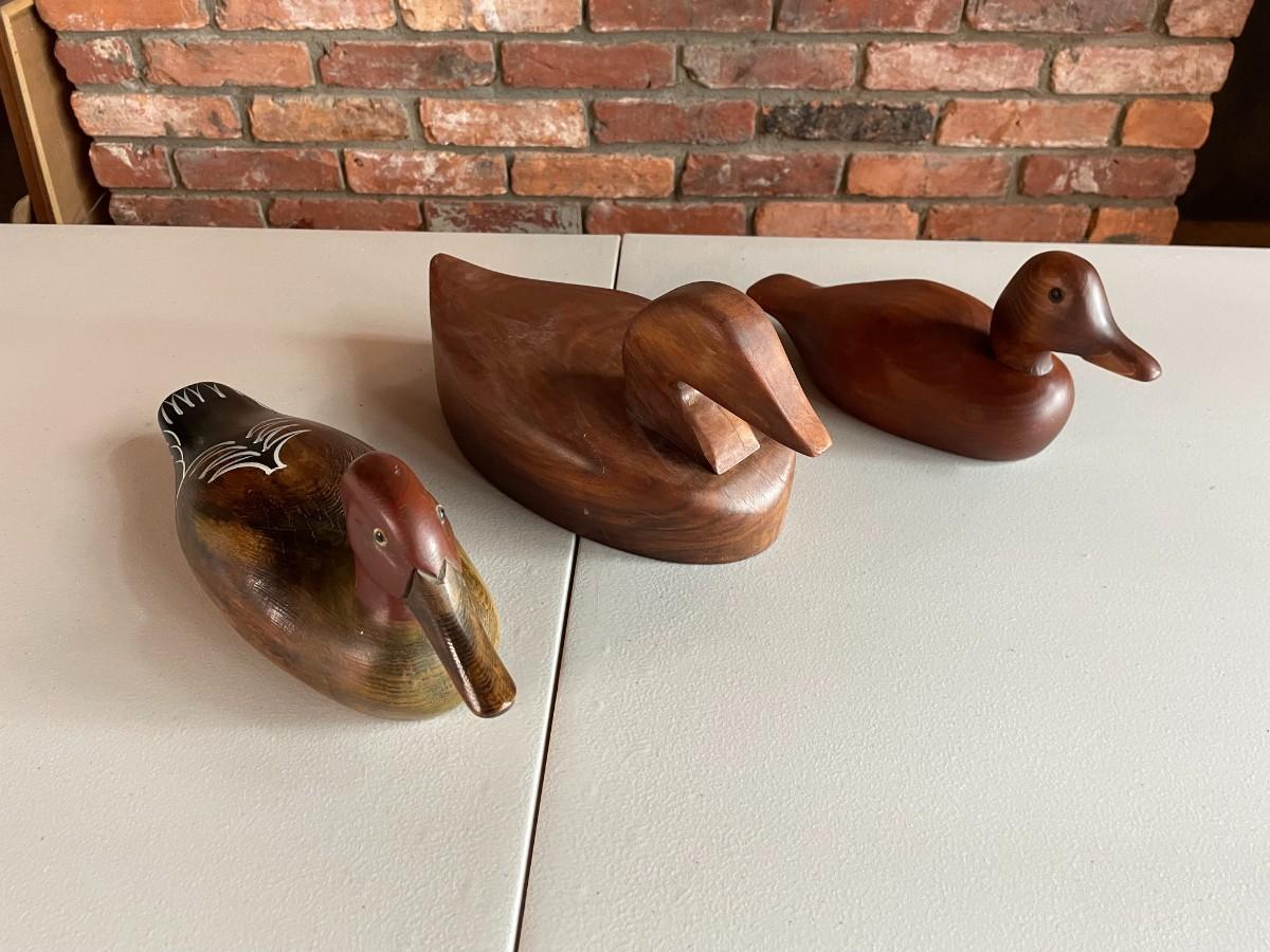 3 wooden carved ducks are available in this lot. Largest: 13 L x 6w x 6H