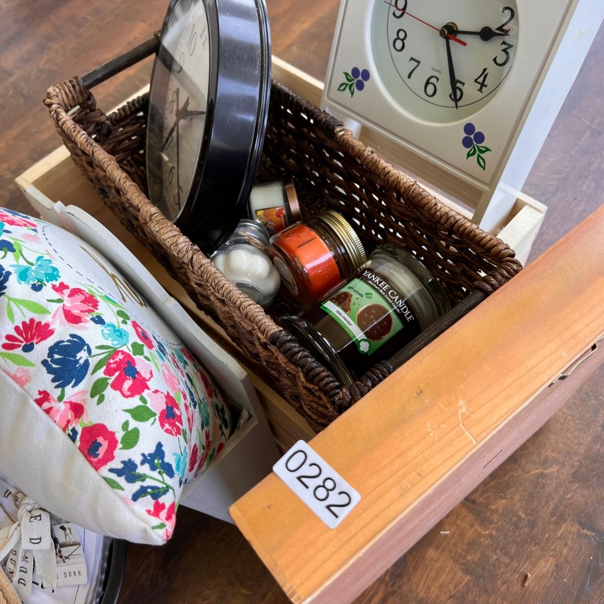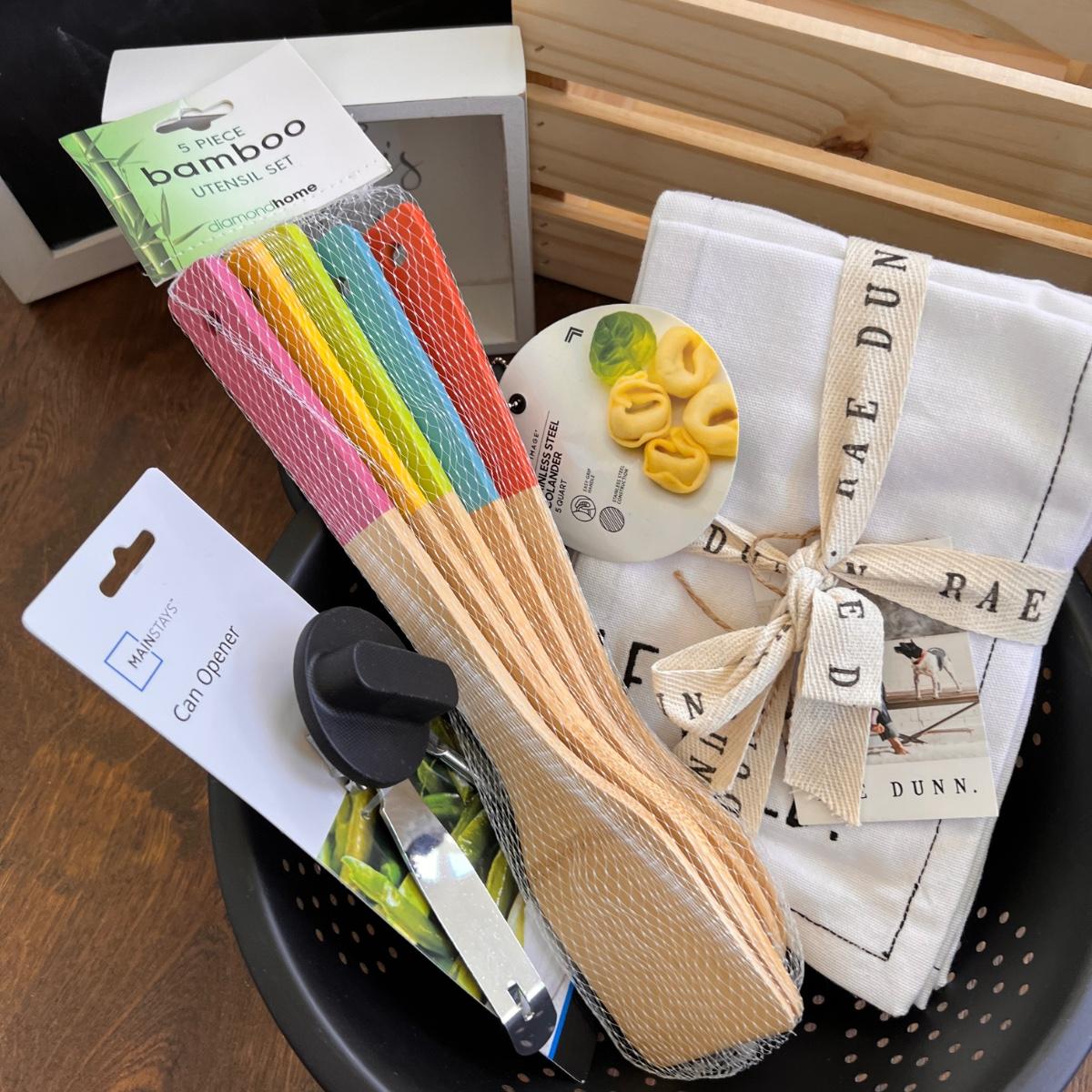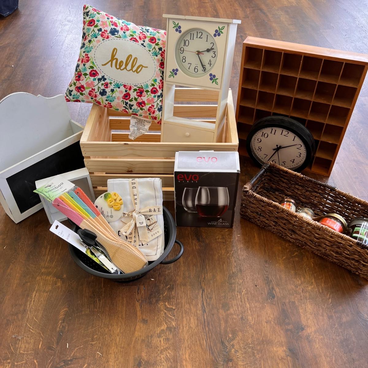 New: candles, metal colander, box of 4 evo wine glasses, bamboo utensil set, can opener, decorative kitchen towels, small wooden wall hanging. Also included pillow, baskets, clock, key hook, etc.