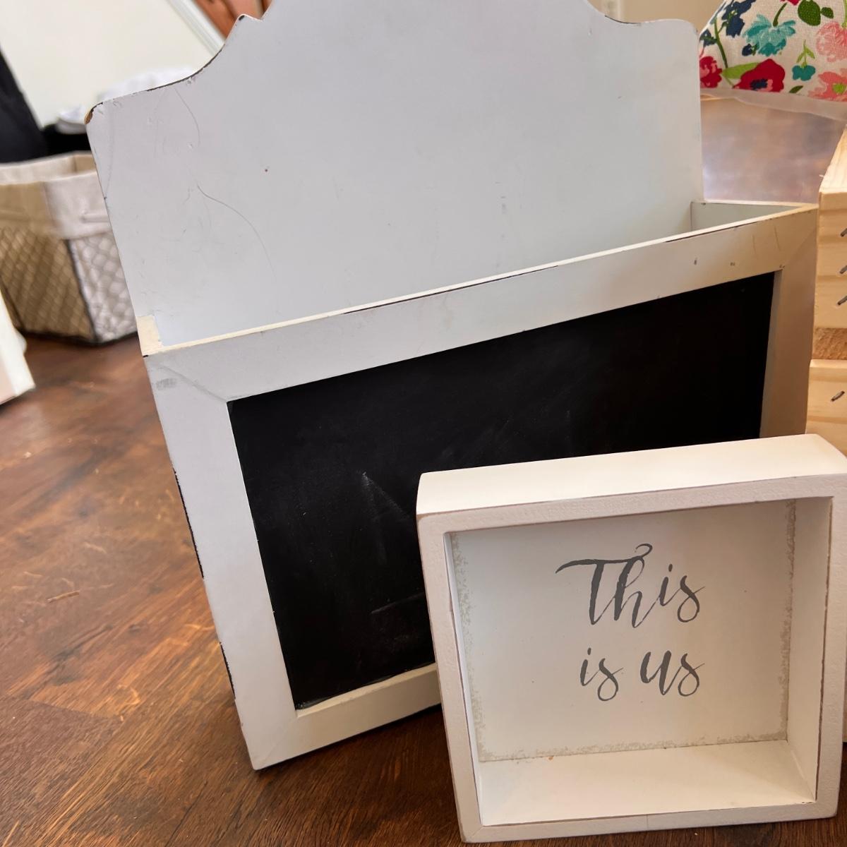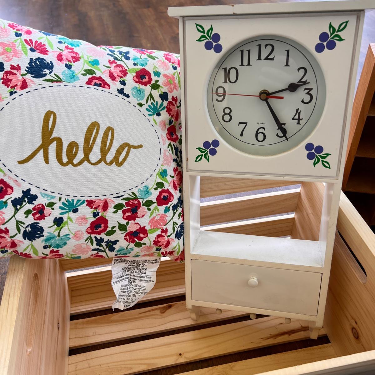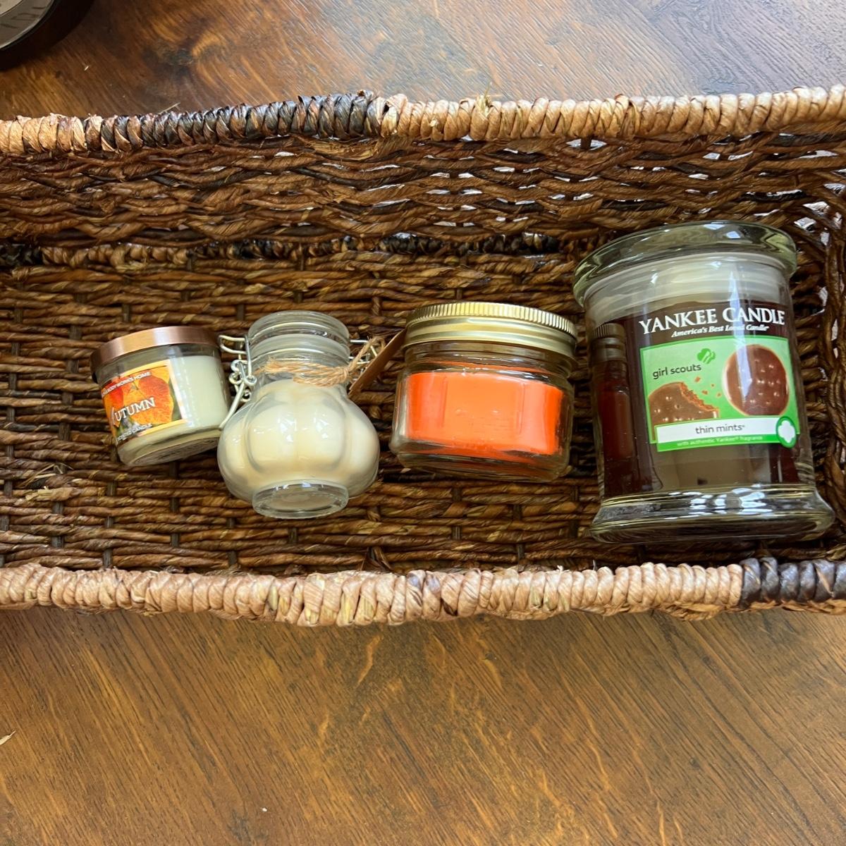 New: candles, metal colander, box of 4 evo wine glasses, bamboo utensil set, can opener, decorative kitchen towels, small wooden wall hanging. Also included pillow, baskets, clock, key hook, etc.