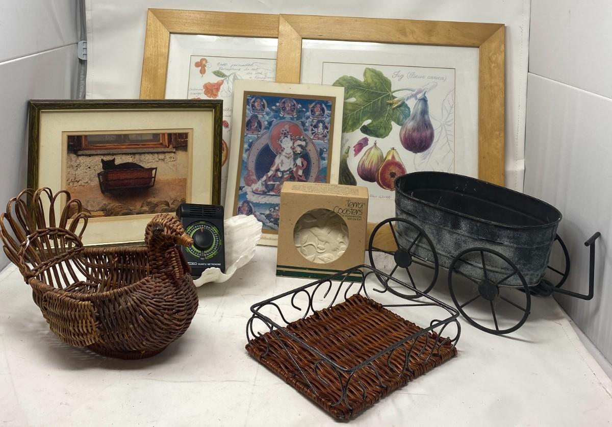 Lot includes framed decorative prints wicker napkin holders and a metronome, not tested