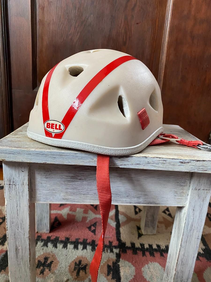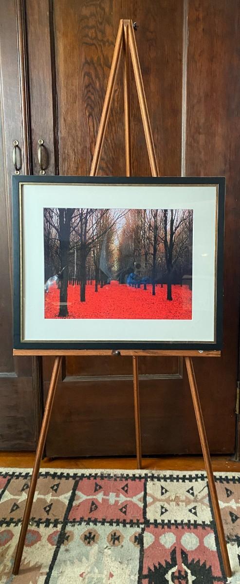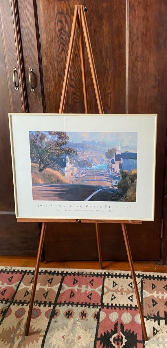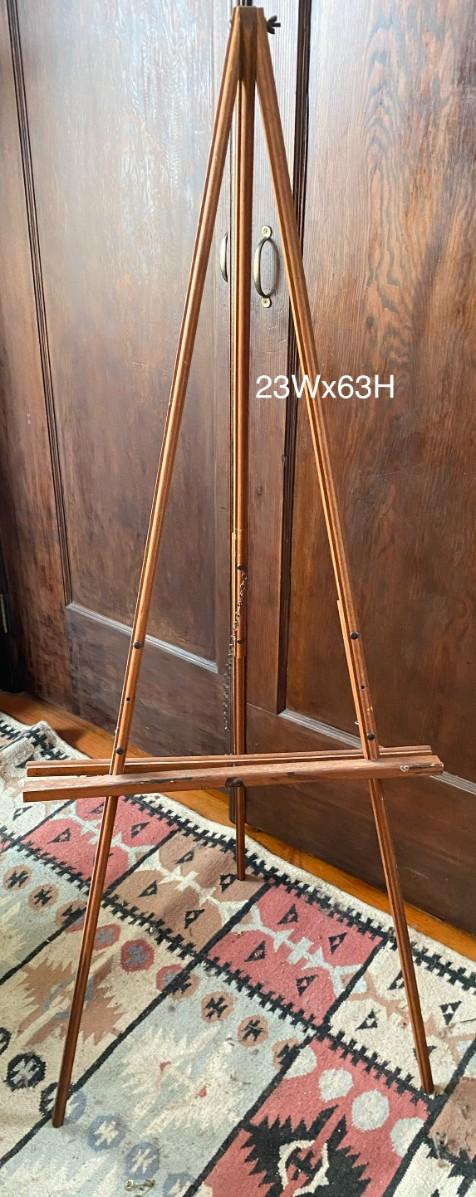this lot includes an artists easel, vintage bike helmet and Tennis racket, 2 framed prints and a small blue painted wood plant stand
