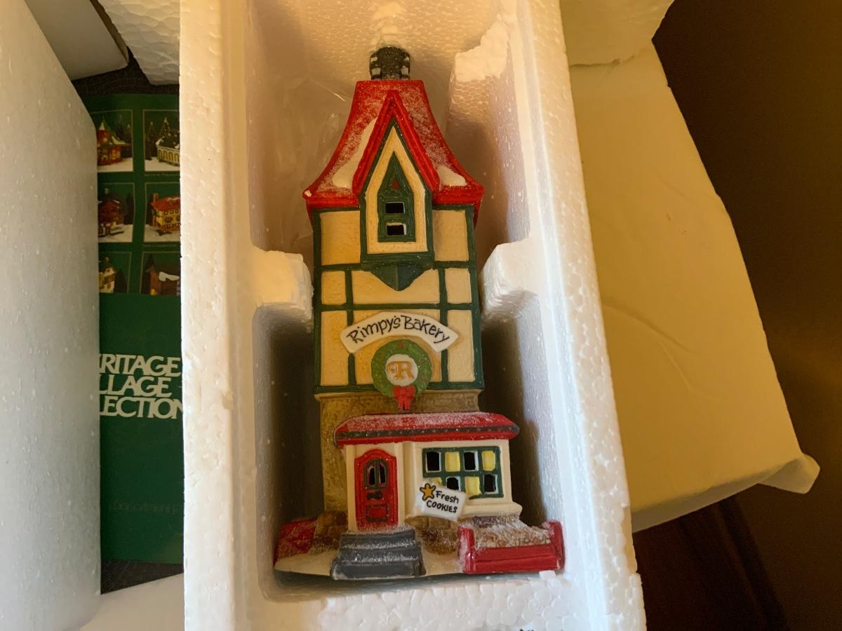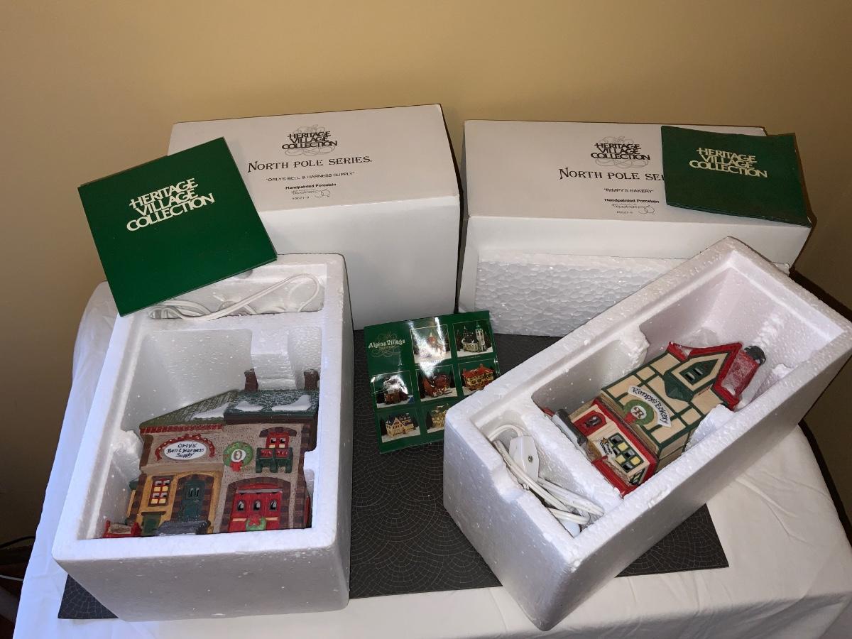 Lot of department 56 Heritage Village collection North Pole series. Orlys bell and harness supply And Rimpys Bakery. Original boxes included please see pictures for condition. If item is electrical, it has not been tested to or verified if working. All Sales Final