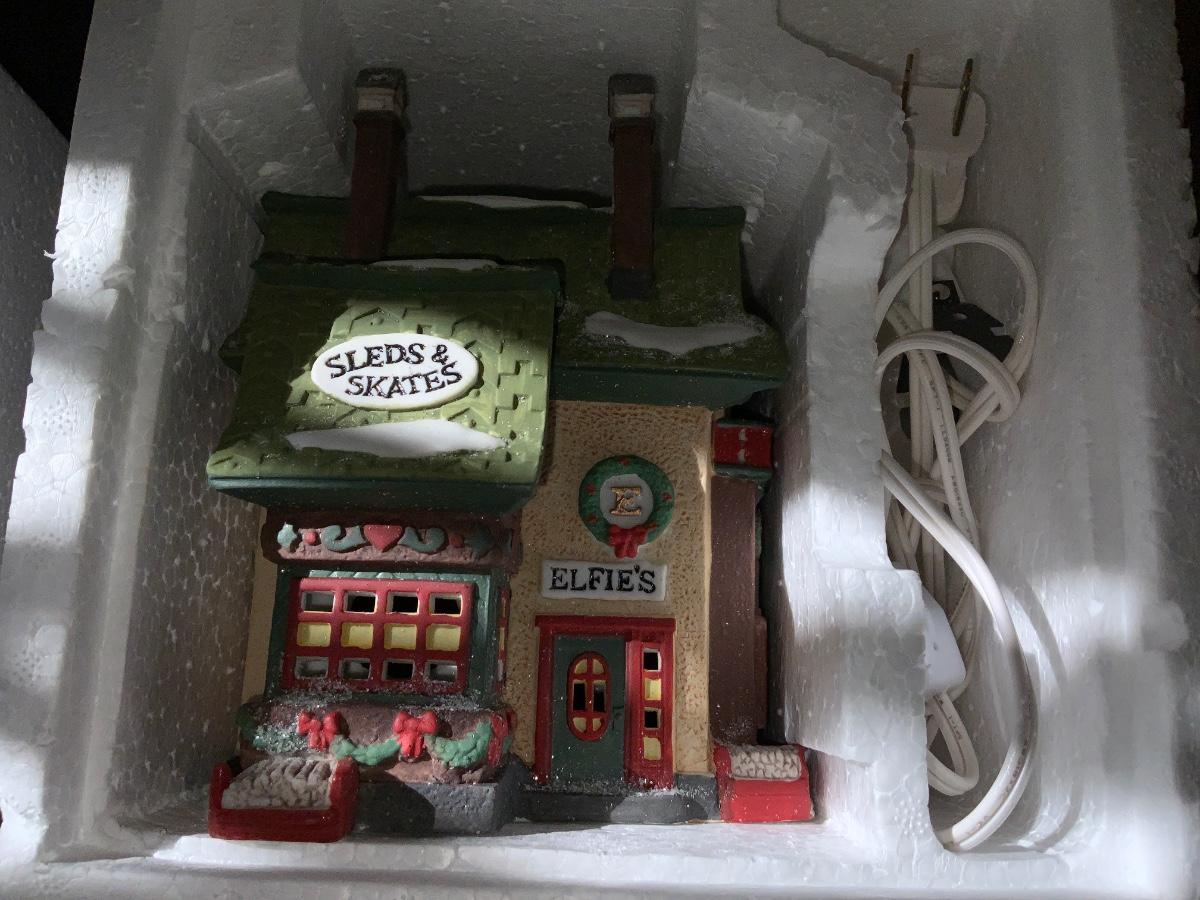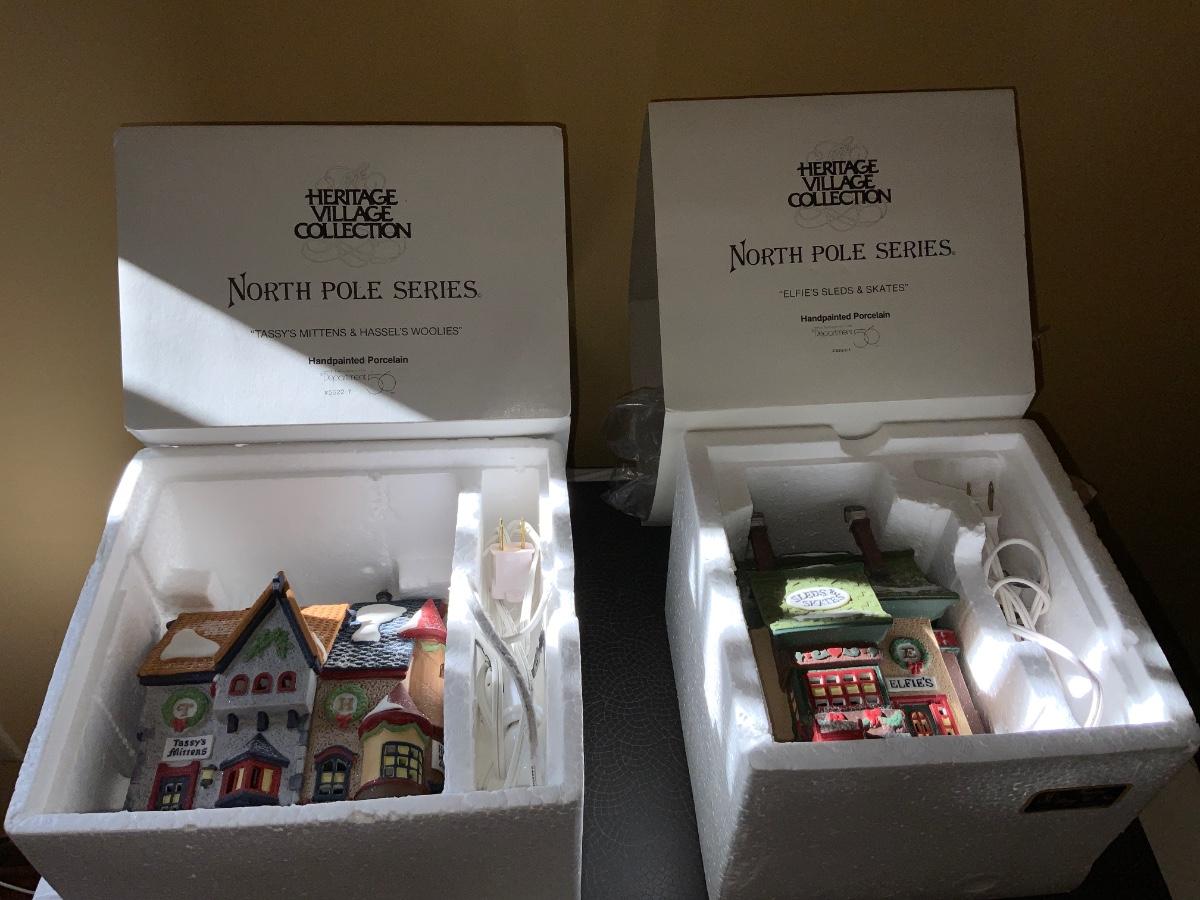 Lot of department 56 Heritage Village collection North Pole. Tansy’s, mittens, and hassles woolies elfie’s sleds and skates both items come with their original boxes please see photos for condition