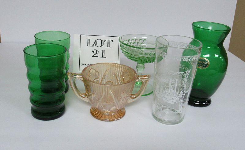Depression Glass Forest Green Tumblers, Iris & Herringbone Creamer, Aunt Polly Sherbert, Forest Green Vase, Mississippi Tumbler