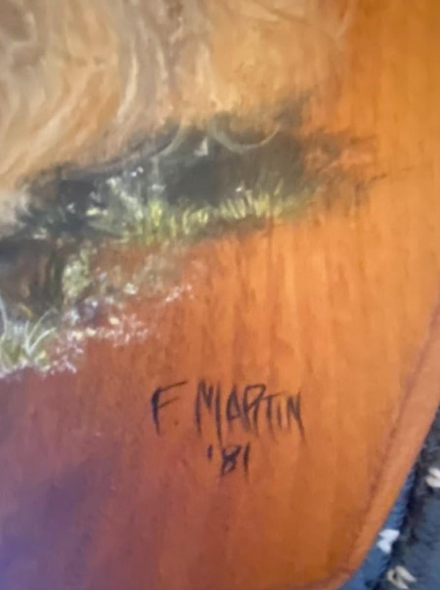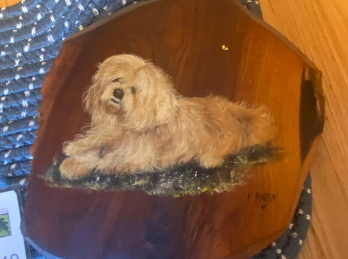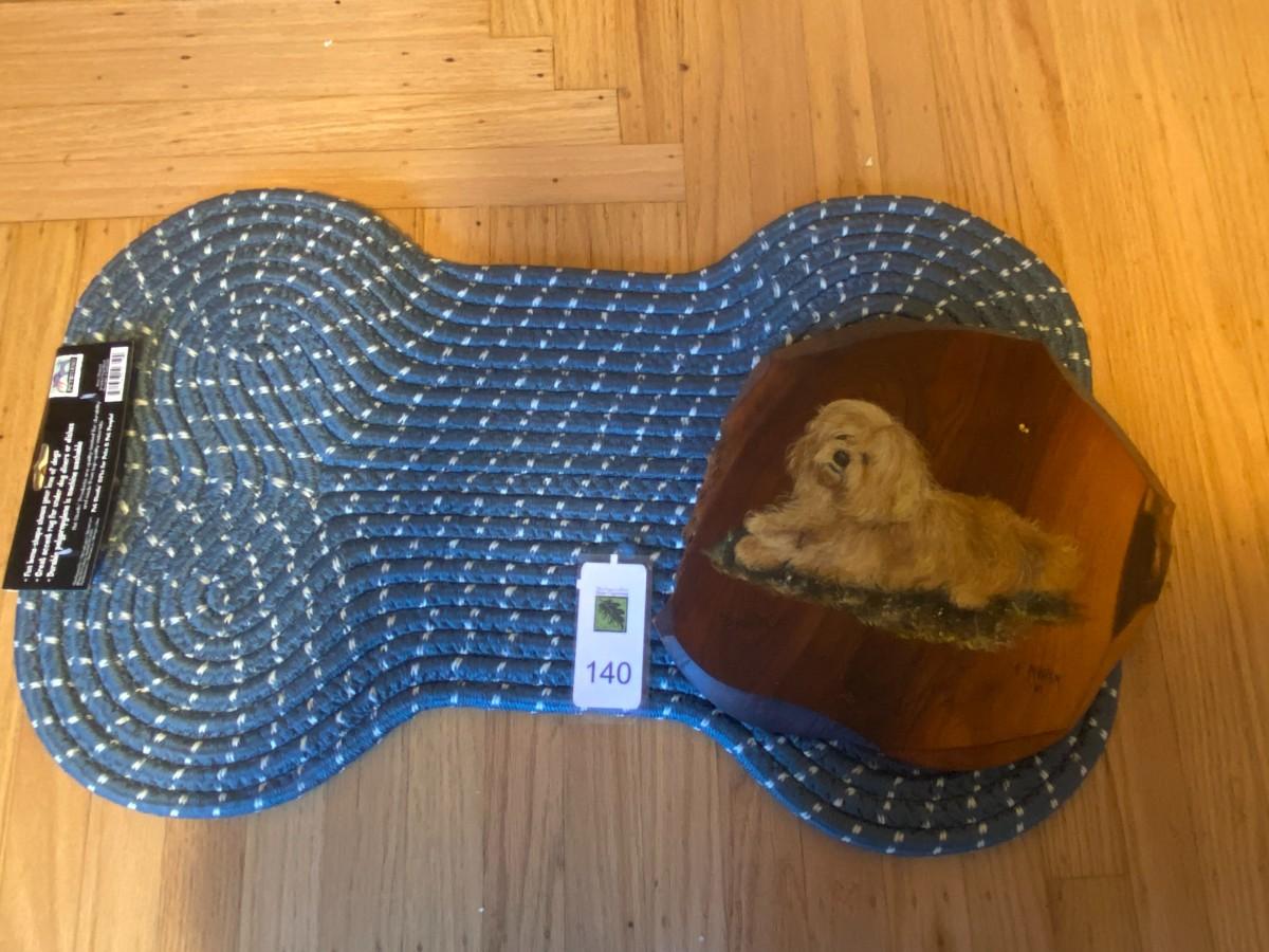 Braided dog mat and wooden dog painting by R. Martin