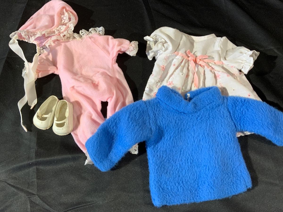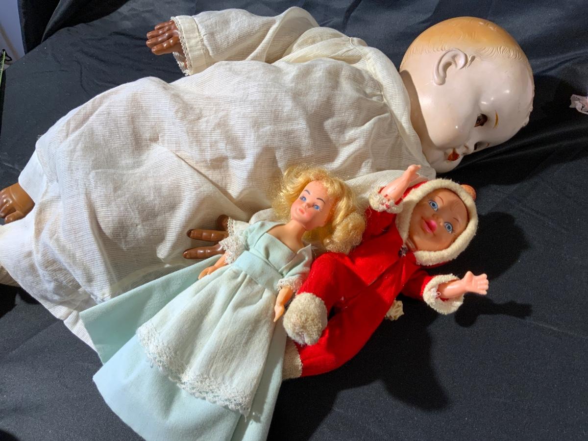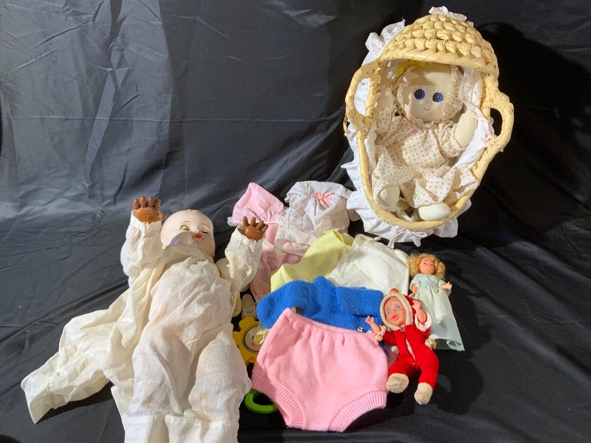 Lot of Dolls and Doll Clothes, Including a dolly bed