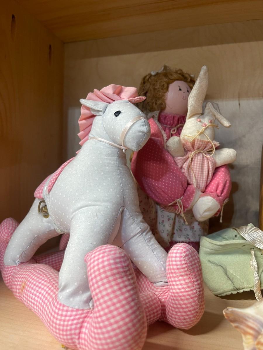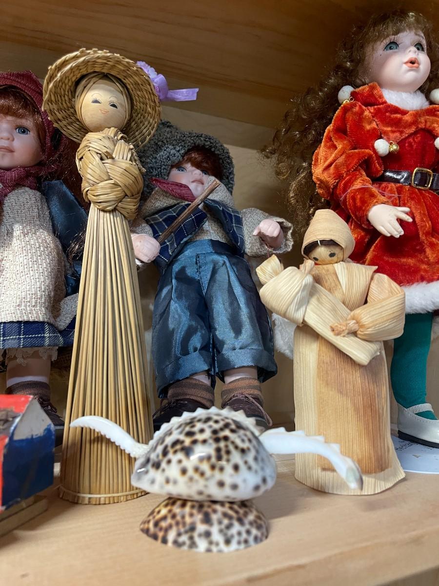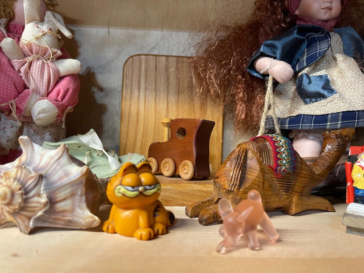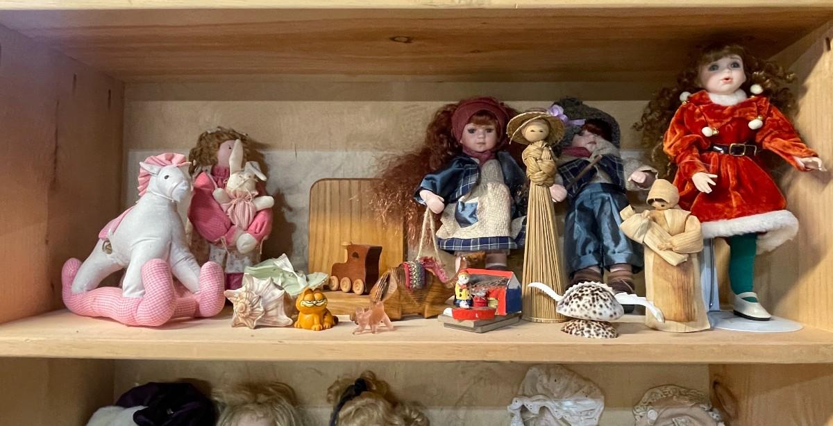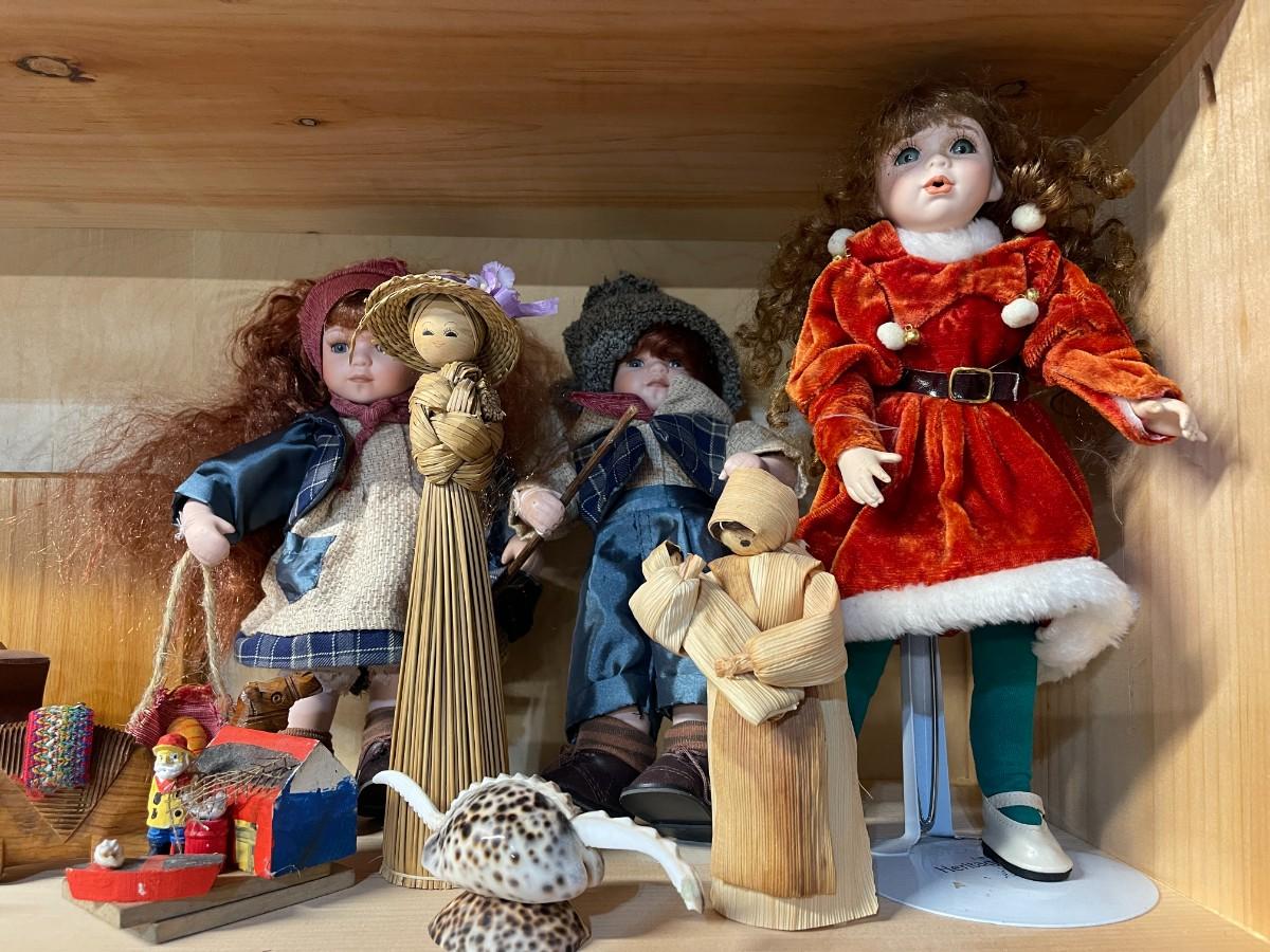 Lot of assorted dolls and miscellaneous all included on this top shelf.