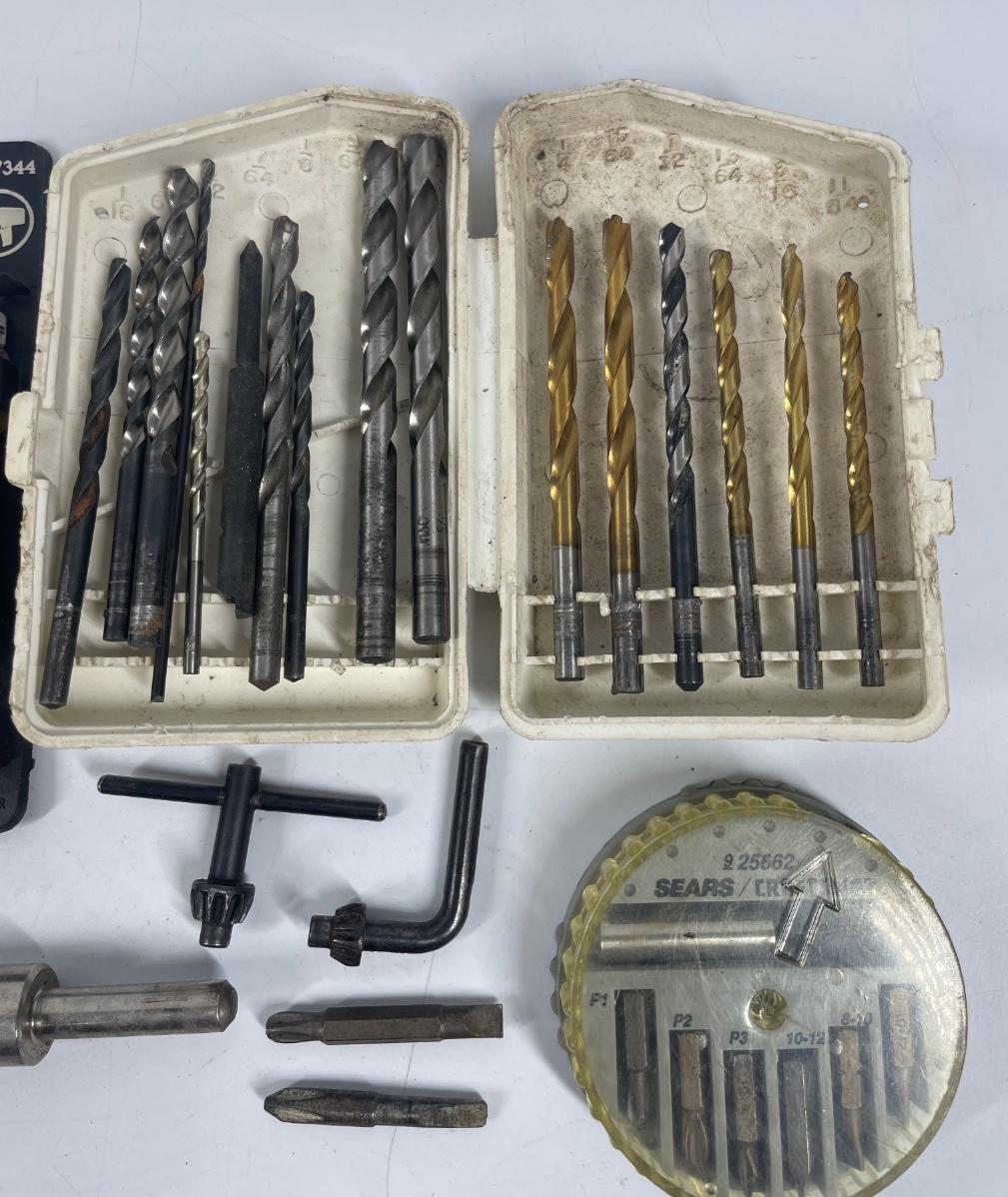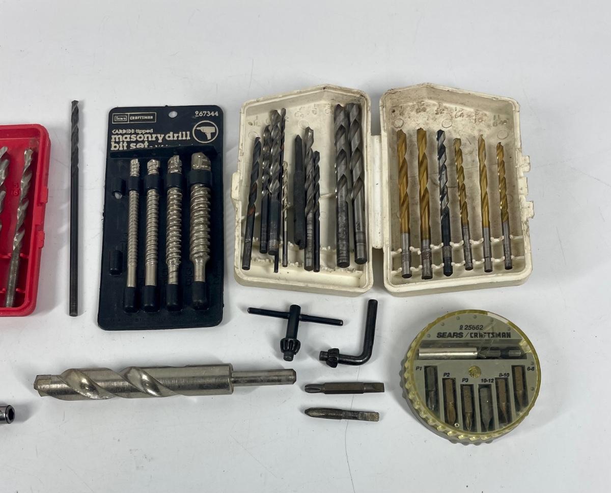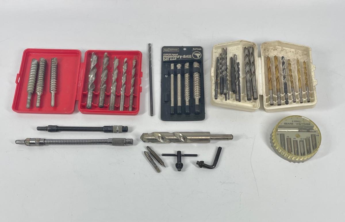 Lot of Drill Bits and Accessories. Over 30 items, assorted types and sizes. Includes several masonry drills. Plastic drill bit cases included.