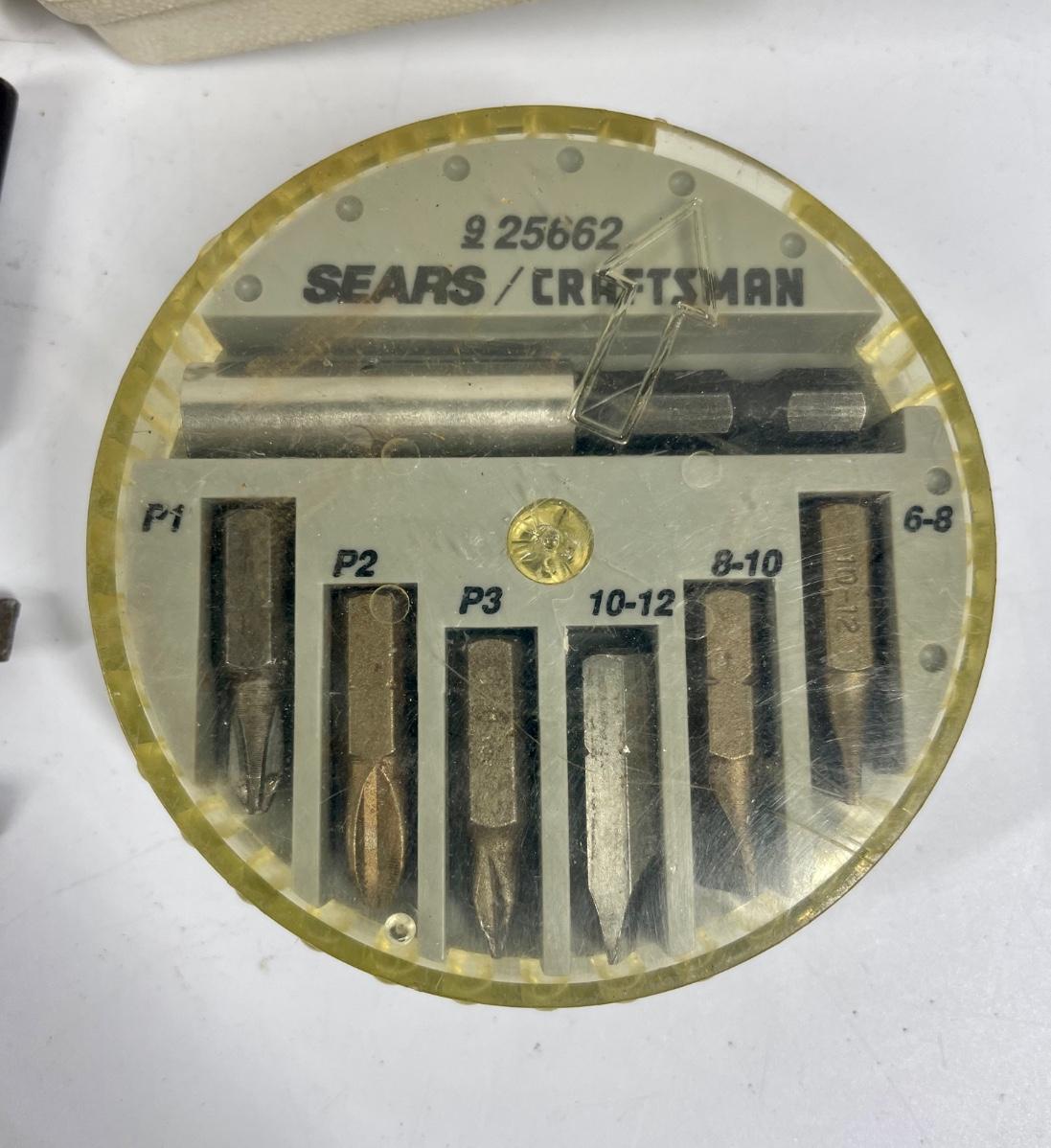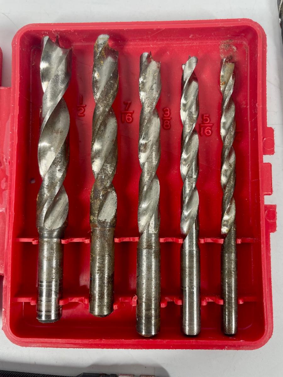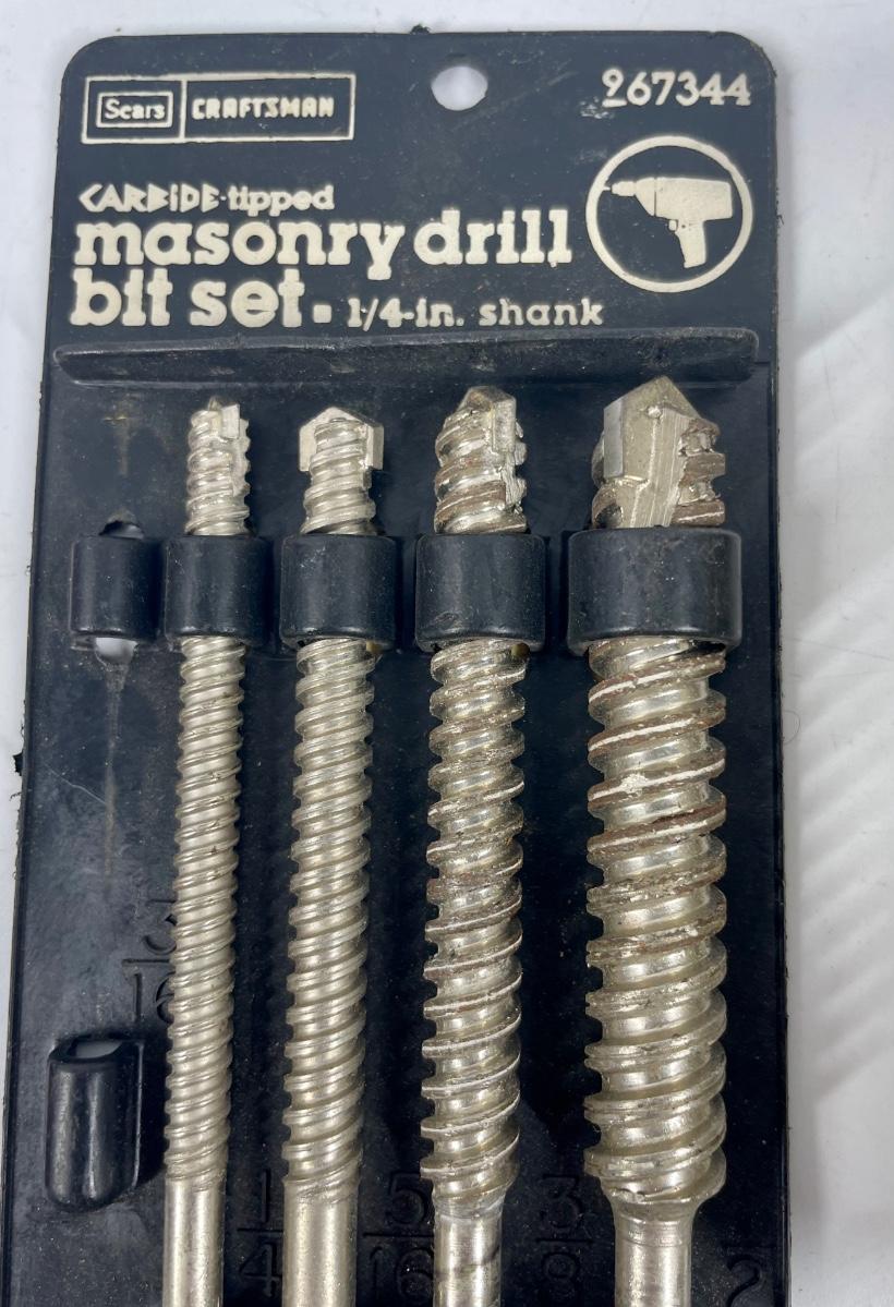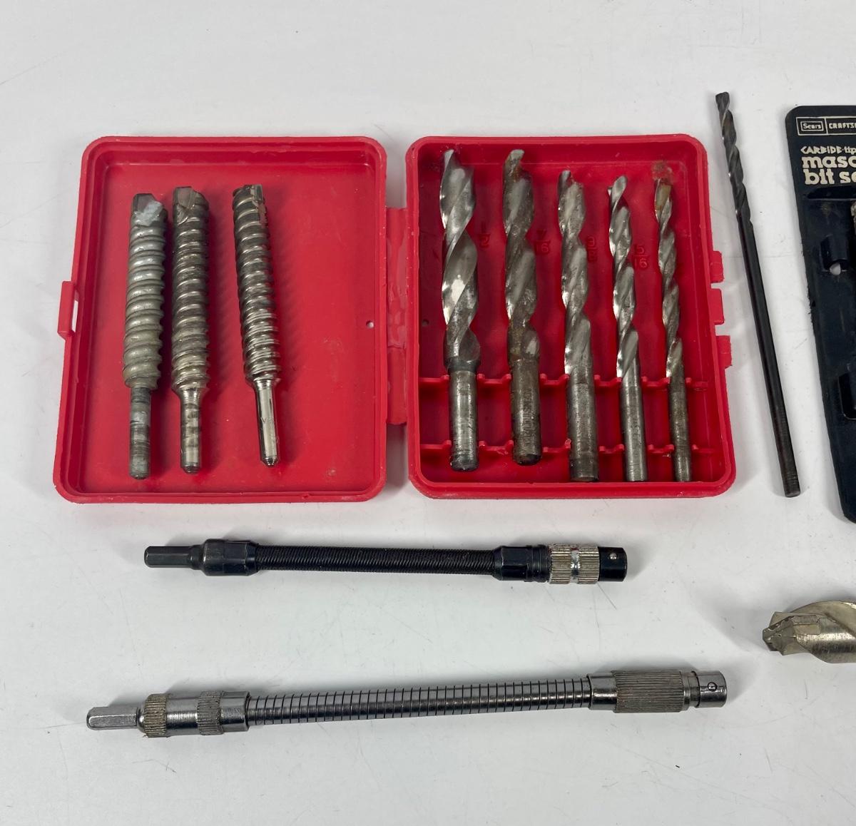Lot of Drill Bits and Accessories. Over 30 items, assorted types and sizes. Includes several masonry drills. Plastic drill bit cases included.