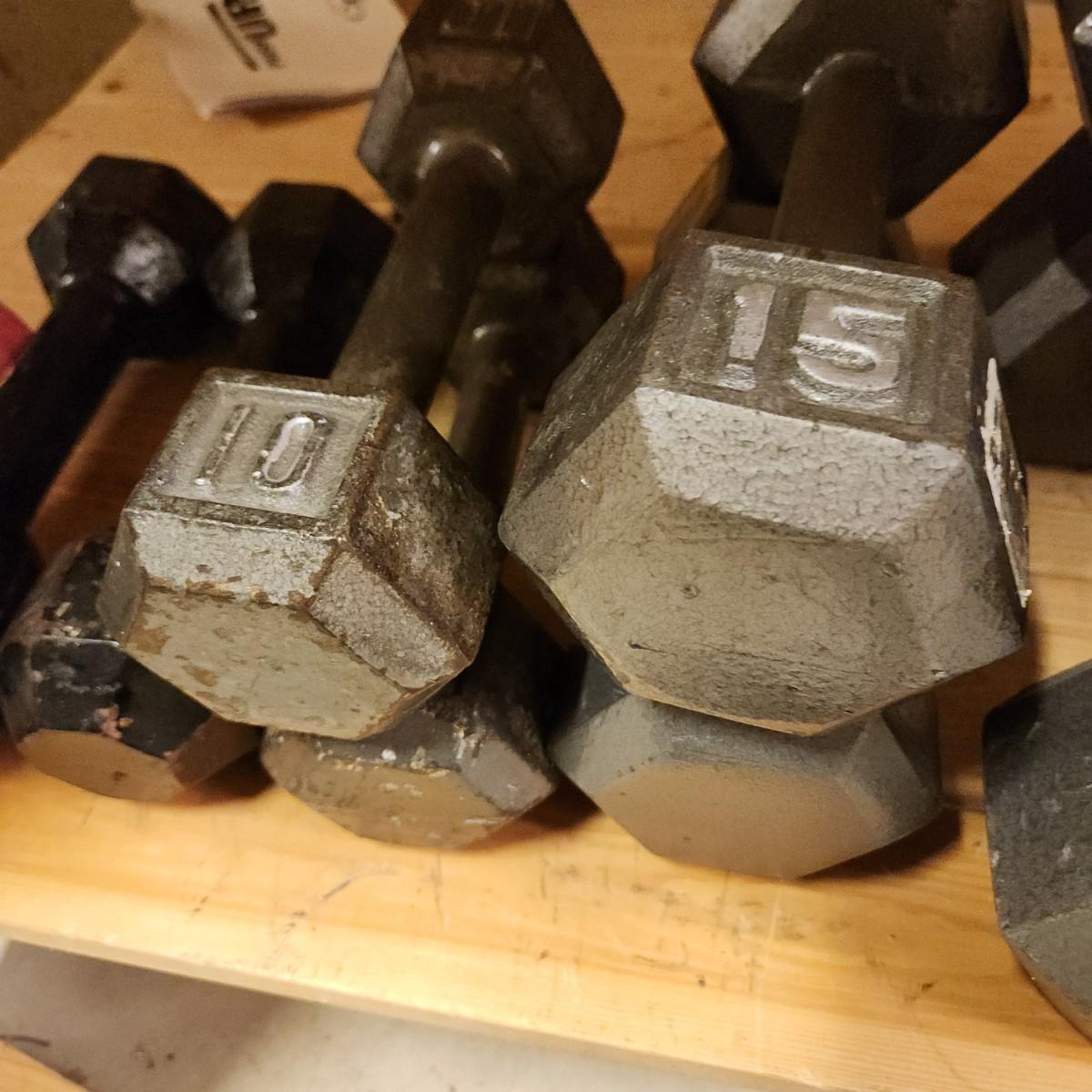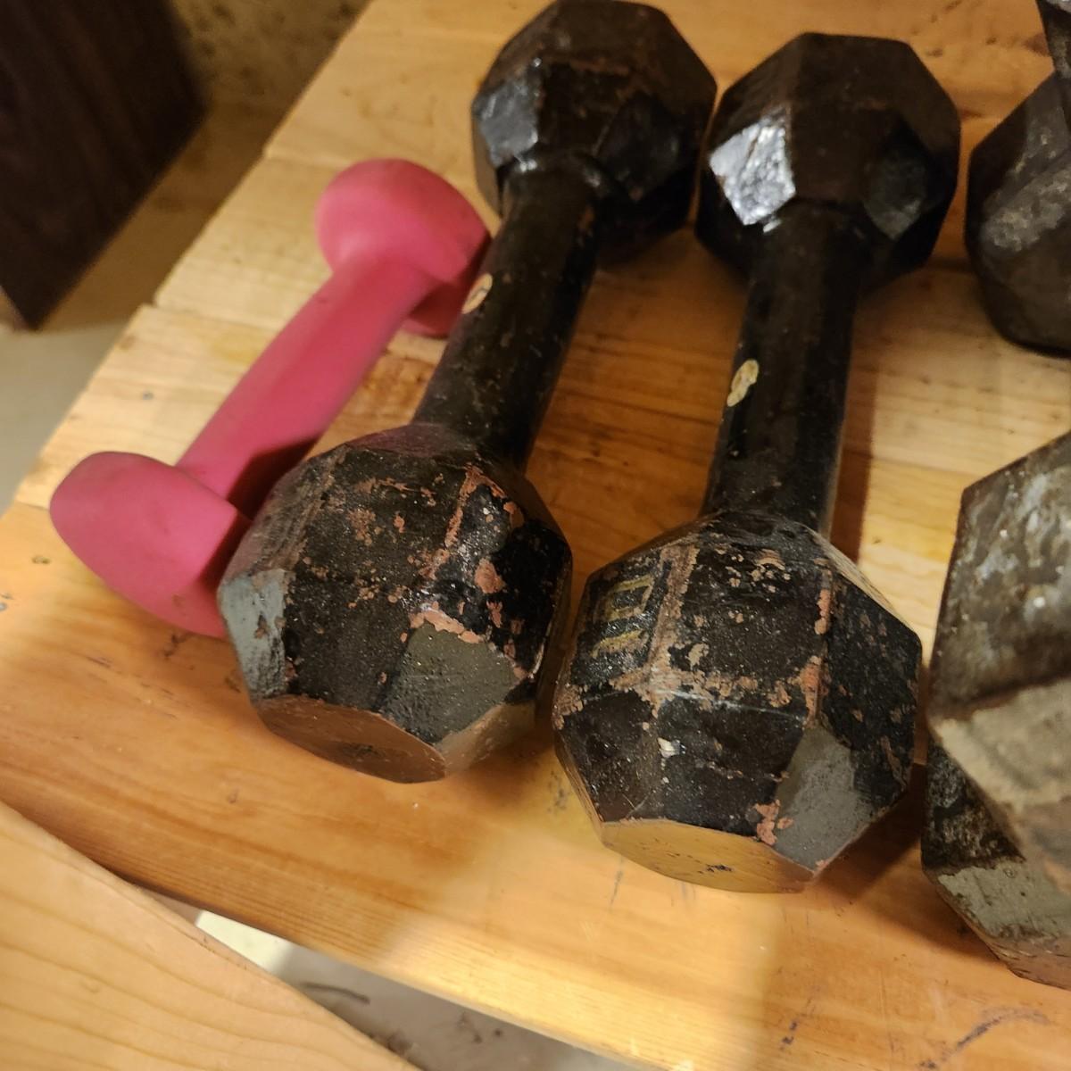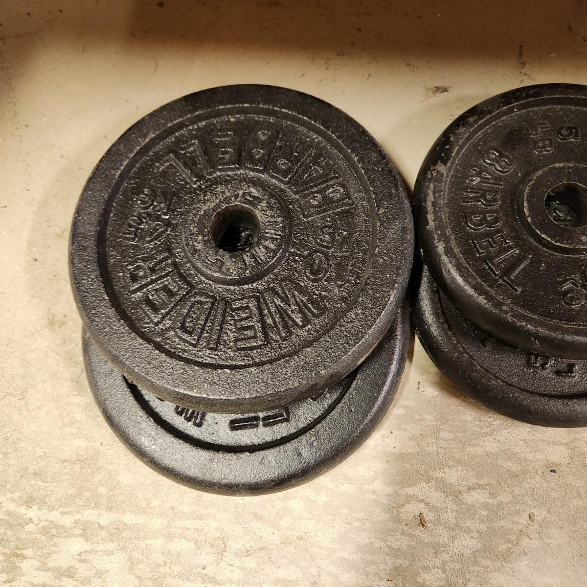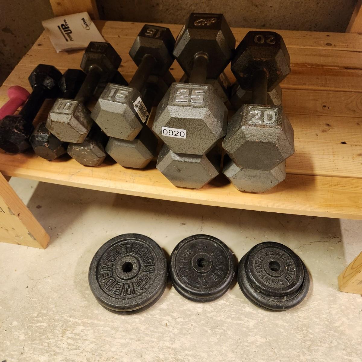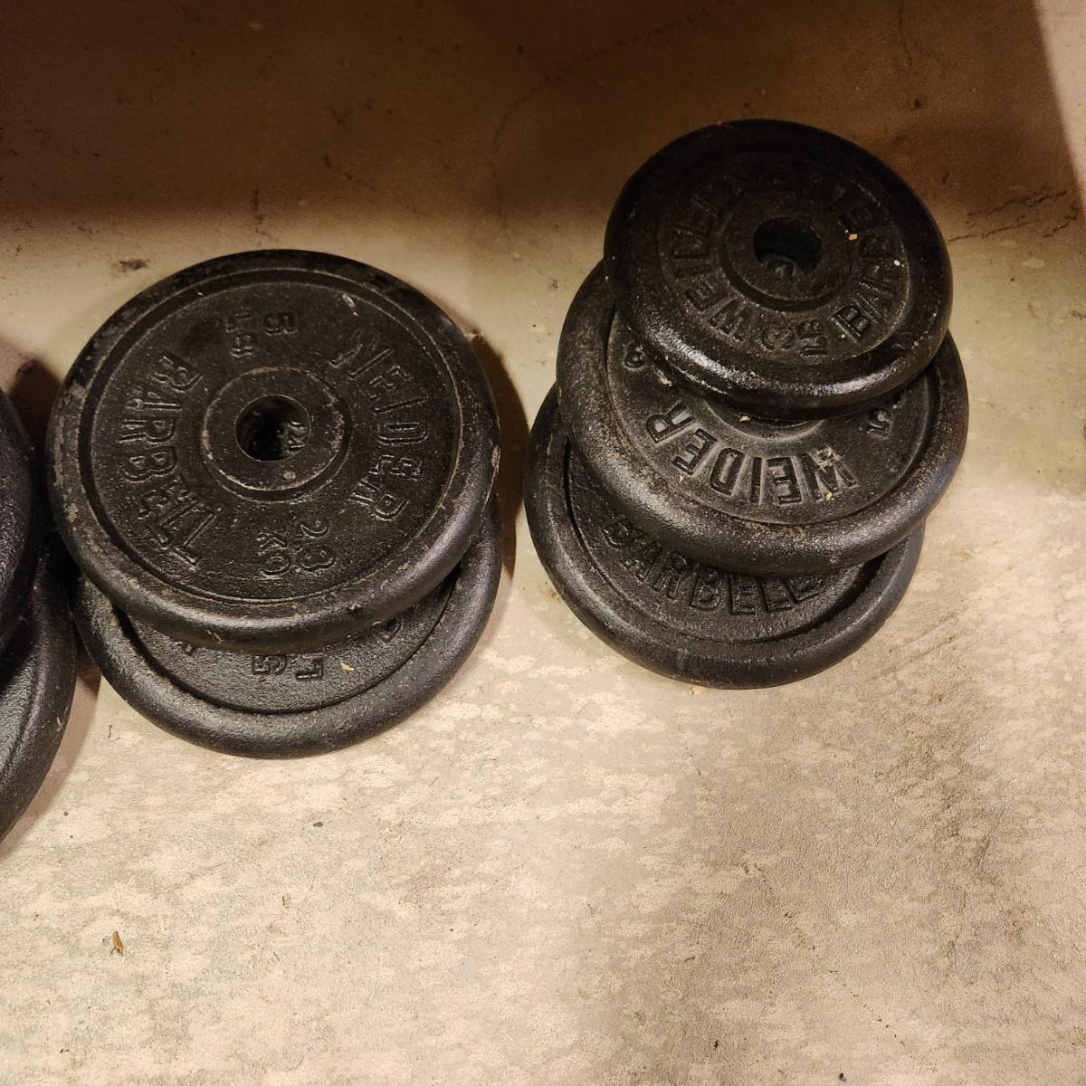 Lot of Dumbbells and Weider Barbell Weights 10,15,20,25