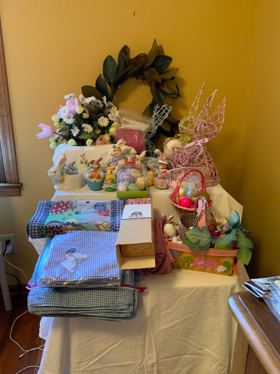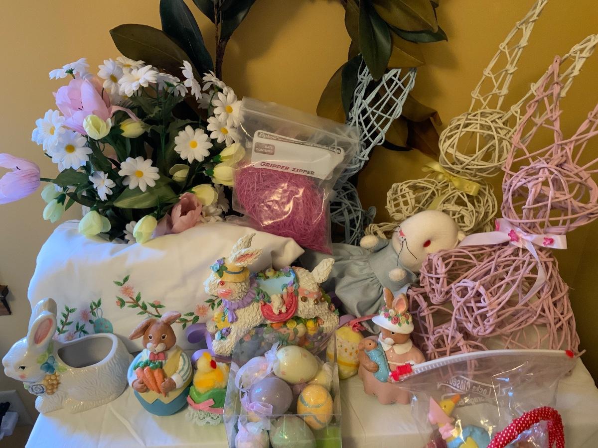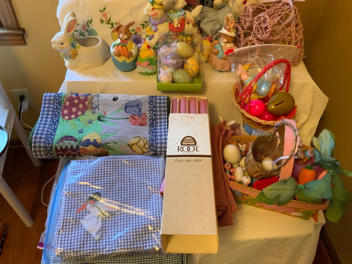 Large lot of Easter items. Includes table clothes, baskets, bunny’s and so much more! Please see pics for items included and condition