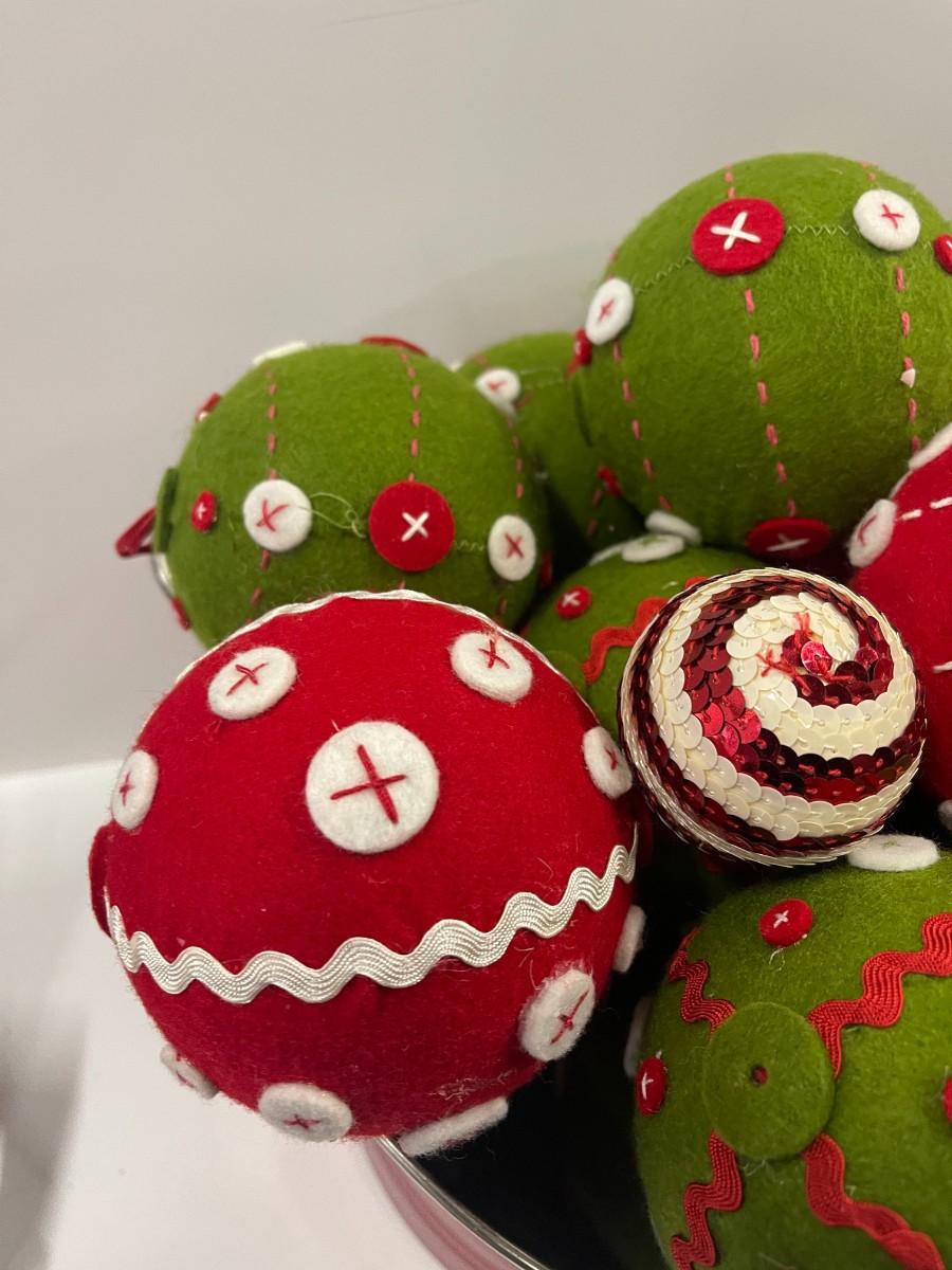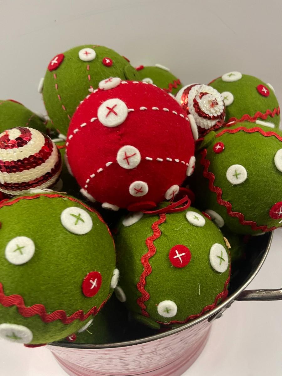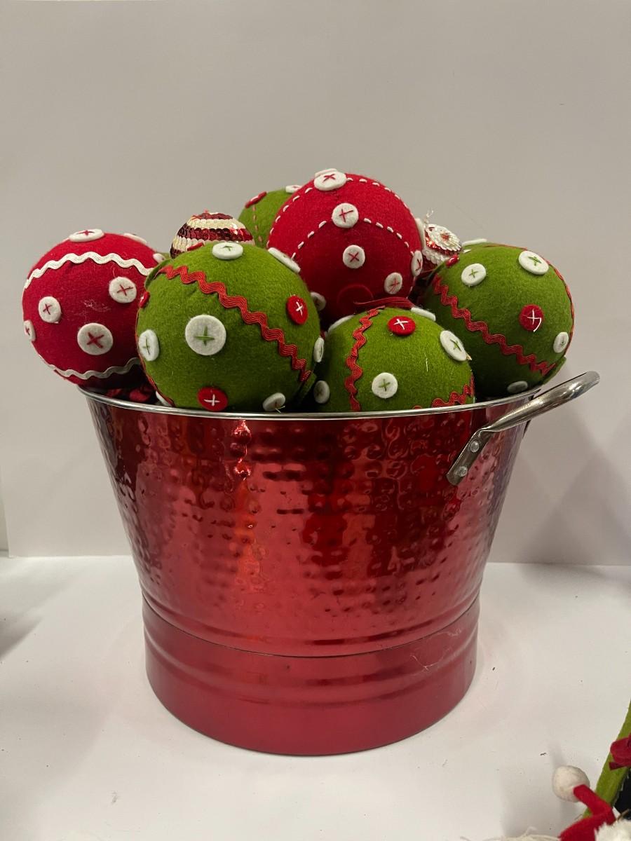 Lot of red and green fabric Christmas ornaments. Paired with a red hammered metal bucket. Bucket is 9" x 16"
