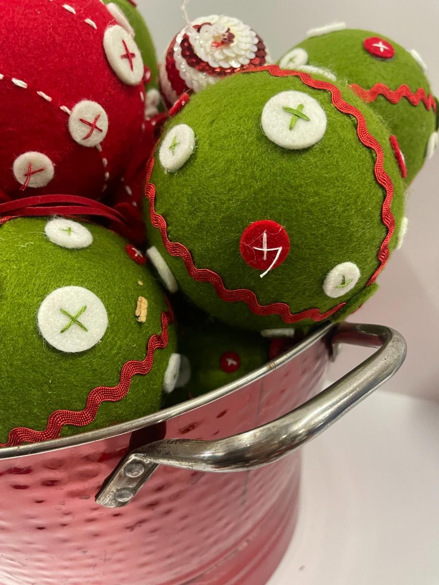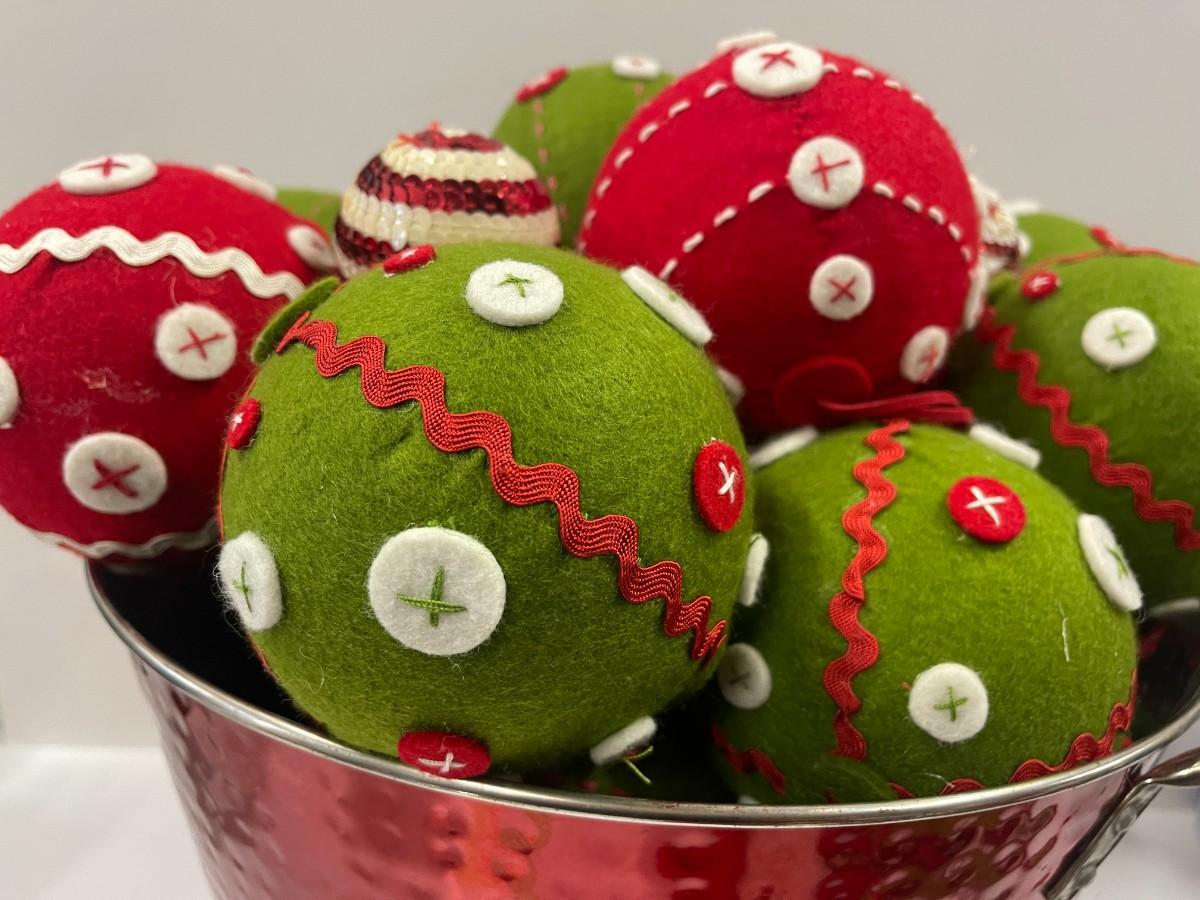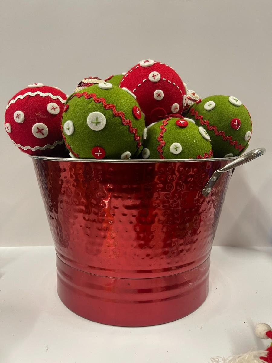 Lot of red and green fabric Christmas ornaments. Paired with a red hammered metal bucket. Bucket is 9" x 16"