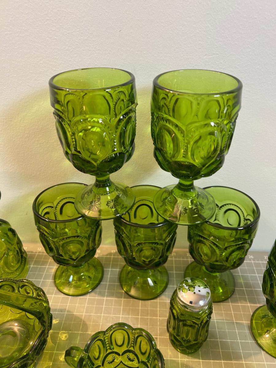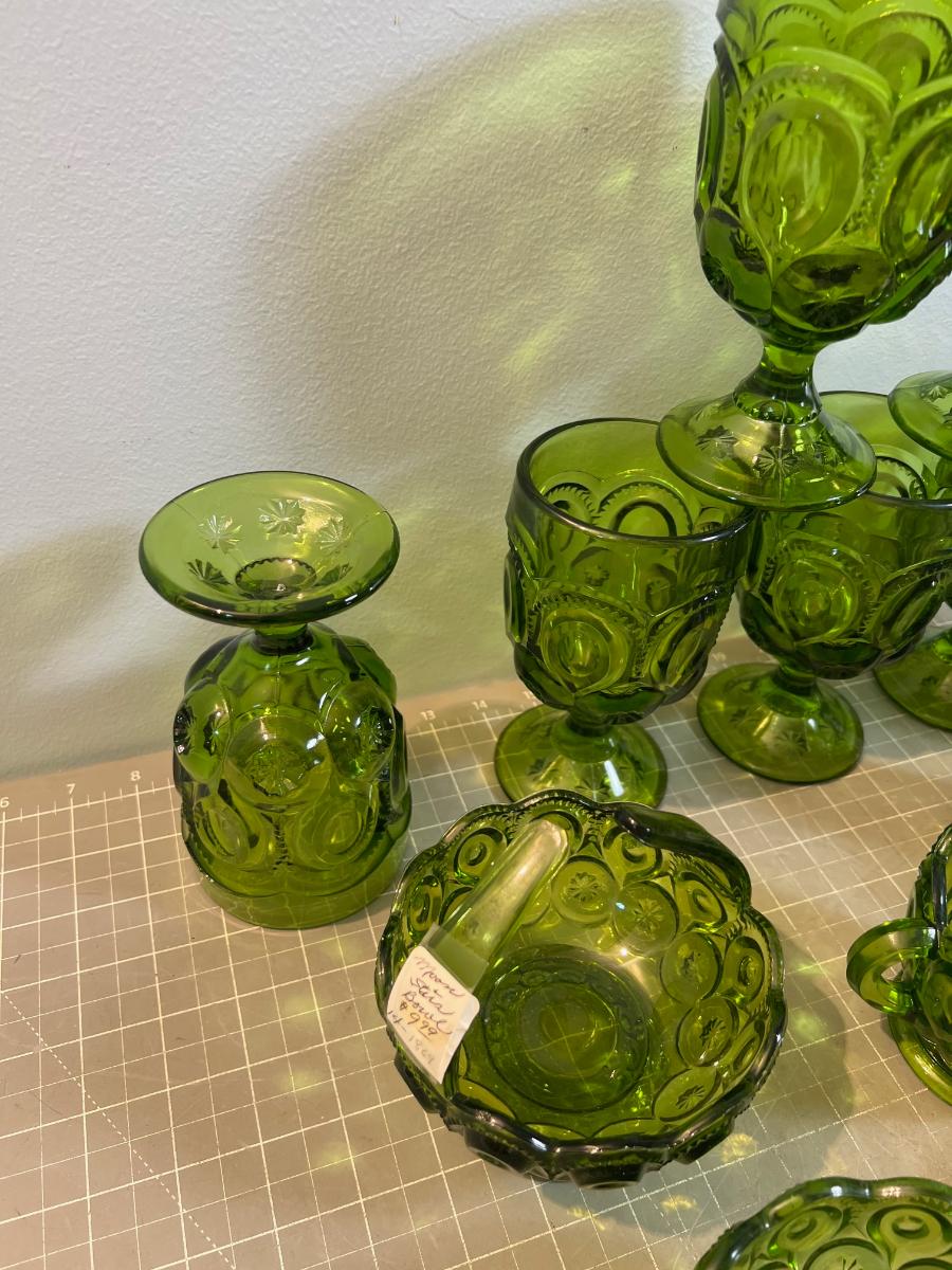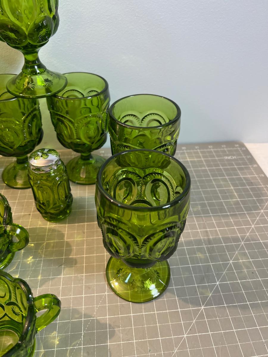 Lot of Fabulous L E Smith Moon & Stars  GREEN Goblets, S&P, Cream & Sugar, Candy
