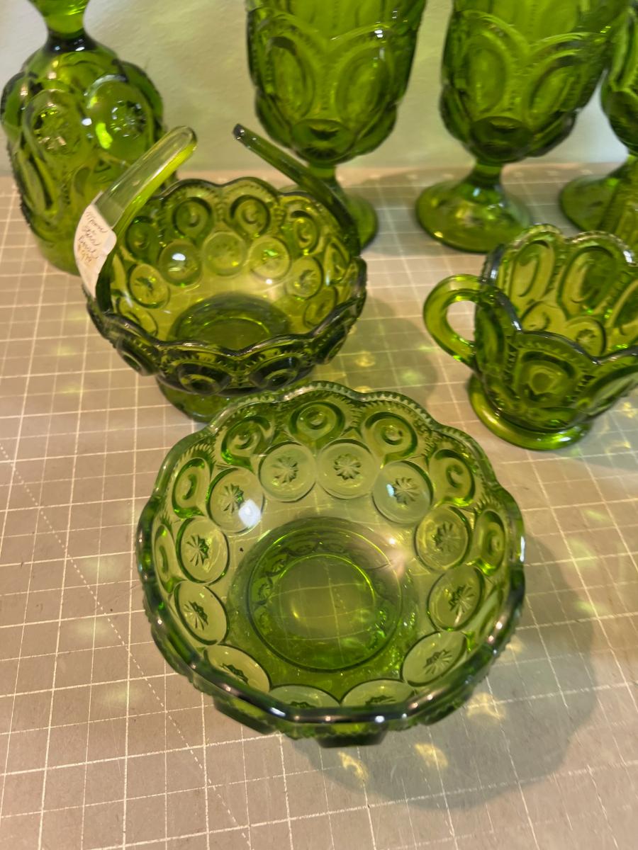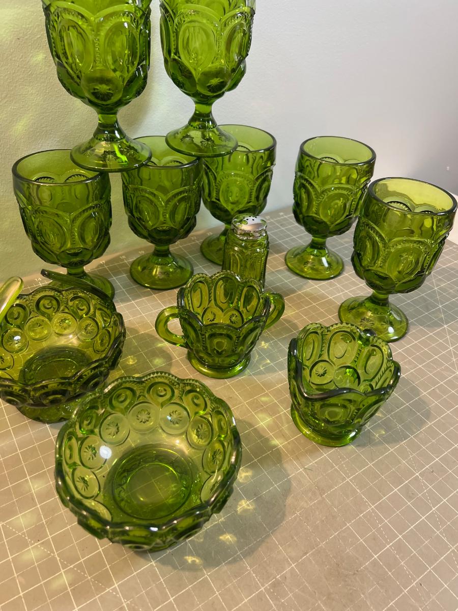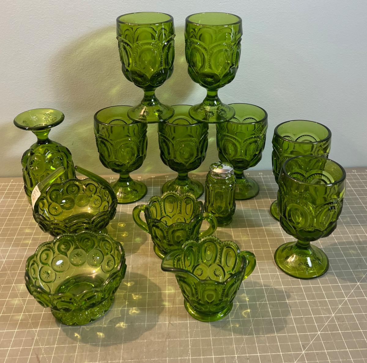 Lot of Fabulous L E Smith Moon & Stars  GREEN Goblets, S&P, Cream & Sugar, Candy