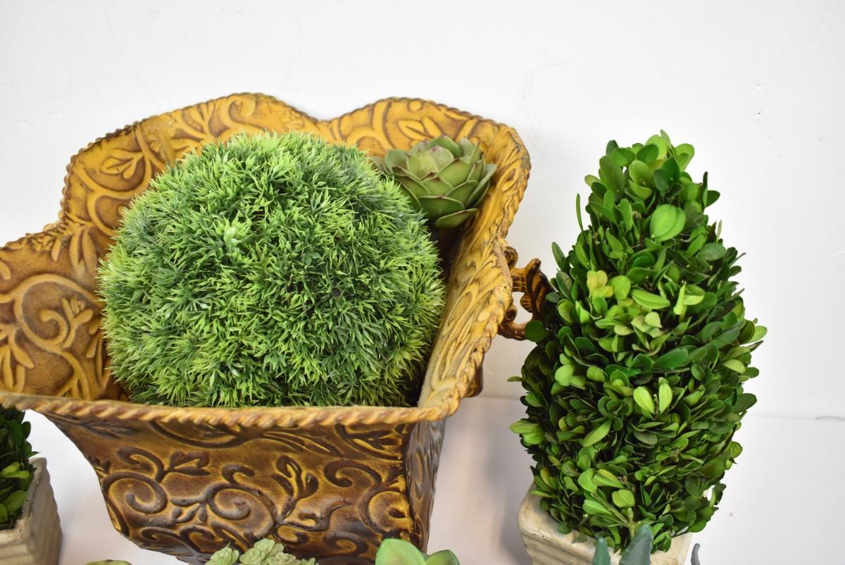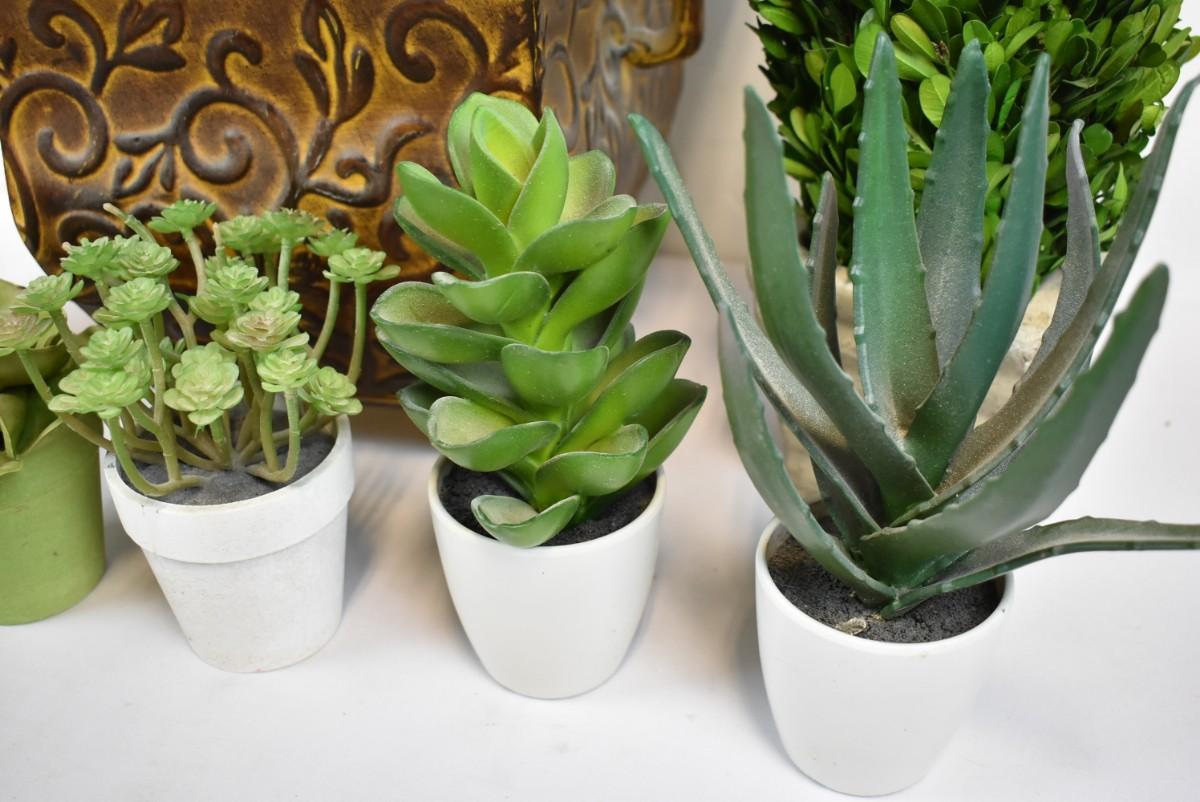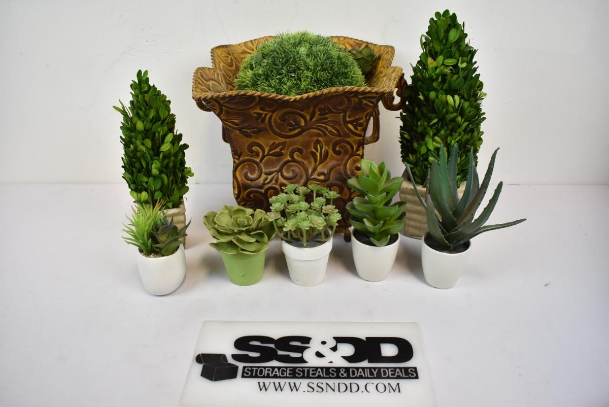 Lot of Fake Plants: Grass Ball, Gold-Toned Planter, Tiny Trees, Snake Plant, Succulents