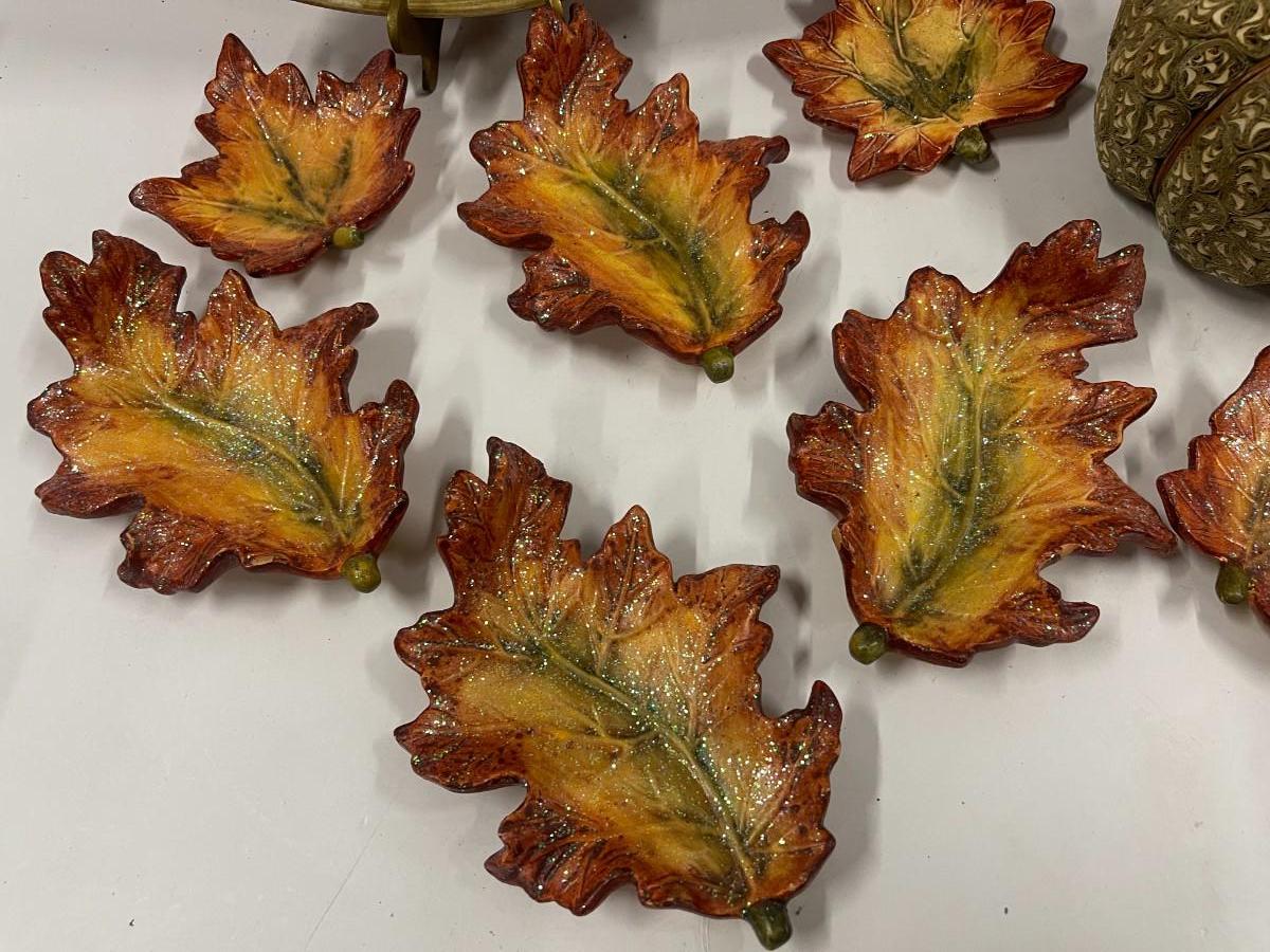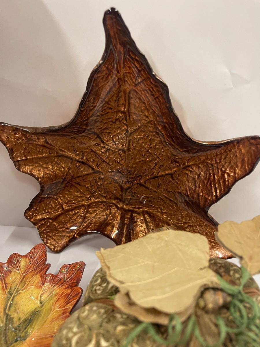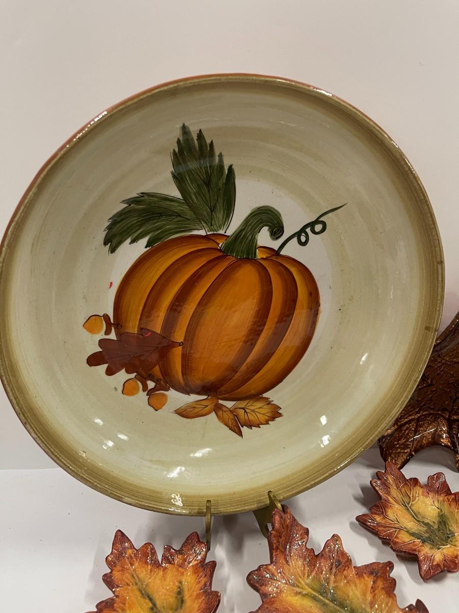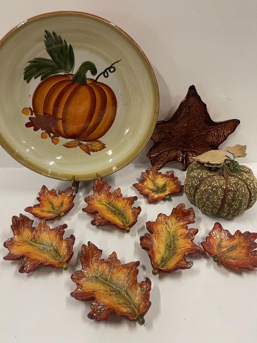 Lot of fall decor. Includes: large ceramic serving bowl with hand painted pumpkin design (12 1/2"), 7 small ceramic leaves, reverse painted leaf plate and small fabric pumpkin.