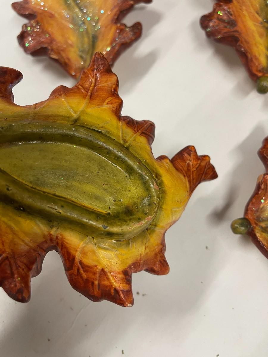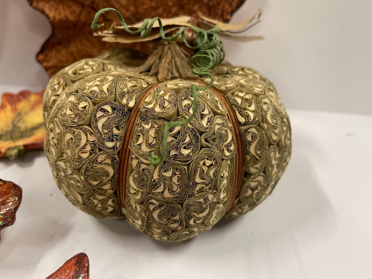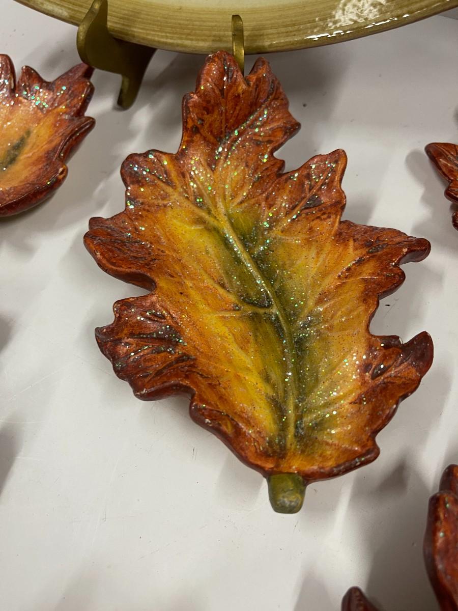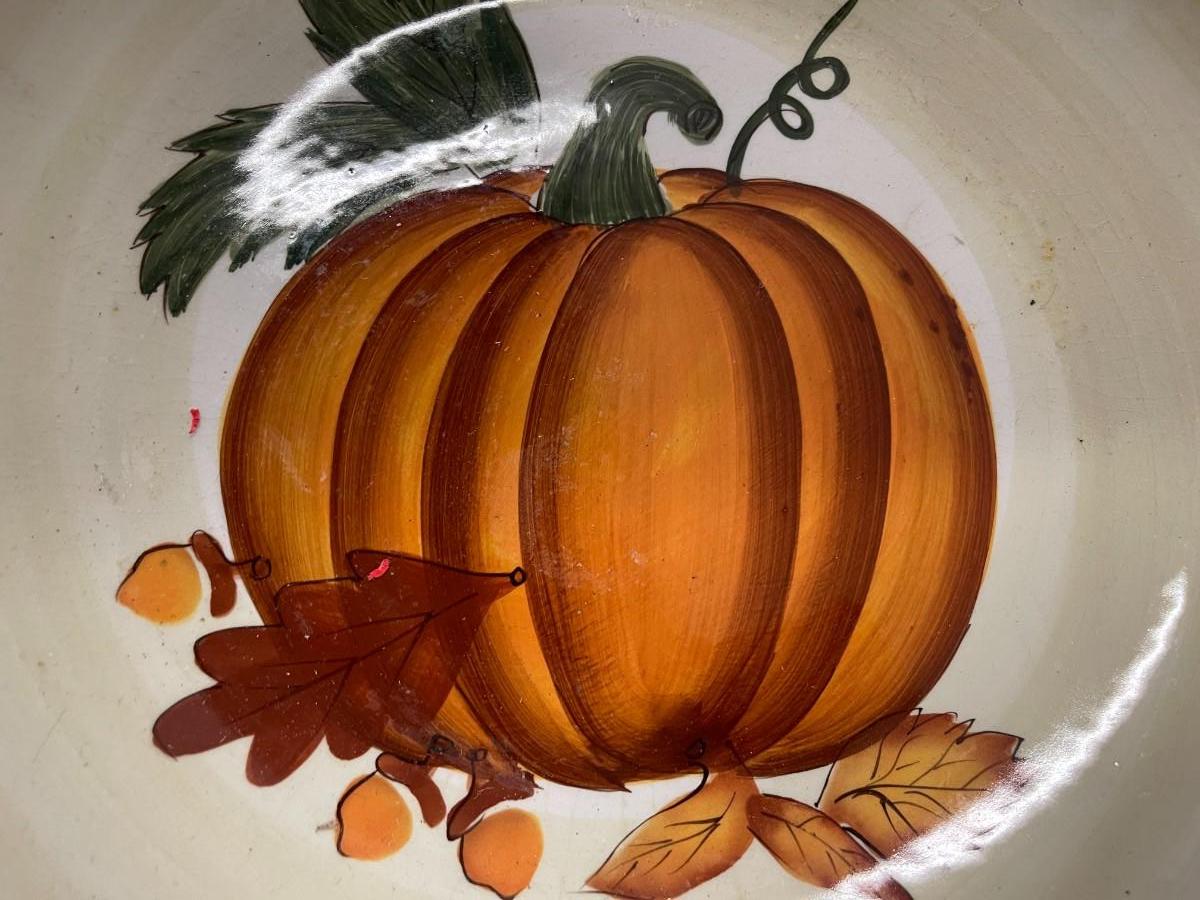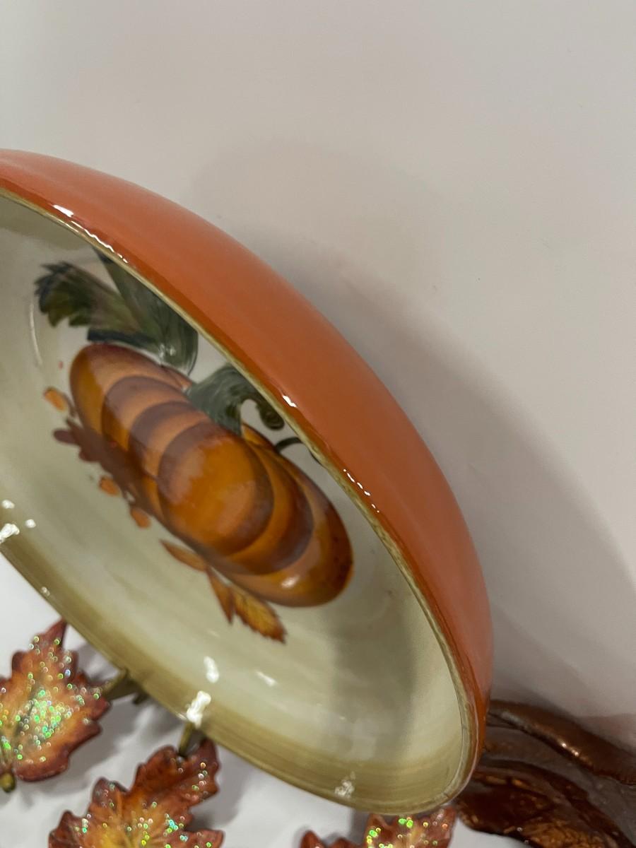 Lot of fall decor. Includes: large ceramic serving bowl with hand painted pumpkin design (12 1/2"), 7 small ceramic leaves, reverse painted leaf plate and small fabric pumpkin.