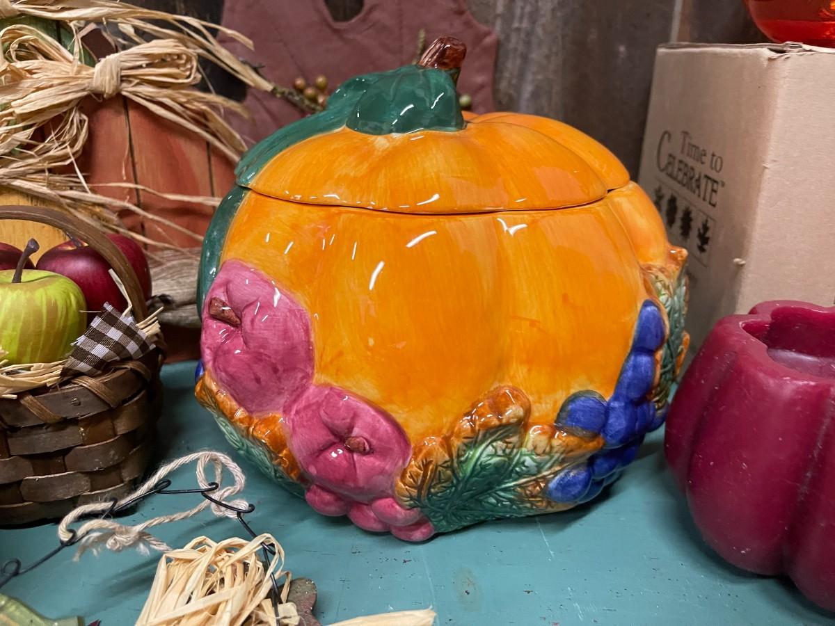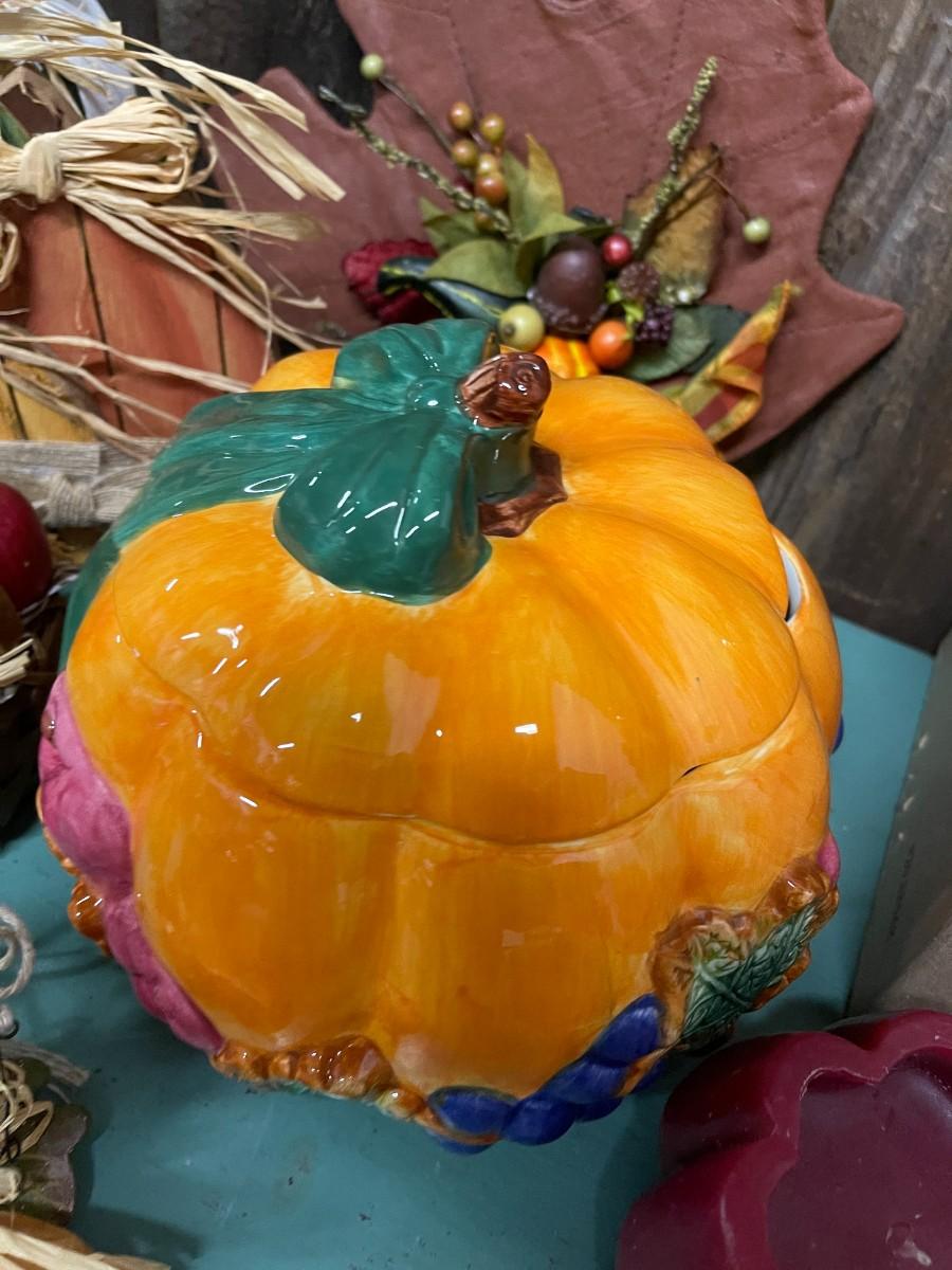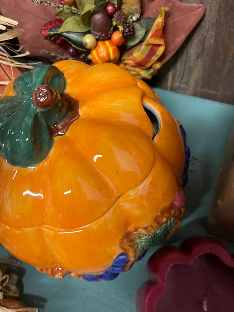 Lot of fall decor, includes medium sized tureen from Cracker Barrel and glass Celebrations candle holder with glitter witch.