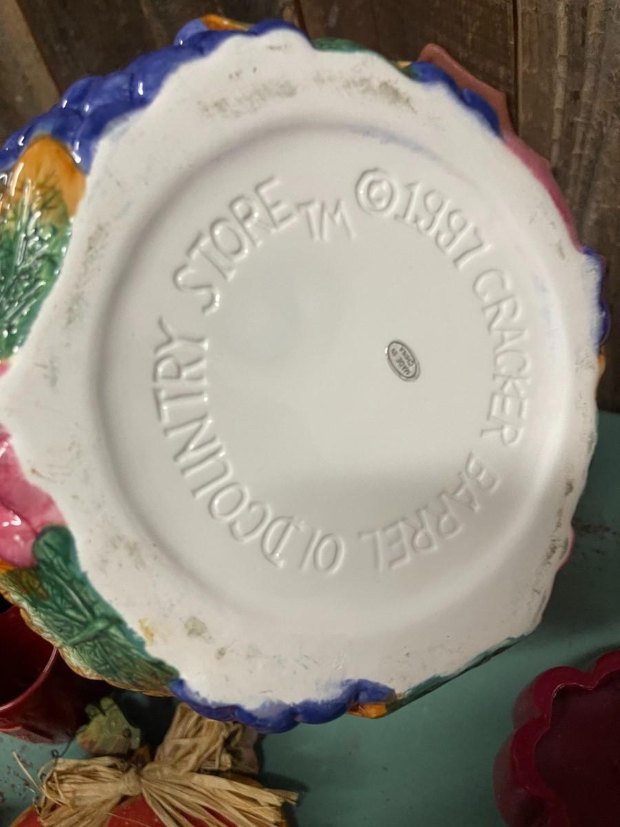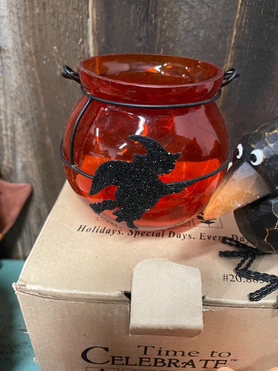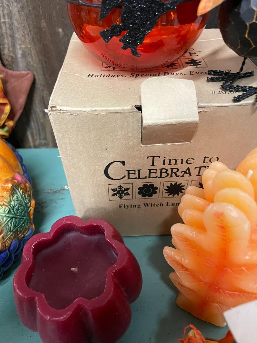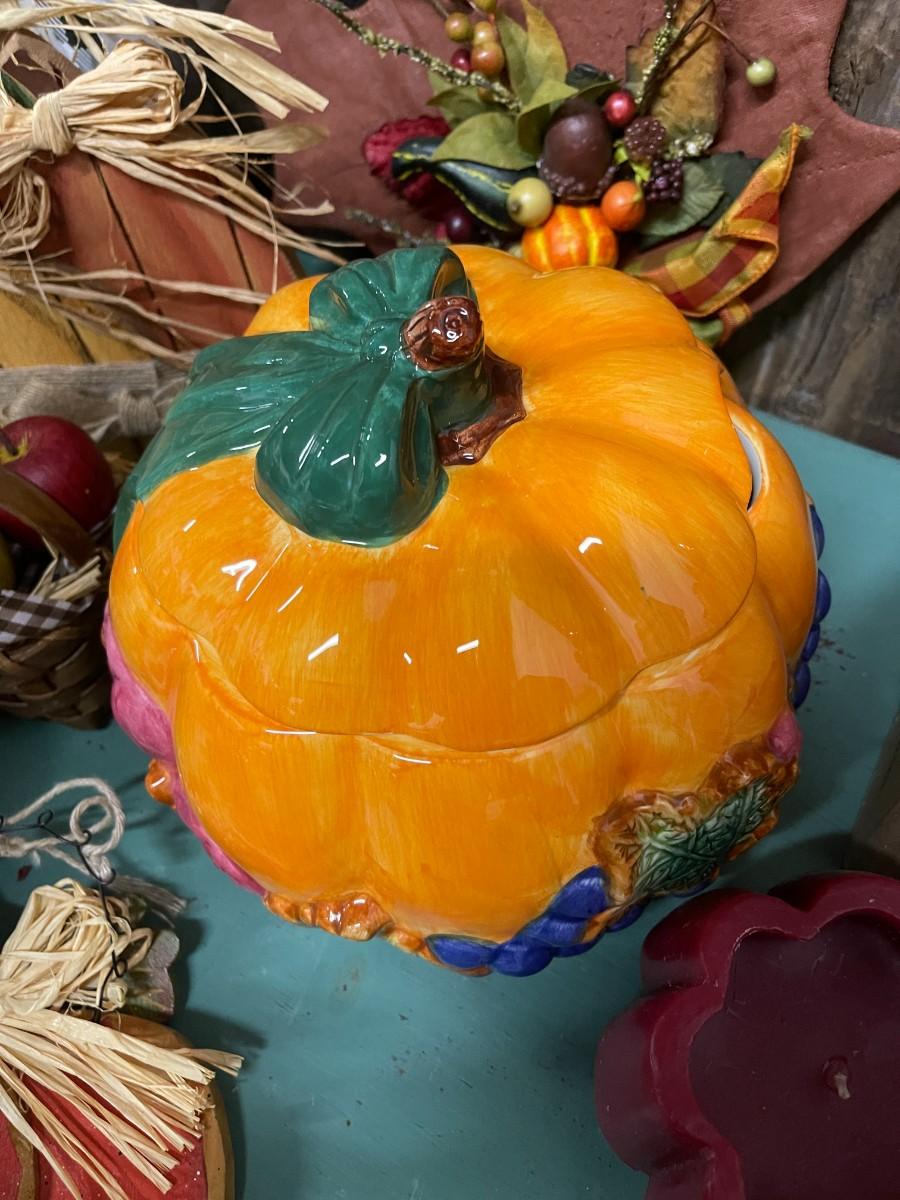 Lot of fall decor, includes medium sized tureen from Cracker Barrel and glass Celebrations candle holder with glitter witch.
