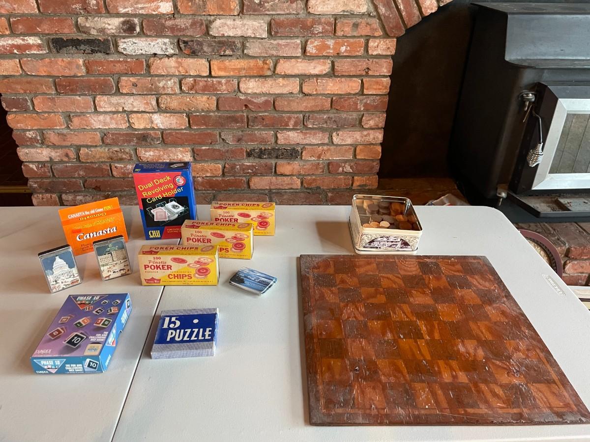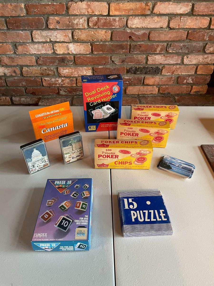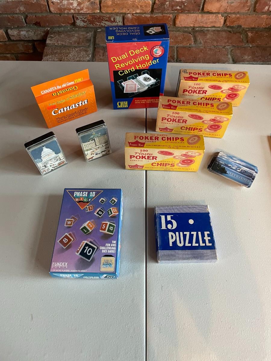 Includes Phase 10, Poker Chips, Canasta, Full deck Cards, Chess and accessories. Board: 18 x 18.