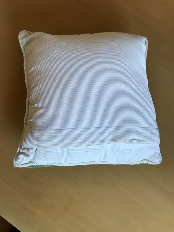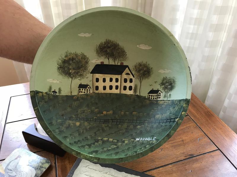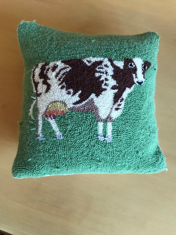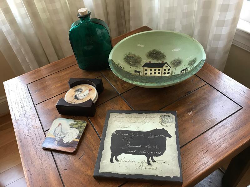 Lot includes a green glass embossed bottle, cow themed hooked 15" accent pillow, sheep themed wall plaque, two pairs of chicken coasters, and a farm scene hand painted wood bowl.