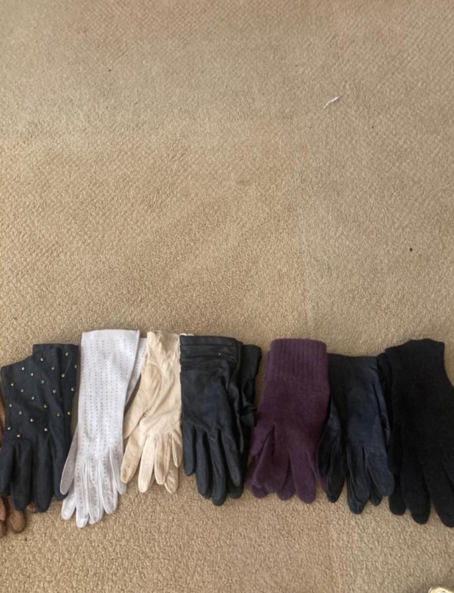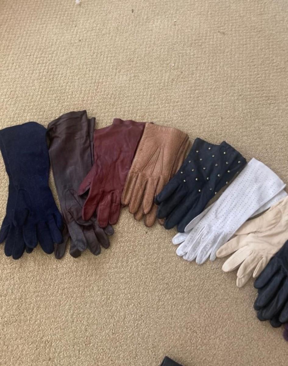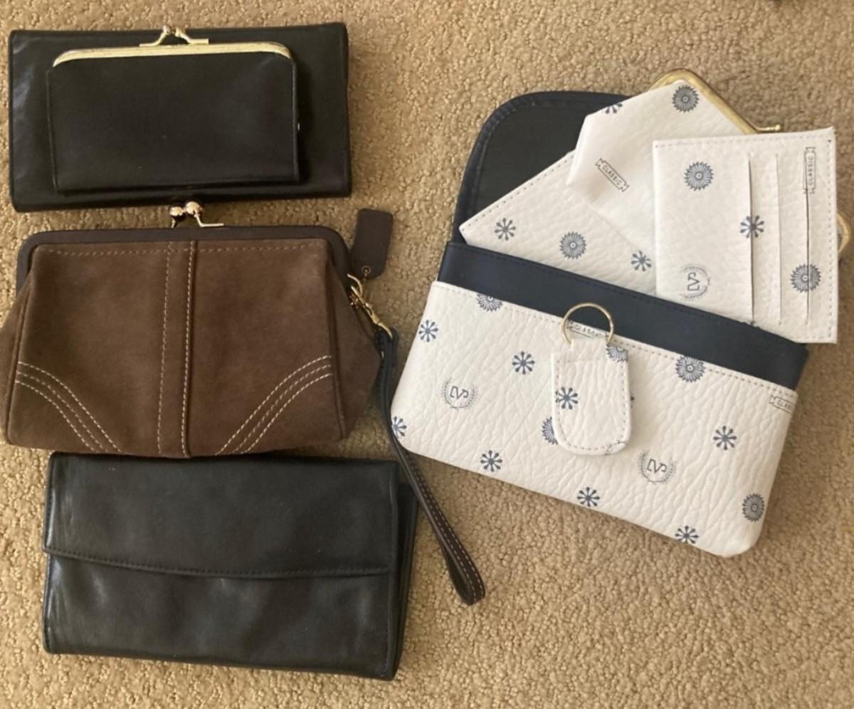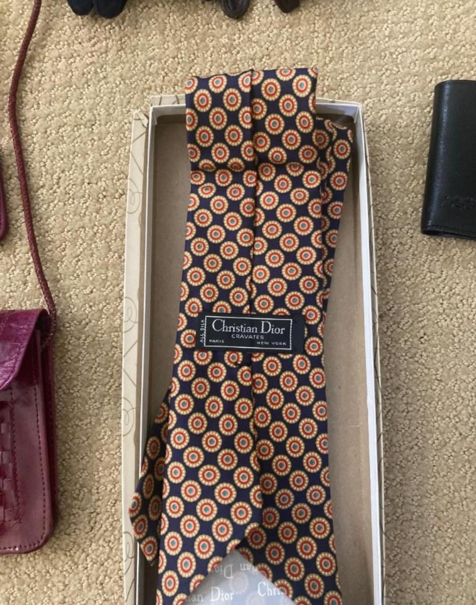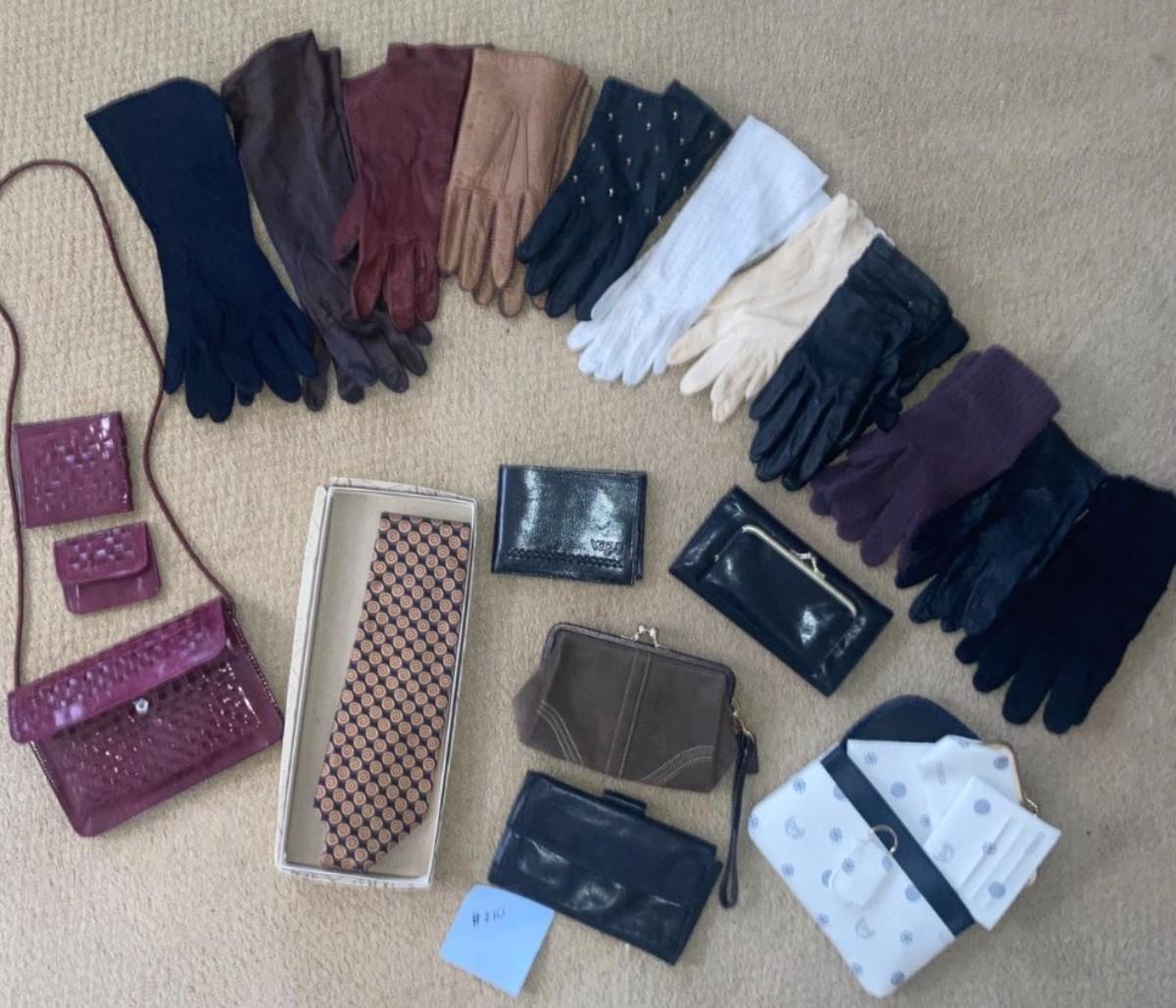Lot of fashion accessories including a vintage silk Christian Dior tie, grouping of wallets and coin purses, and multiple ladies gloves.