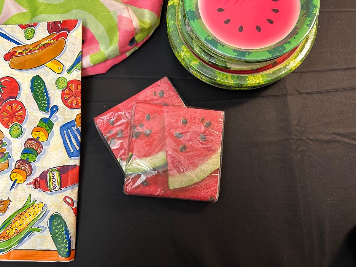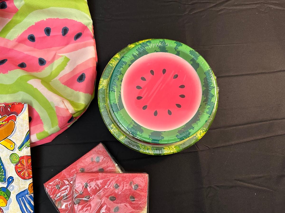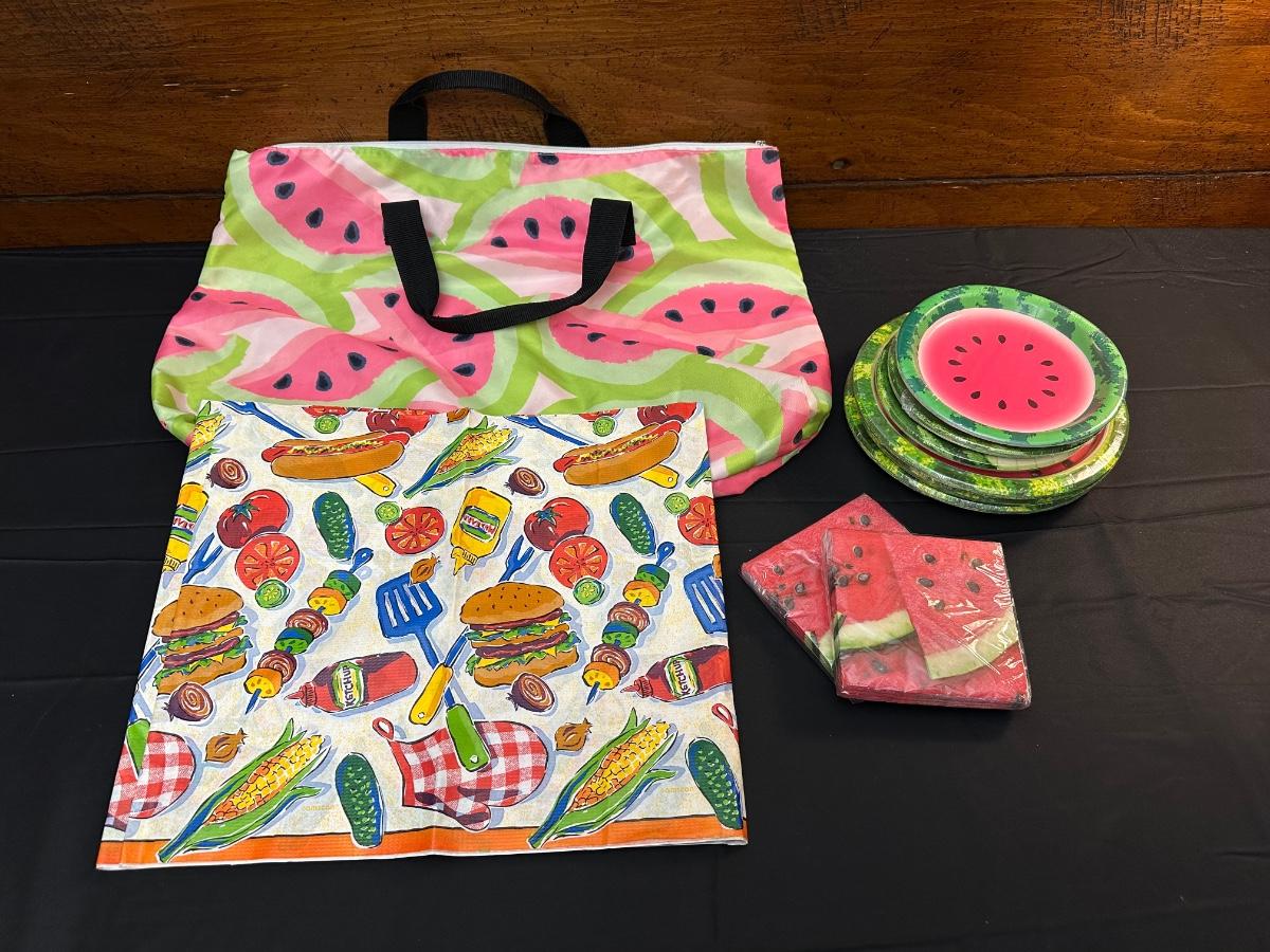 Perfect for dining outdoors — also includes disposable vintage table cover, watermelon themed plates, napkins and bag.