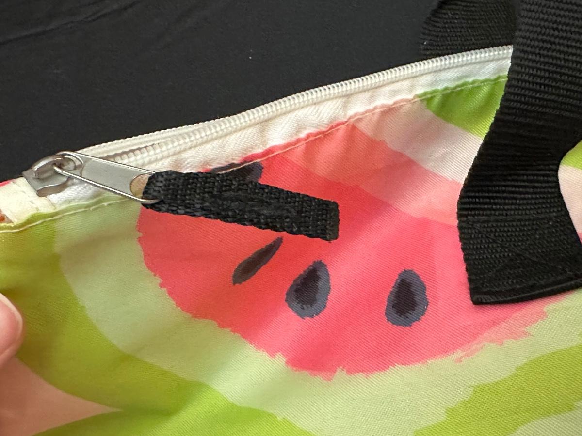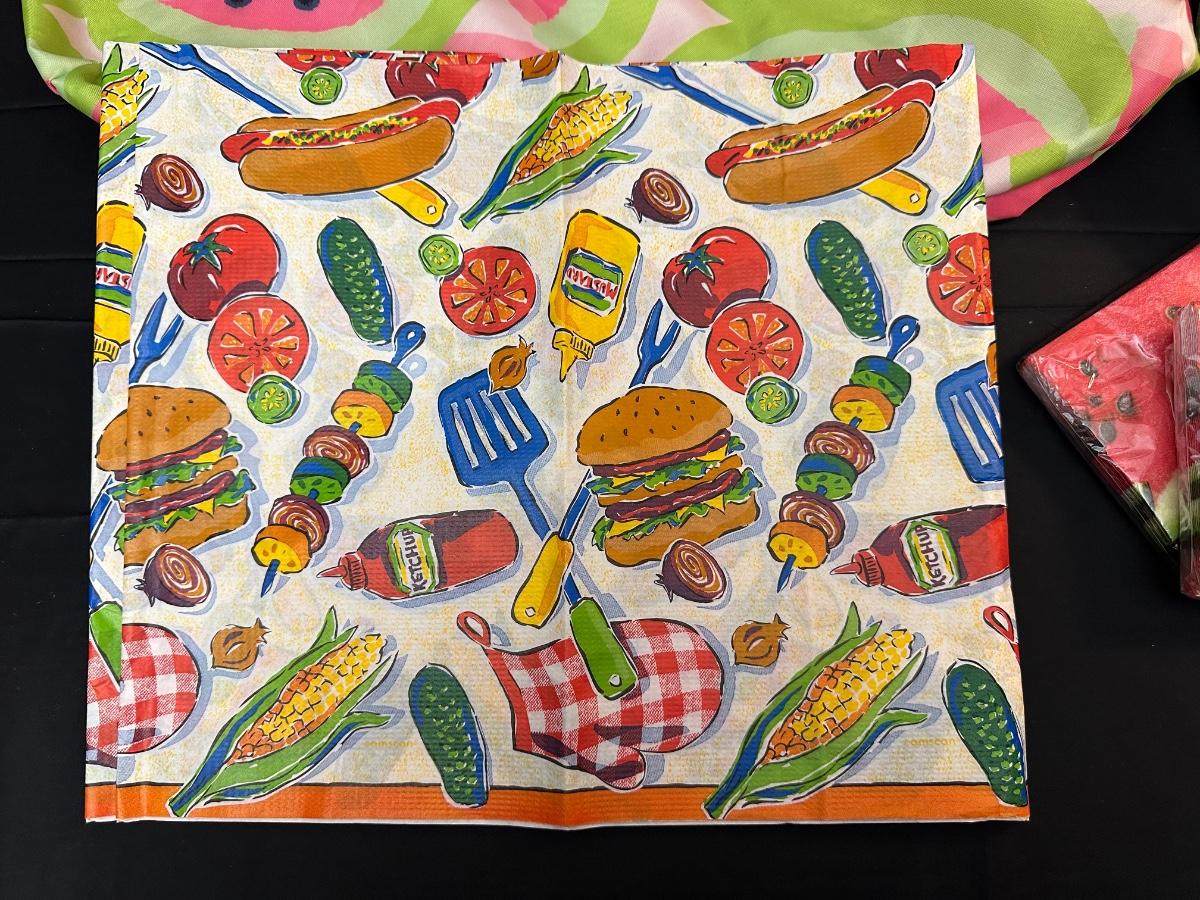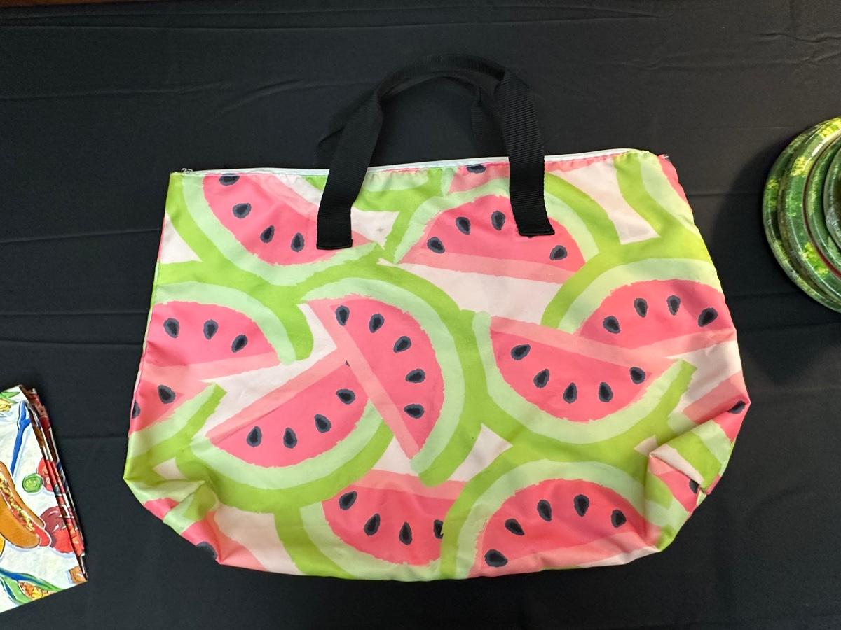 Perfect for dining outdoors — also includes disposable vintage table cover, watermelon themed plates, napkins and bag.